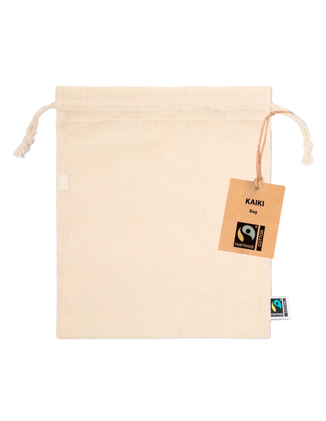 Bolsa de línea nature, fabricada en 100% algodón de 105g/m2 de color natural. Con certificación Fairtrade (Comercio Justo) un sistema comercial solidario y alternativo al convencional que persigue el desarrollo de los pueblos y la lucha contra la pobreza. De acabado cosido, con cordón de autocierre. Incluida etiqueta Fairtrade y etiqueta con logotipo en cartón reciclado.