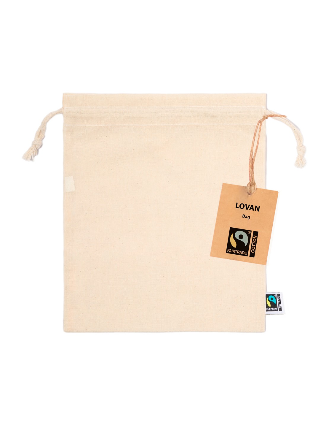 Bolsa de línea nature, fabricada en 100% algodón de 105g/m2 de color natural. Con certificación Fairtrade (Comercio Justo) un sistema comercial solidario y alternativo al convencional que persigue el desarrollo de los pueblos y la lucha contra la pobreza. De acabado cosido, con cordón de autocierre. Incluida etiqueta Fairtrade y etiqueta con logotipo en cartón reciclado.