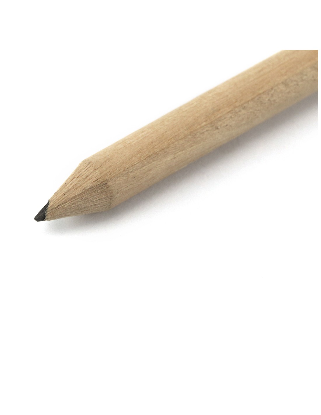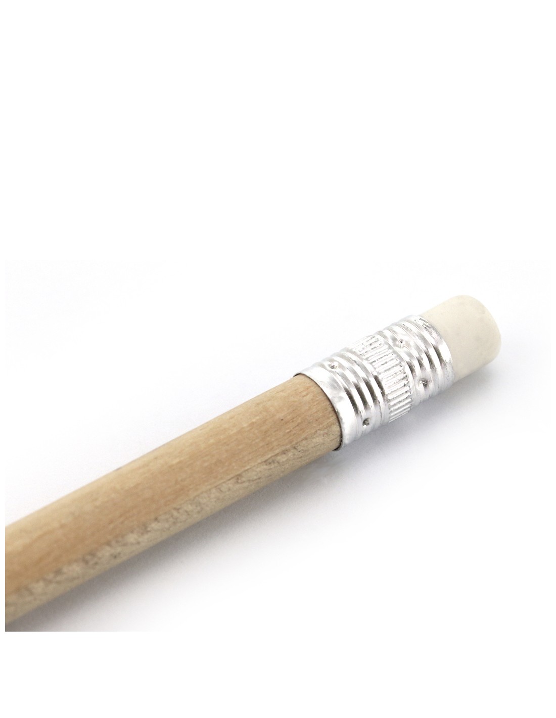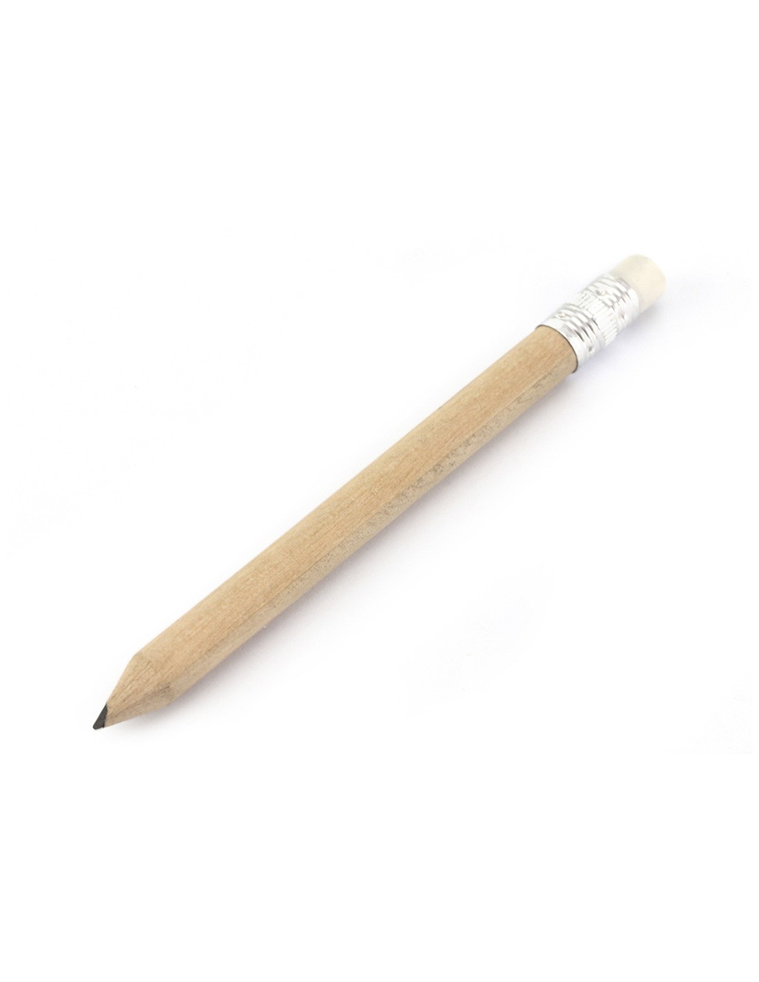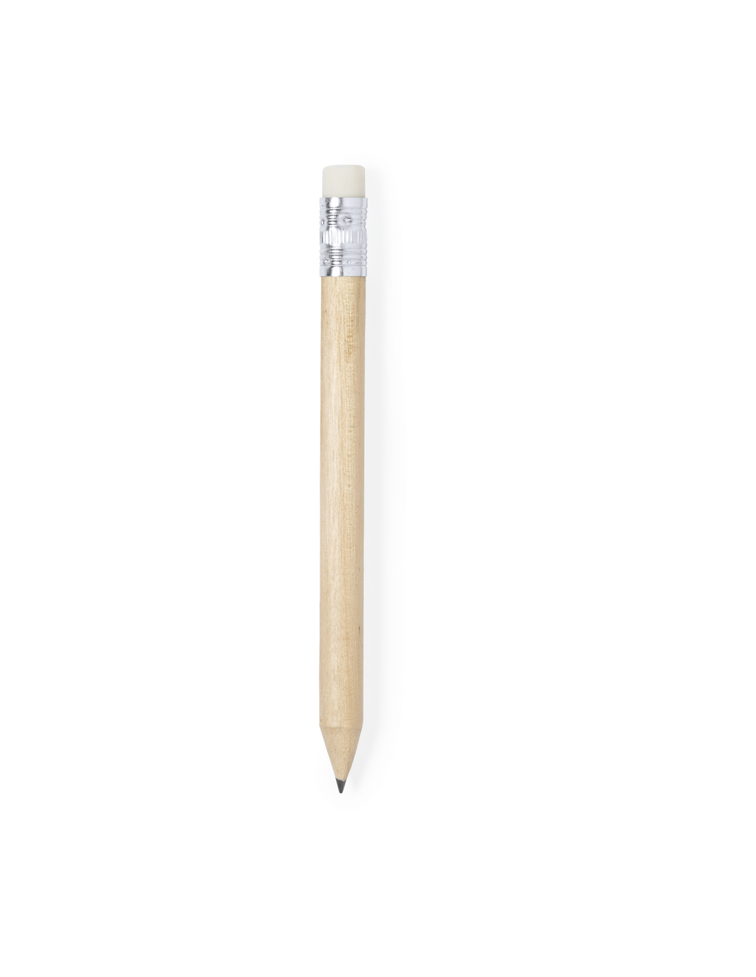 Minilápiz de madera de acabado natural. Con cuerpo redondo y goma de borrar en color blanco. Mina negra y punta afilada.