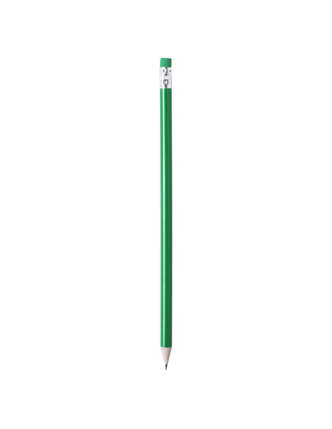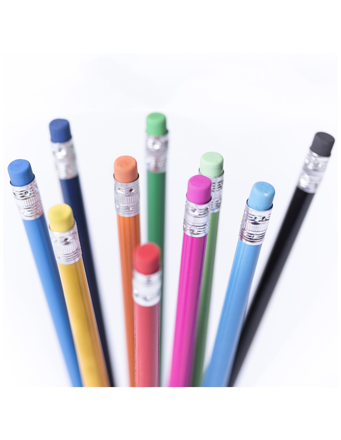 Lápiz de madera de acabado brillo. Con cuerpo redondo y goma de borrar a juego. Disponible en variada gama de colores. Mina negra y punta afilada.