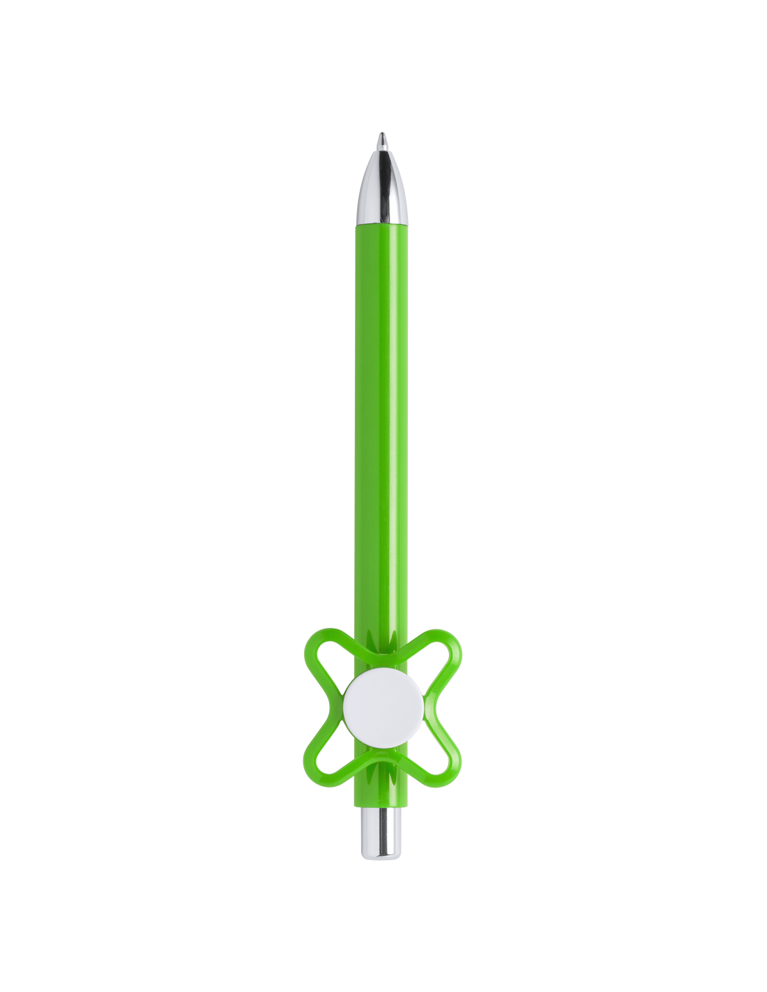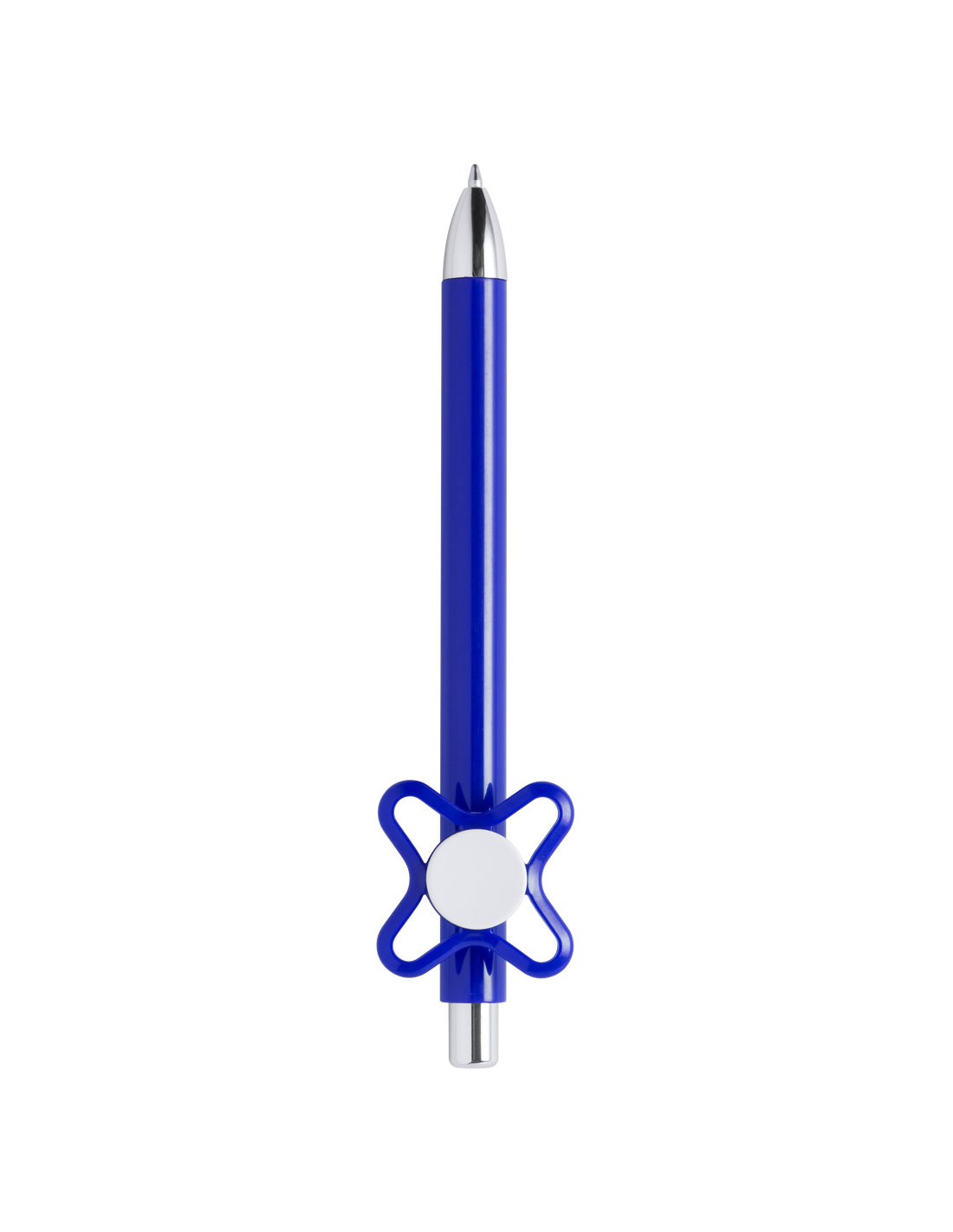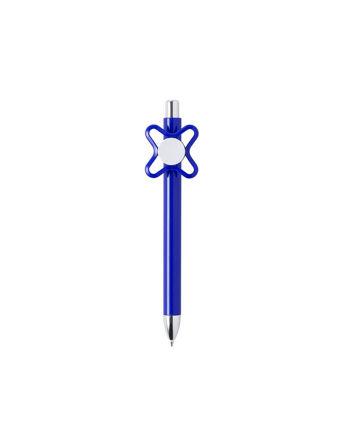 Original bolígrafo spinner antiestrés de mecanismo pulsador y divertido diseño con accesorios en color plateado y cuerpo de acabado sólido en colores brillantes. Especialmente diseñado para tampografía en clip y en cuerpo. De cartucho jumbo y en tinta azul.