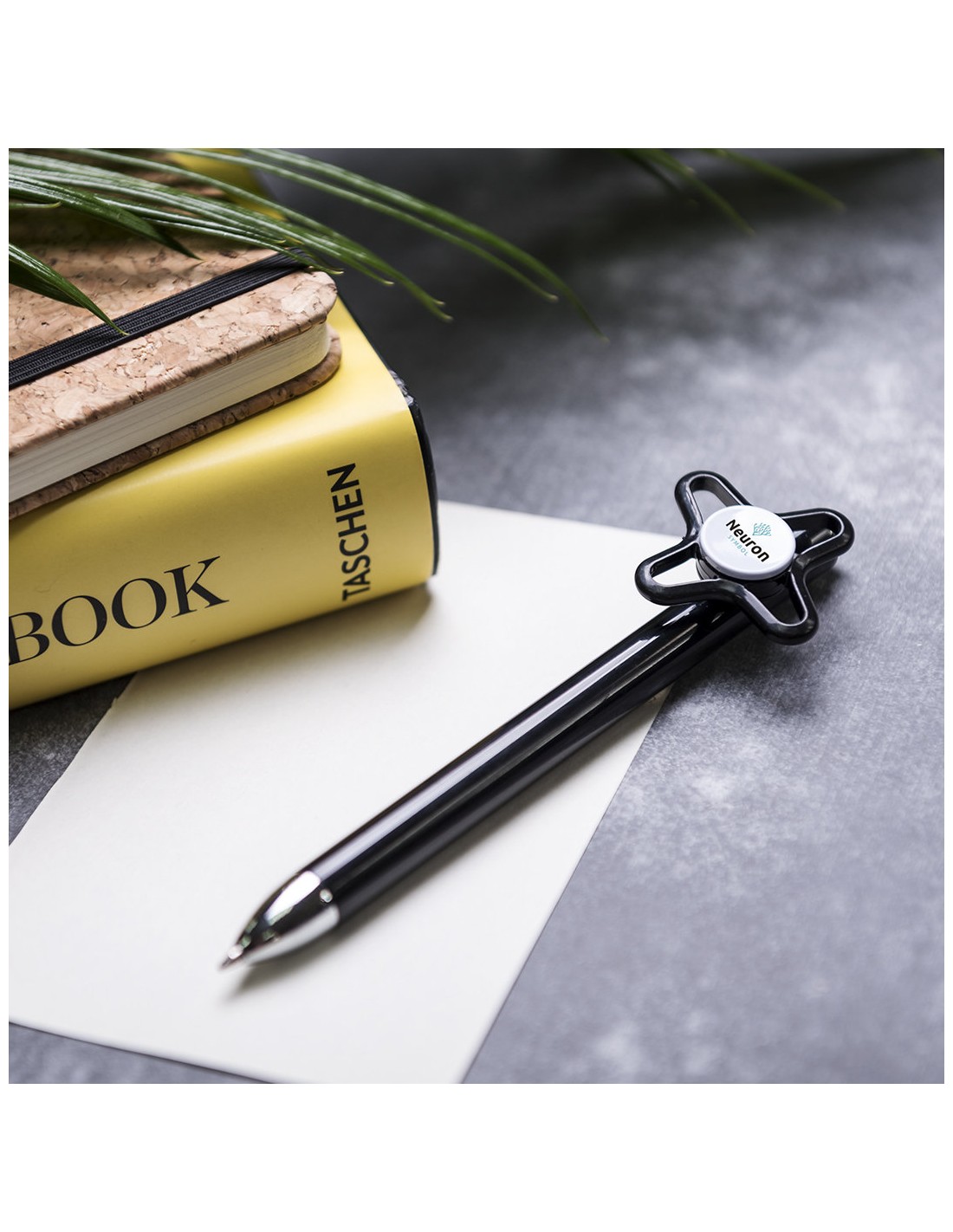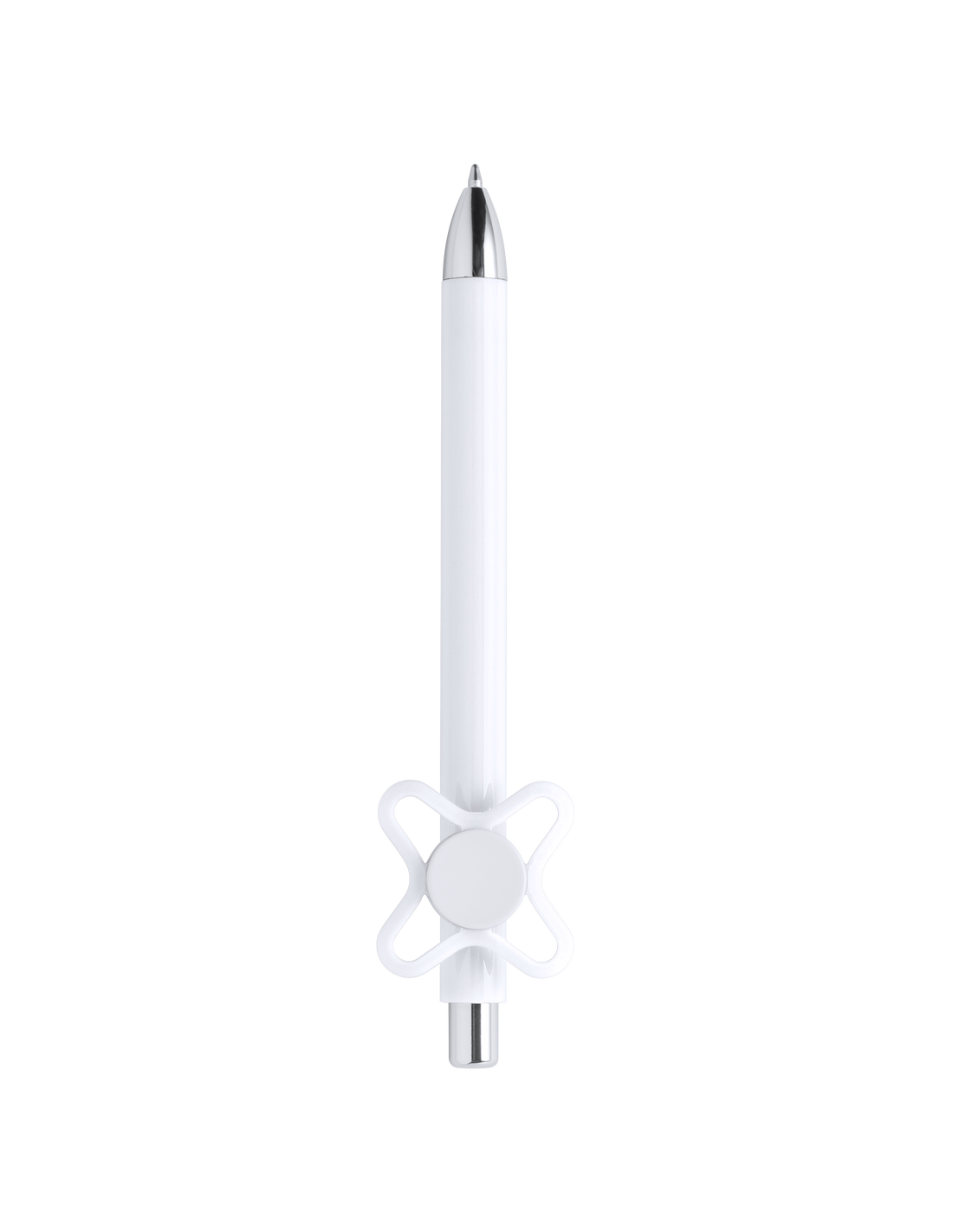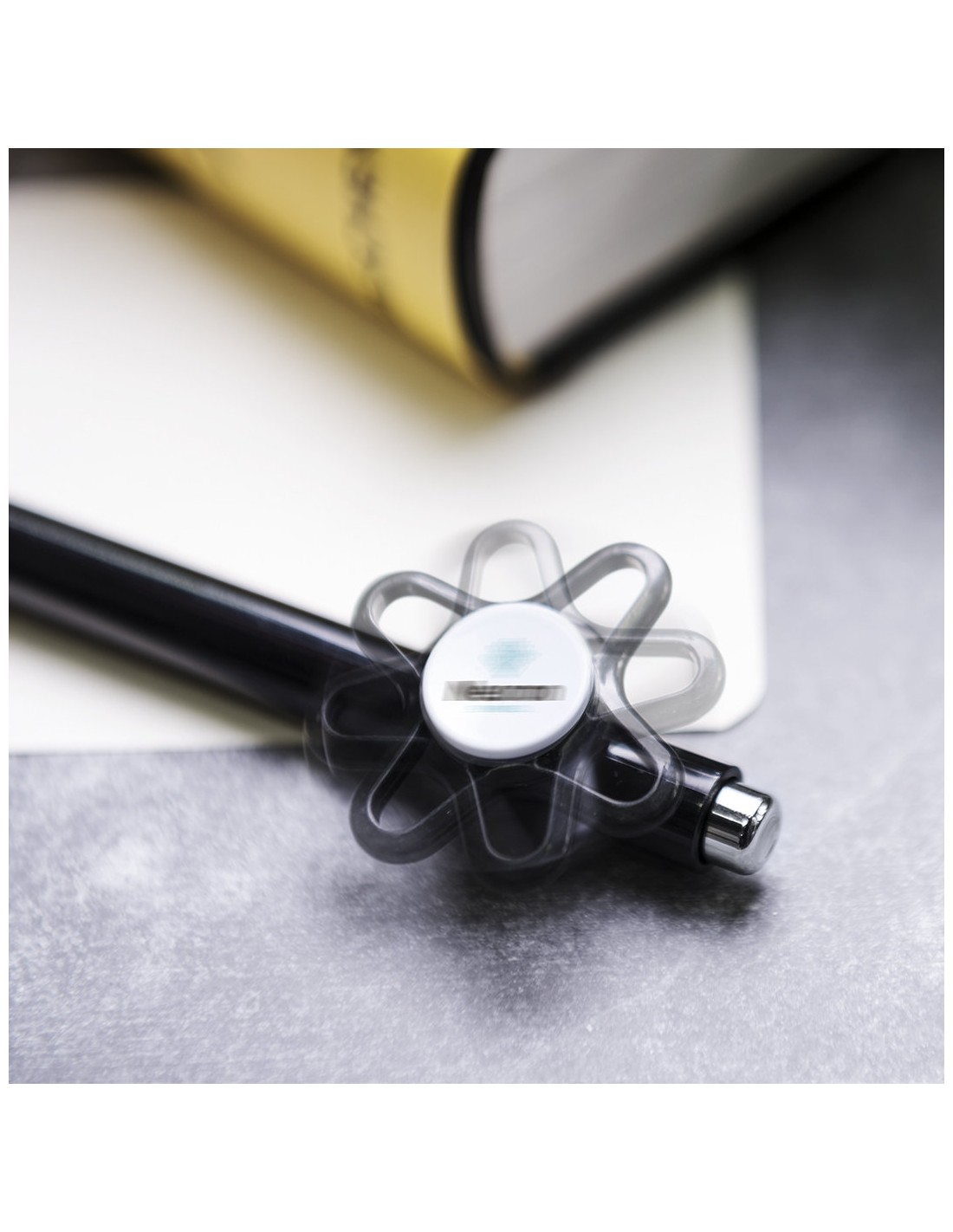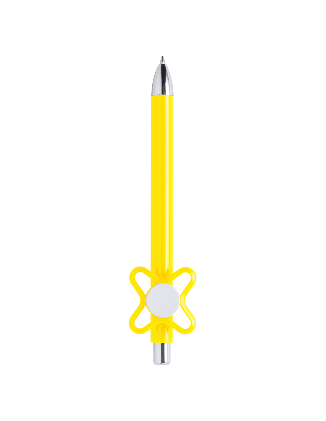 Original bolígrafo spinner antiestrés de mecanismo pulsador y divertido diseño con accesorios en color plateado y cuerpo de acabado sólido en colores brillantes. Especialmente diseñado para tampografía en clip y en cuerpo. De cartucho jumbo y en tinta azul.