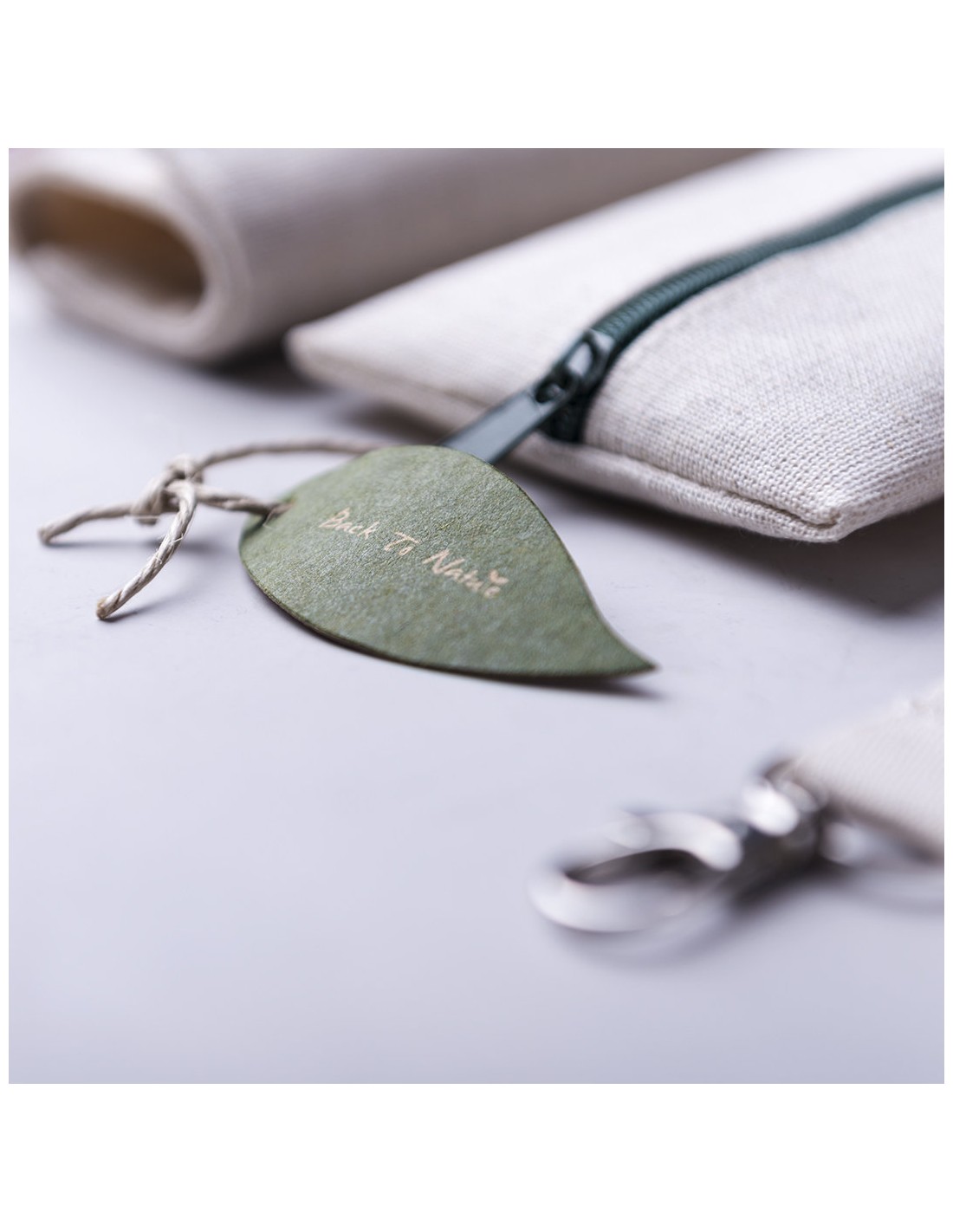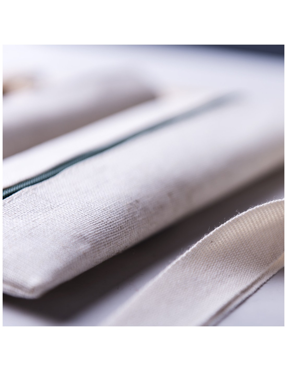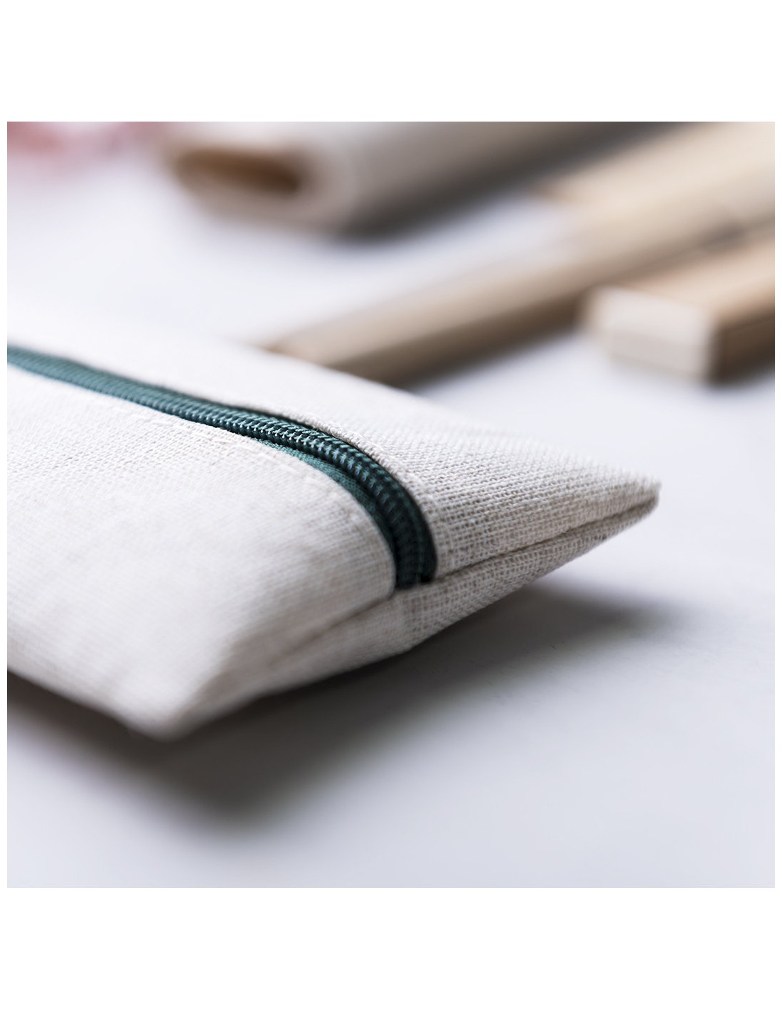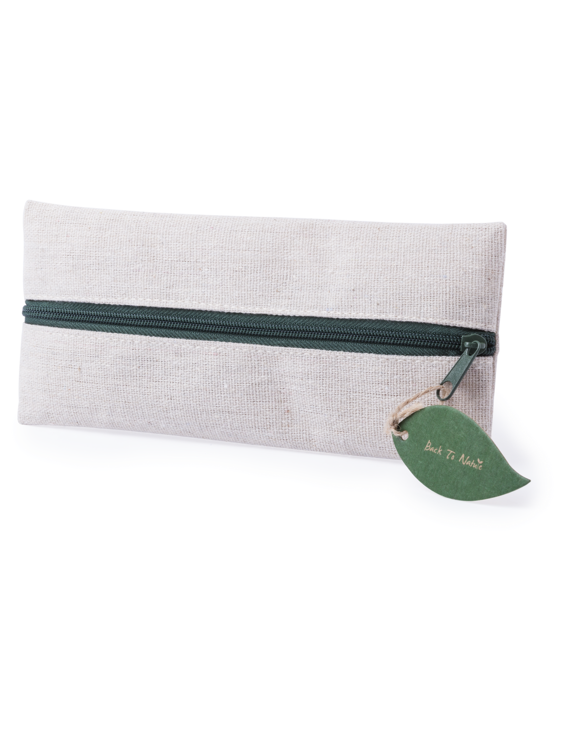 Práctico estuche de línea nature. De tamaño compacto en combinación de materiales yute y algodón. Con cierre de cremallera y hojita para publicidad en tirador.