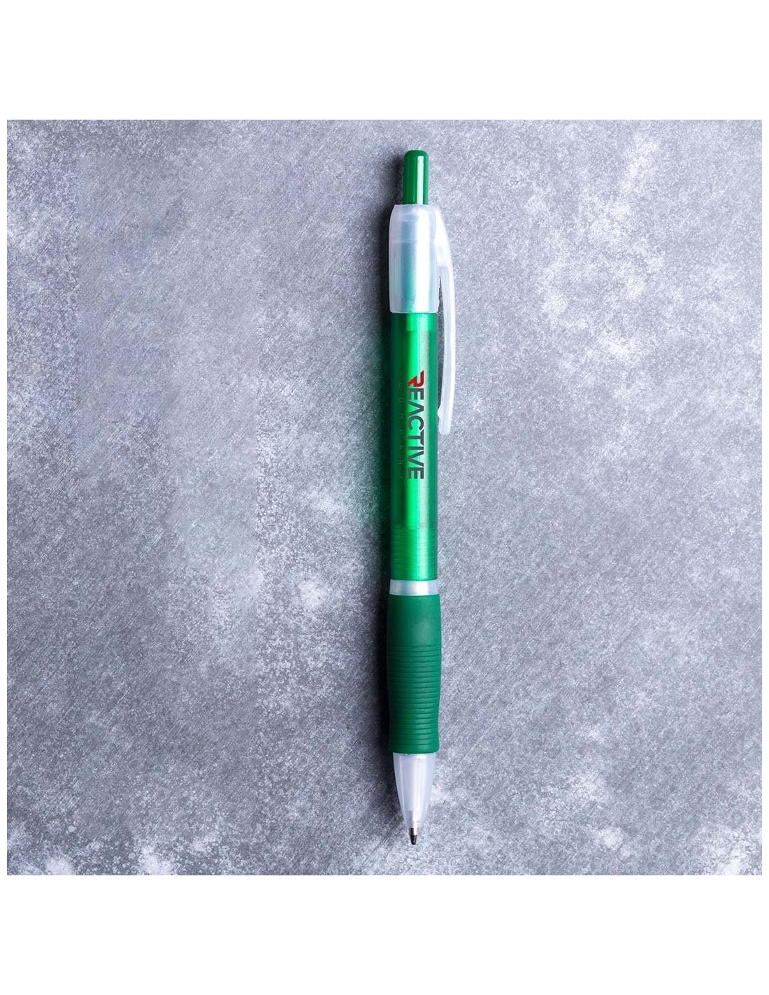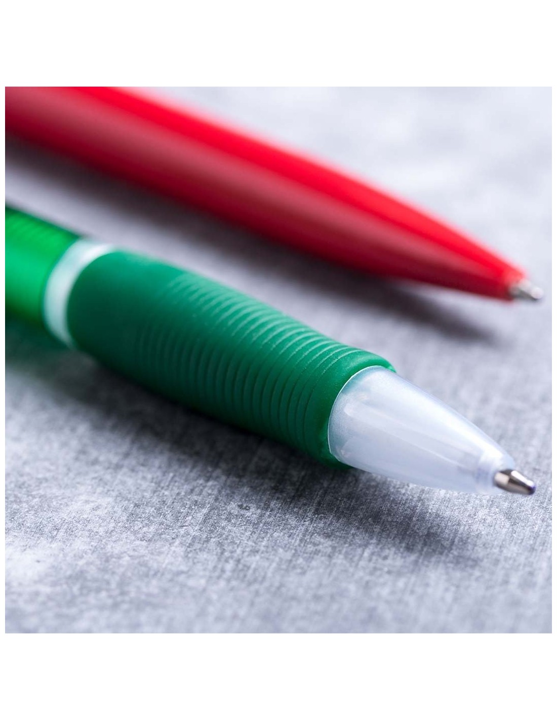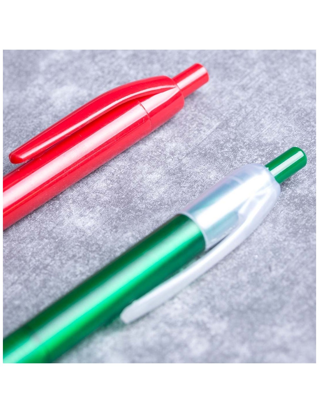 Bolígrafo fabricado en resistente ABS con mecanismo pulsador. Original diseño bicolor de llamativos y variados colores frosted en un suave acabado, con cómoda empuñadura a juego. Tinta azul.