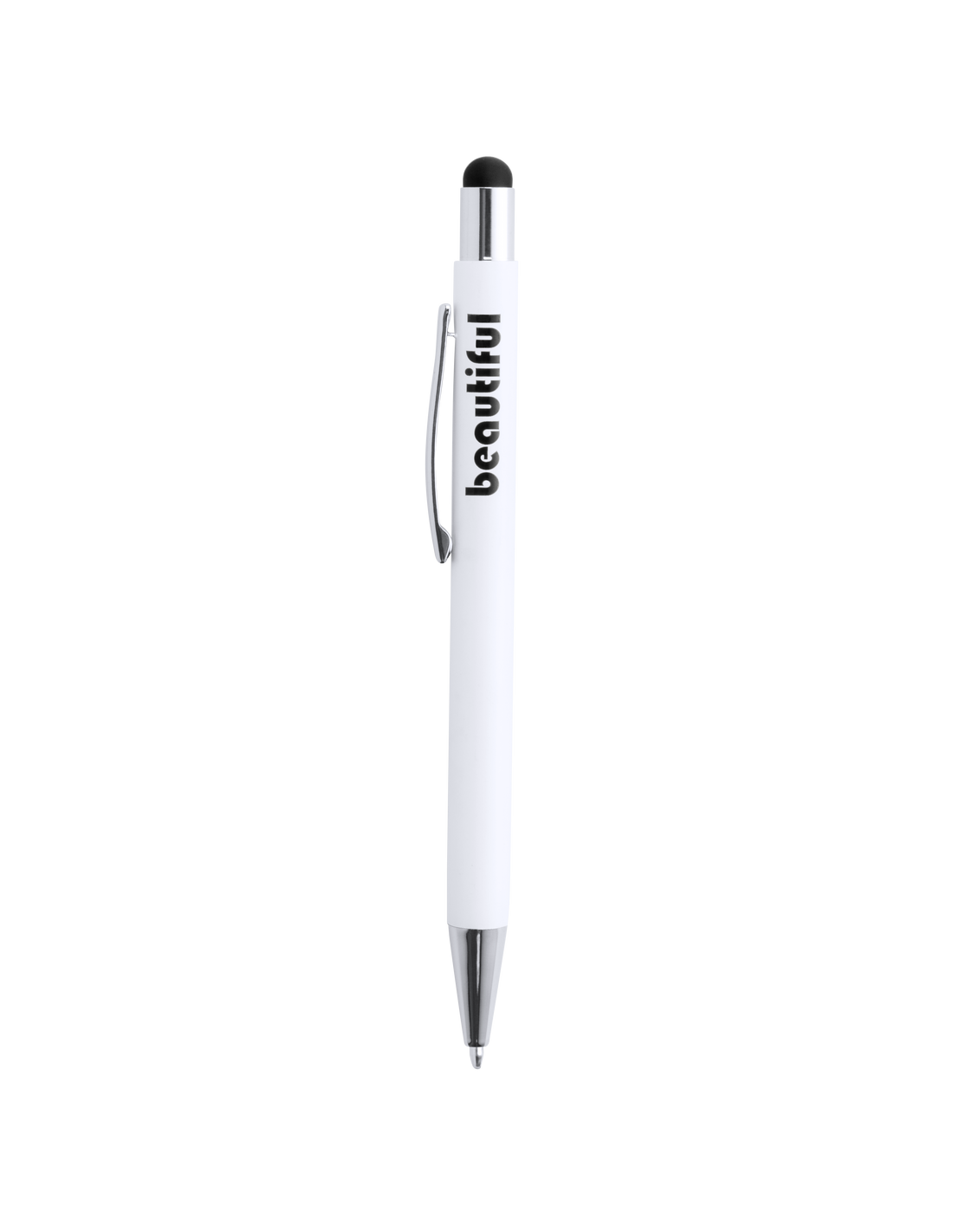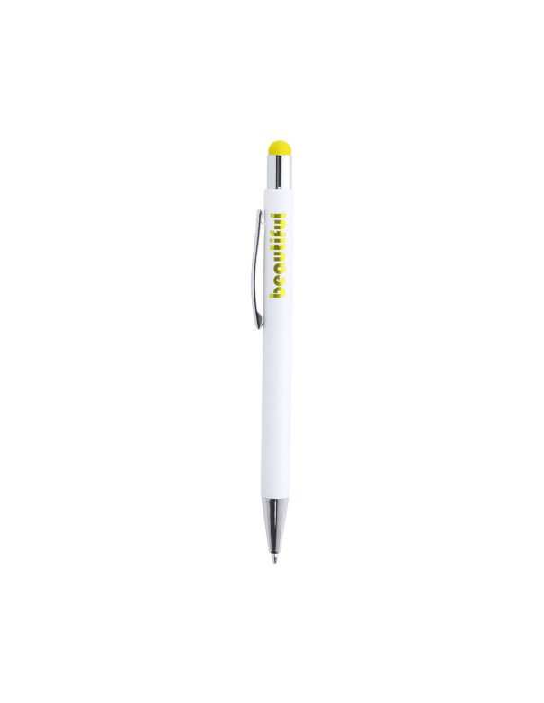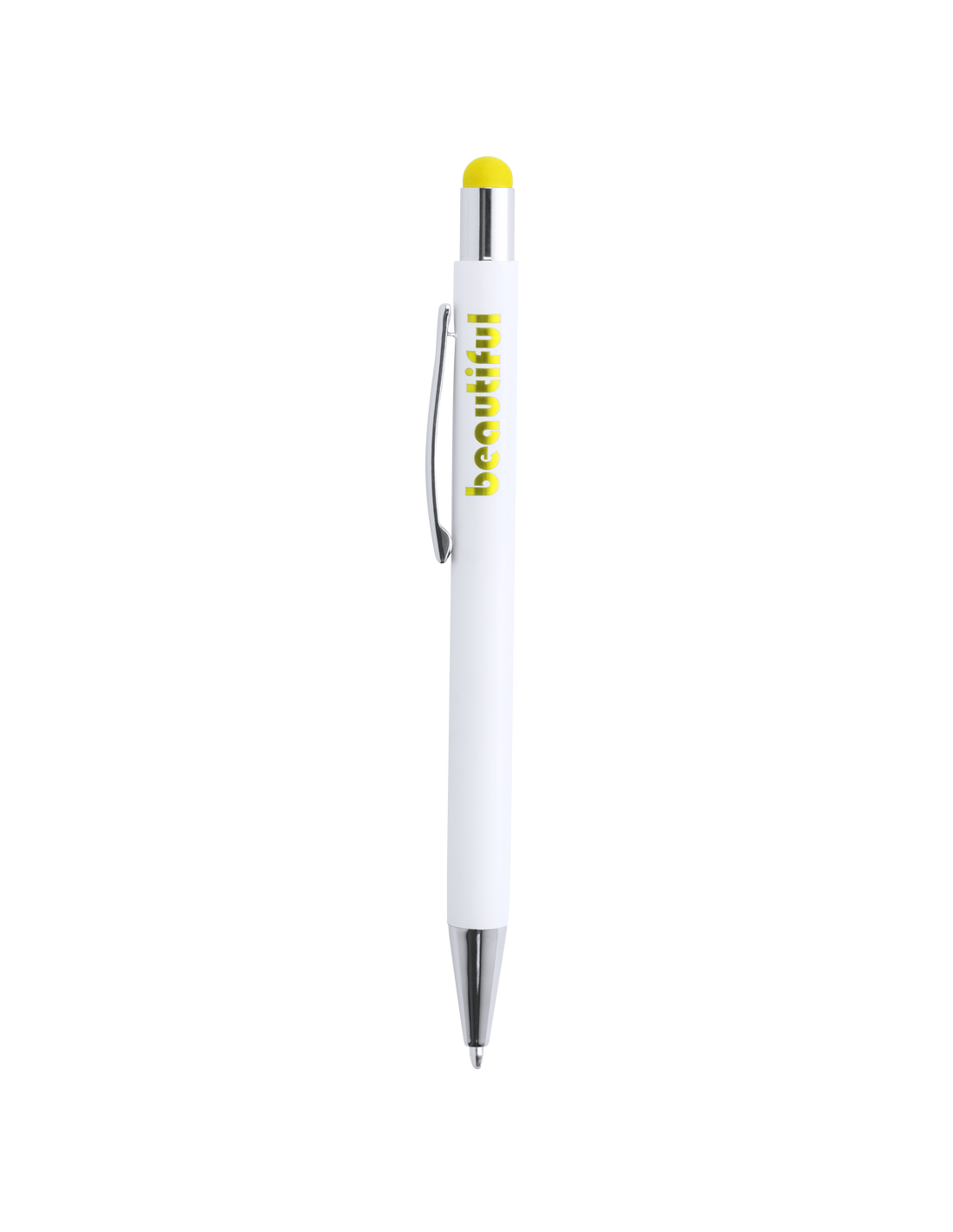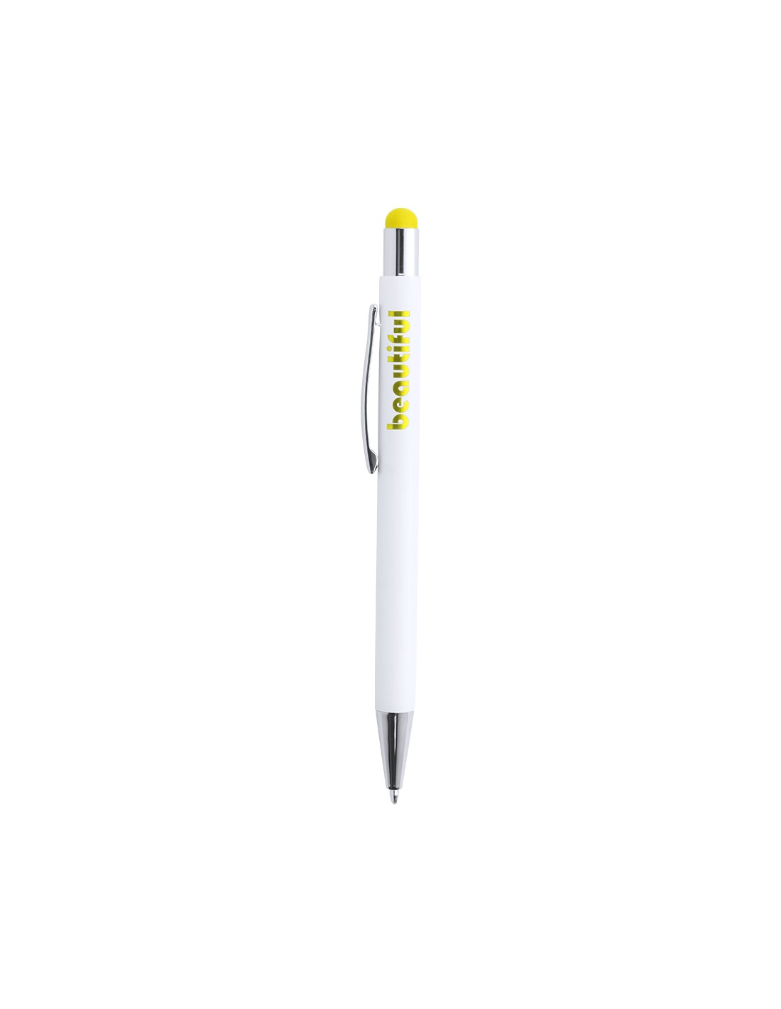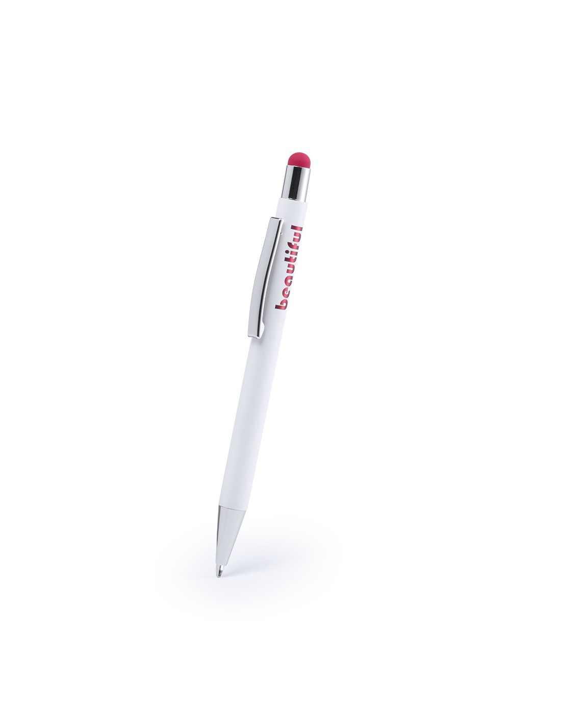 Bolígrafo puntero de mecanismo pulsador con cuerpo de aluminio en elegante color blanco mate. Puntero en variada gama de colores, a juego con el color del interior y con detalles cromados. Recubrimiento exterior especialmente diseñado para marcaje en láser, con el que conseguirá que su publicidad o marca quede perfectamente grabada en color a juego con el del interior. Con cartucho jumbo y tinta azul.