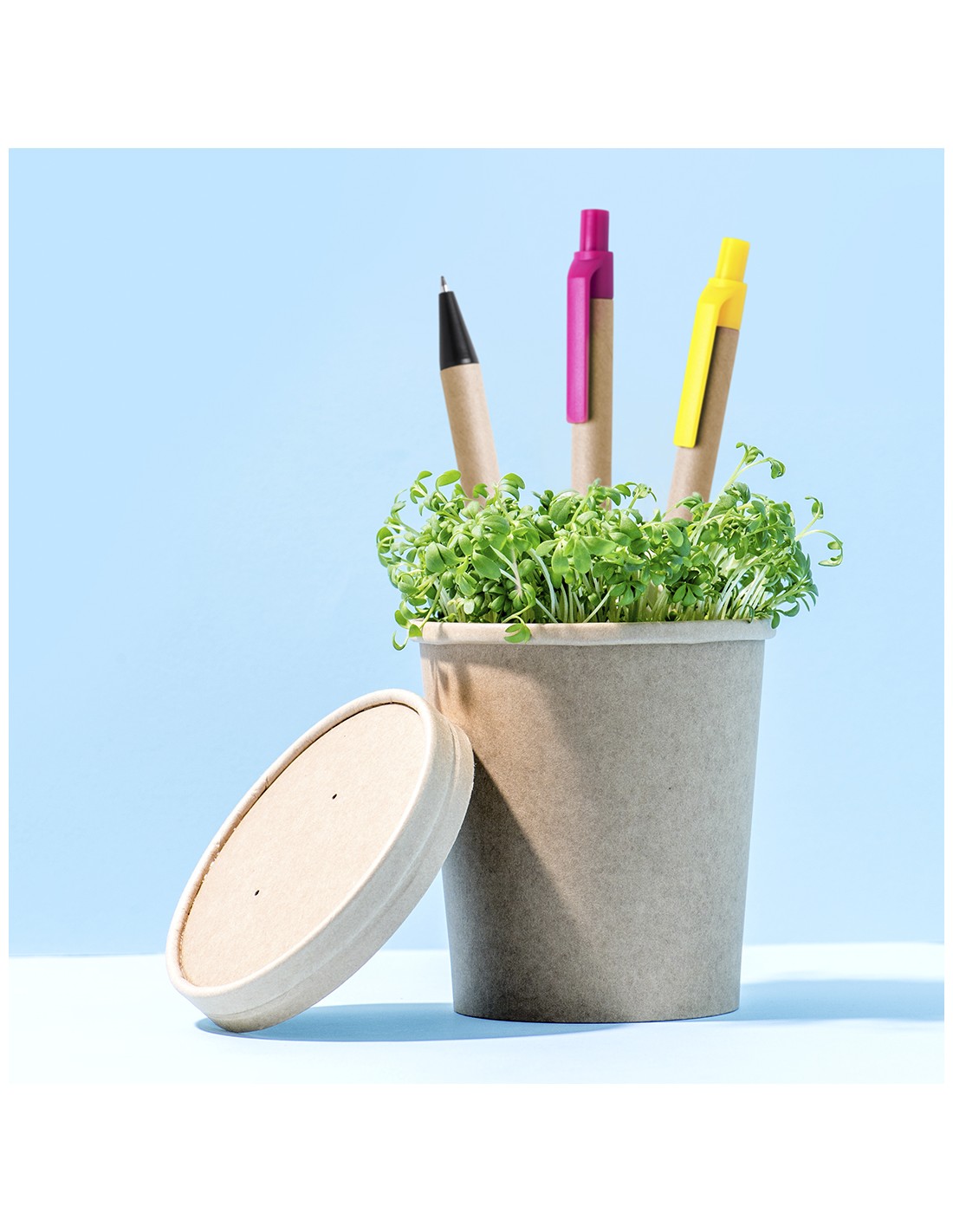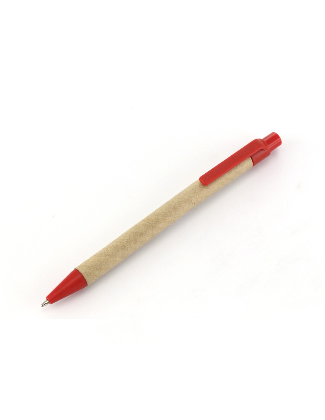 Bolígrafo de mecanismo pulsador en original combinación de cuerpo en cartón reciclado de color natural y accesorios en vivos colores. Tinta azul.