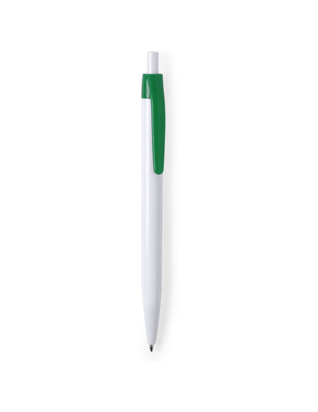 Bolígrafo de mecanismo pulsador en desenfadado diseño bicolor. Con cuerpo en color blanco y clip en variada gama de colores. Amplia superficie de impresión y en tinta azul.