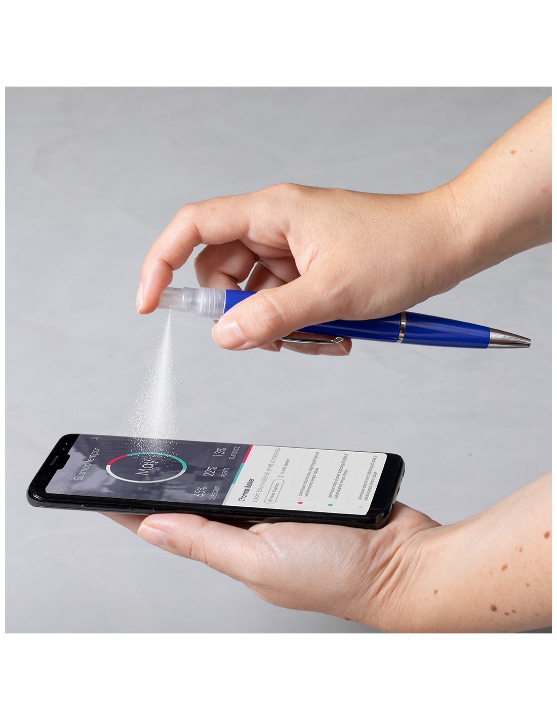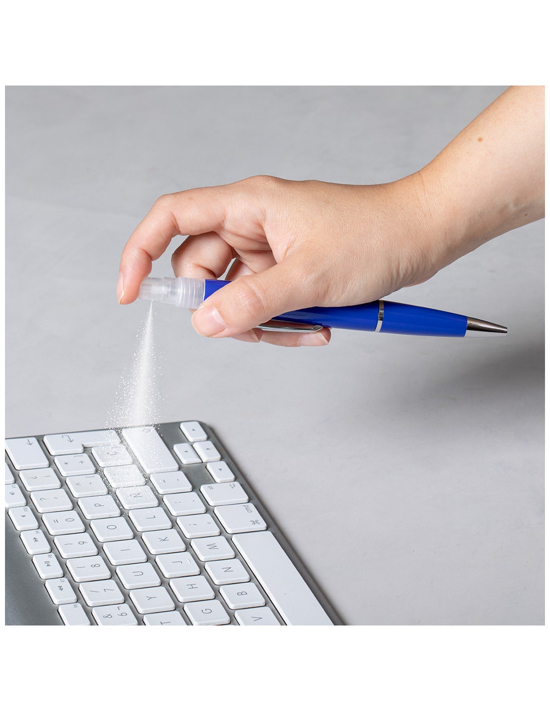 Bolígrafo higienizante con pulverizador recargable integrado y capucha protectora. Acabado en resistente ABS brillante con elegante clip metálico y cómoda empuñadura y escritura en tinta azul. Capacidad del pulverizador 3ml. Líquido no incluido. Disponible en amplia y variada gama de colores.