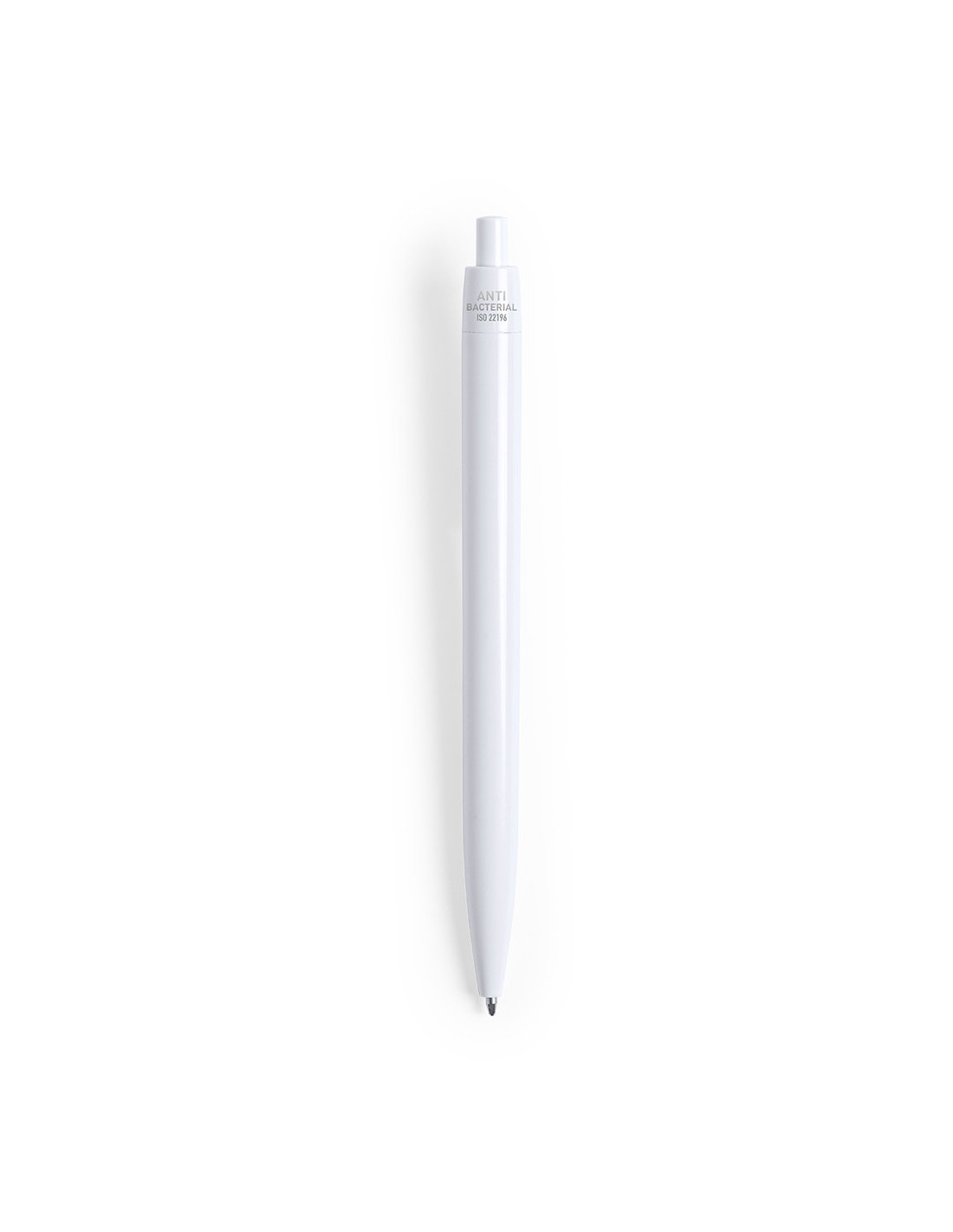 Bolígrafo antibacteriano de mecanismo pulsador. Diseño monocromático, en variada gama de colores con acabado brillante, especialmente diseñado para marcaje en tampografía. Tinta azul. Los productos con tratamientos antibacterianos son capaces de reducir drásticamente las cargas bacterianas presentes en las superficies de los materiales, gracias a la incorporación de agentes microbianos permanentes estáticos, con alta efectividad para inhibir y prevenir la contaminación bacteriana. Artículo de acuerdo al estándar ISO 22196, que determina la actividad antibacteriana en materiales plásticos y superficies no porosas, lo que permite conocer la efectividad de inhibición microbiana que tienen los aditivos sobre los objetos tratados mediante una evaluación cuantitativa.
