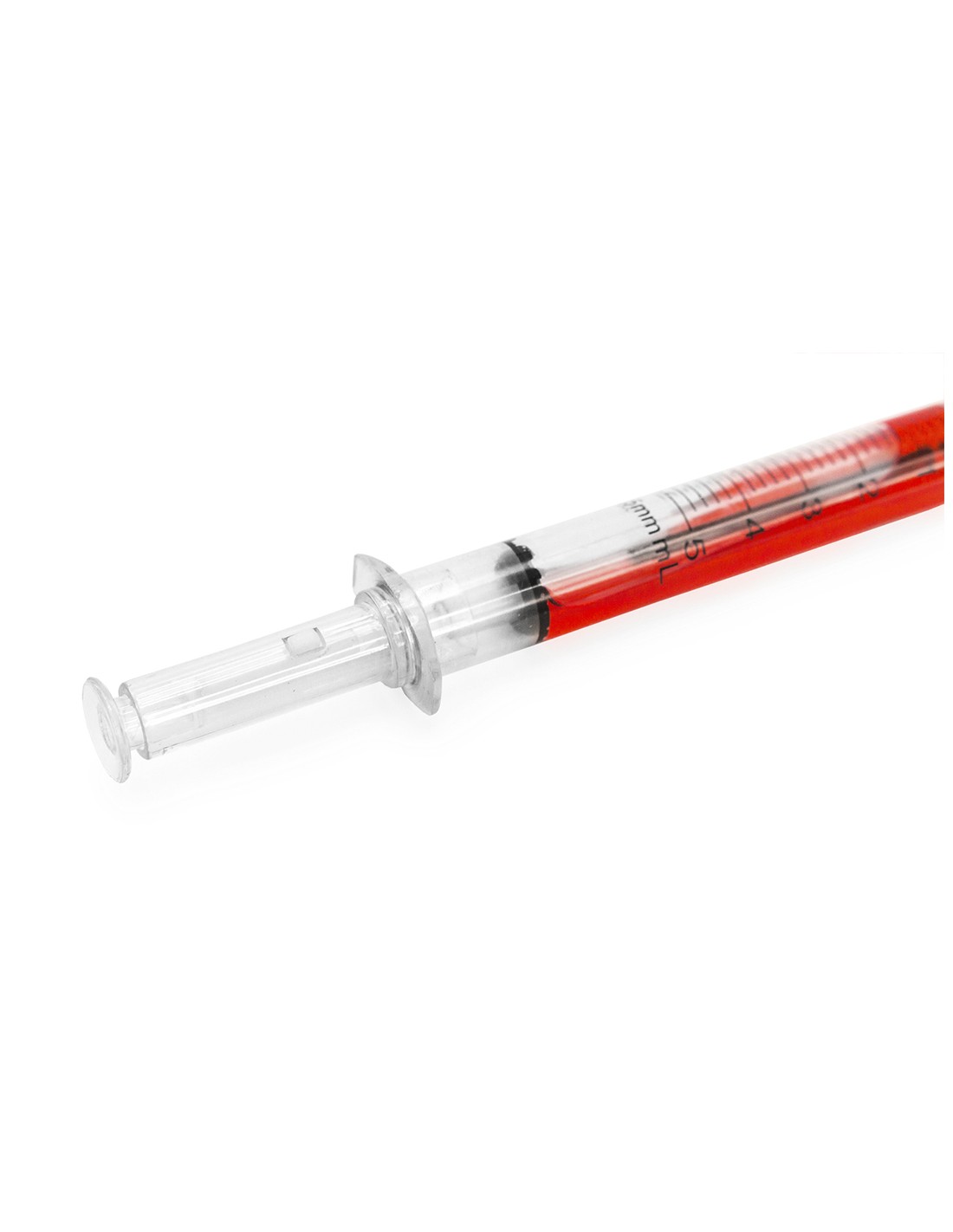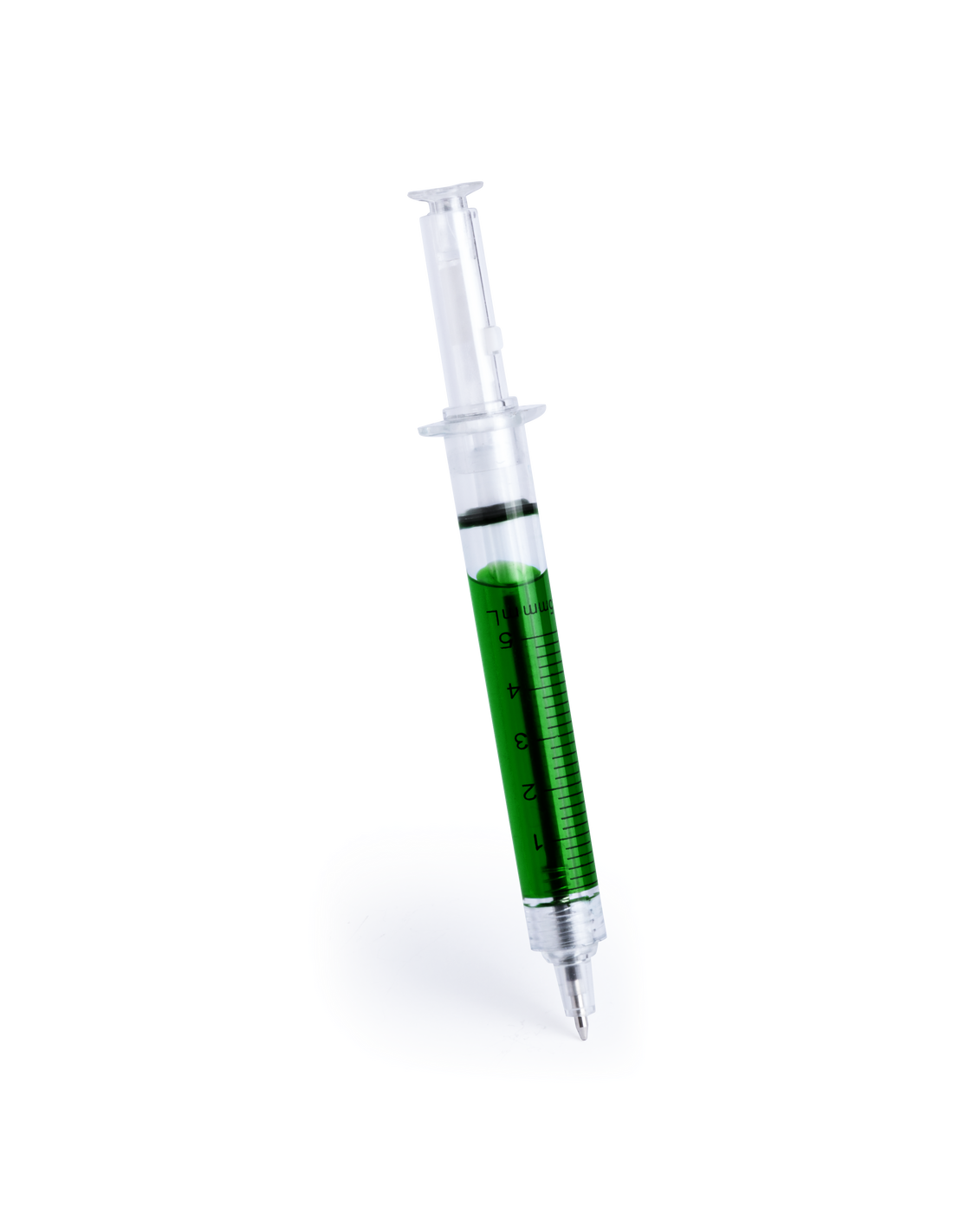 Original bolígrafo con diseño de jeringuilla y cuerpo transparente. Con líquido interior en vivos colores y de tinta azul.