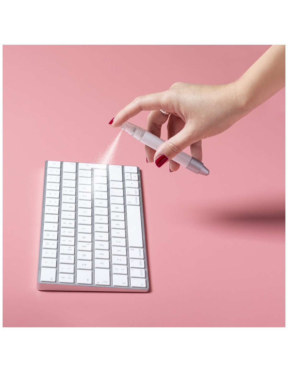 Bolígrafo antibacteriano con pulverizador recargable integrado y capucha protectora con puntero en color gris. Acabado liso en resistente ABS brillante con detalles cromados y escritura en tinta azul. Capacidad del pulverizador 3ml. Líquido no incluido.Los productos con tratamientos antibacterianos son capaces de reducir drásticamente las cargas bacterianas presentes en las superficies de los materiales, gracias a la incorporación de agentes microbianos permanentes estáticos, con alta efectividad para inhibir y prevenir la contaminación bacteriana.Artículo de acuerdo al estándar ISO 22196, que determina la actividad antibacteriana en materiales plásticos y superficies no porosas, lo que permite conocer la efectividad de inhibición microbiana que tienen los aditivos sobre los objetos tratados mediante una evaluación cuantitativa.