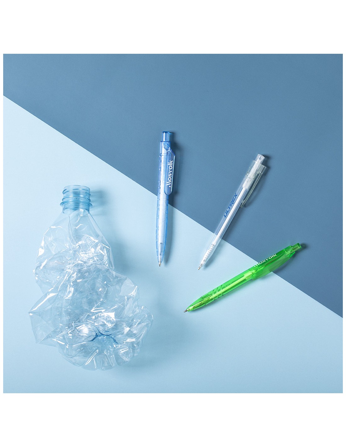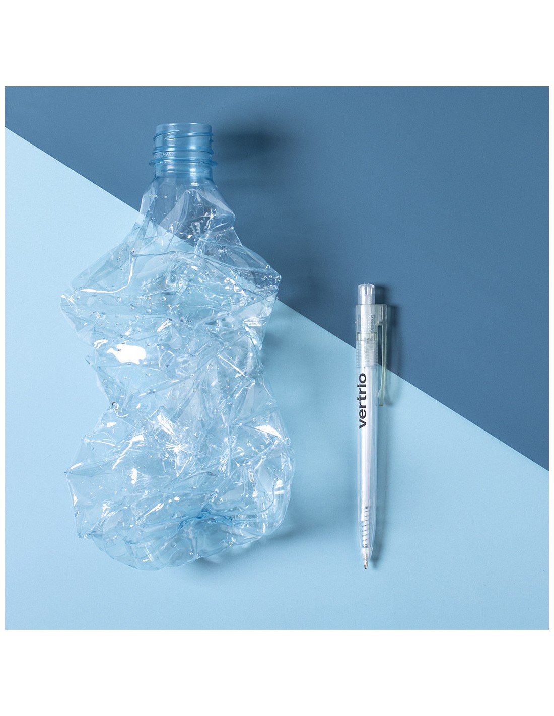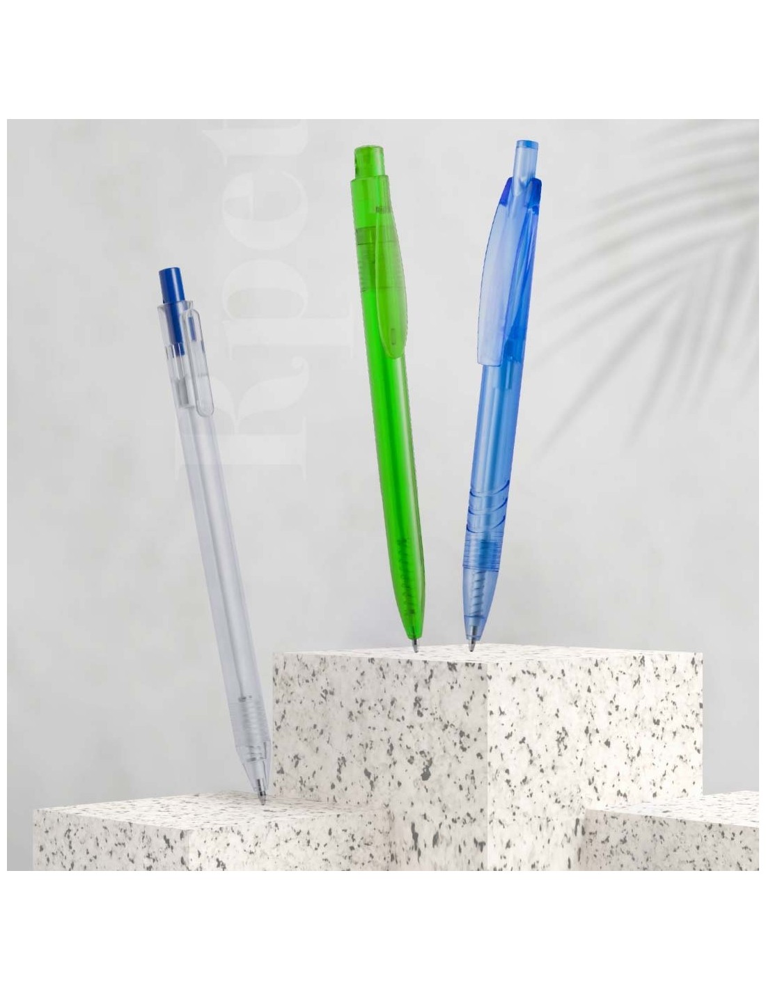 Bolígrafo de línea nature en material RPET, elaborado a partir de plástico reciclado para así fomentar la reutilización de residuos plásticos y ayudar a la sostenibilidad del planeta. De acabo translúcido y original clip, con distintivo RPET en el cuerpo del bolígrafo y disponible en variada gama de colores. Especialmente diseñado para marcaje en tampografía, de mecanismo pulsador y con tinta azul.