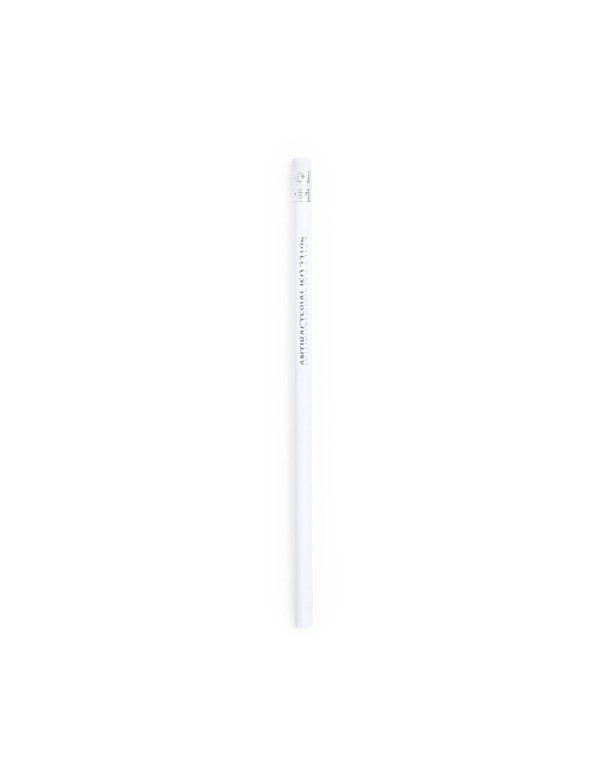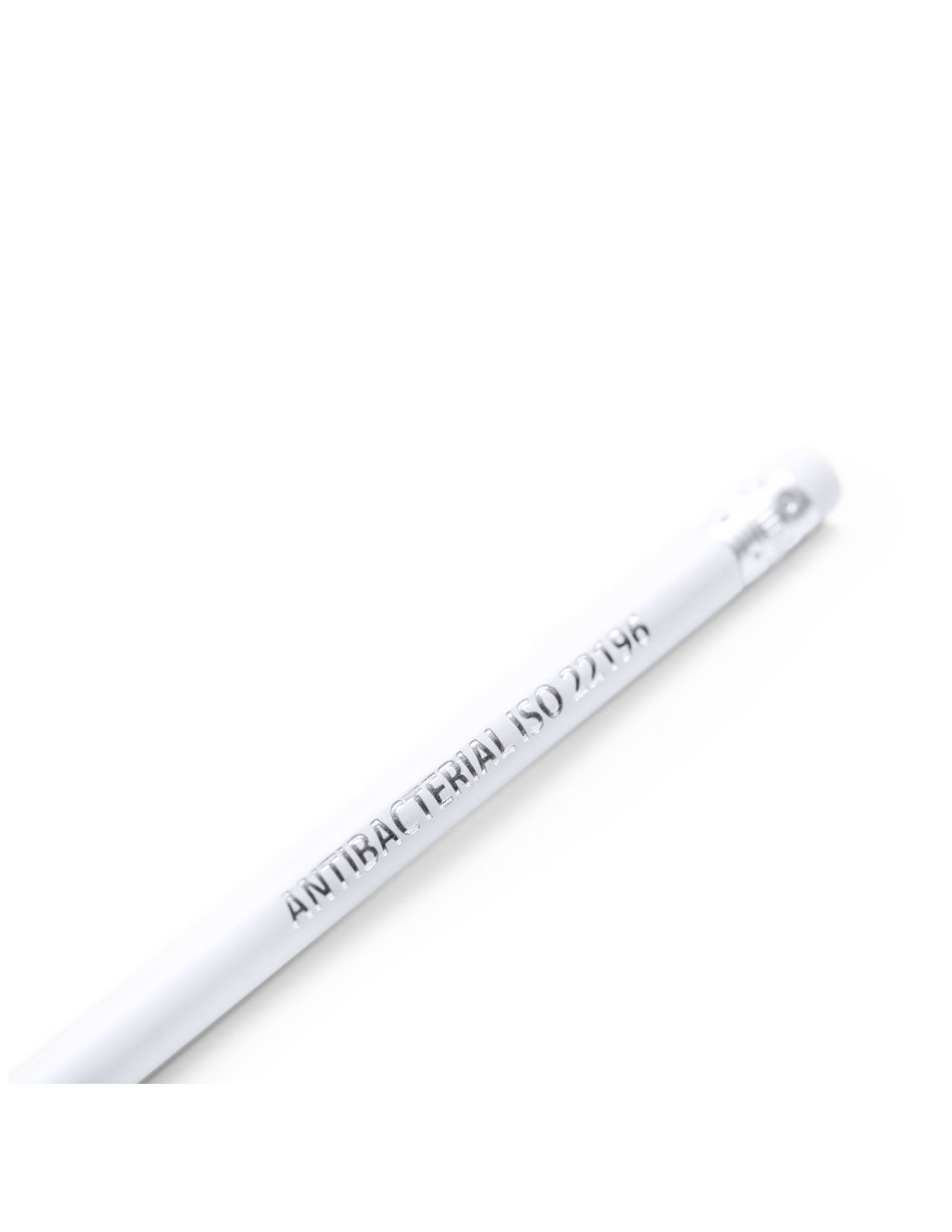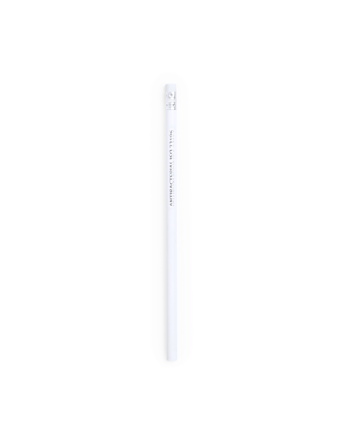 Lápiz de madera con cuerpo redondo y cobertura antibacteriana. Disponible en color blanco, con goma de borrar. Punta sin afilar.Los productos con tratamientos antibacterianos son capaces de reducir drásticamente las cargas bacterianas presentes en las superficies de los materiales, gracias a la incorporación de agentes microbianos permanentes estáticos, con alta efectividad para inhibir y prevenir la contaminación bacteriana.Artículo de acuerdo al estándar ISO 22196, que determina la actividad antibacteriana en materiales plásticos y superficies no porosas, lo que permite conocer la efectividad de inhibición microbiana que tienen los aditivos sobre los objetos tratados mediante una evaluación cuantitativa.