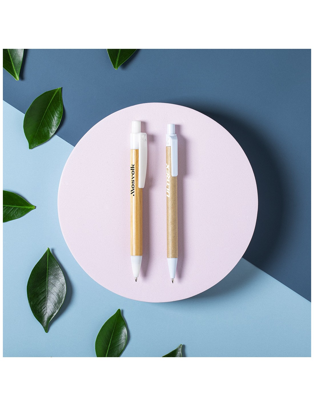 Bolígrafo de línea nature con mecanismo pulsador. Combinación de cuerpo en cartón reciclado de color natural y accesorios en PLA -Ácido PoliLáctico-, que se obtiene a partir de recursos 100% naturales como el almidón de maíz, la yuca o la caña de azúcar, pudiendo convertirse en 100% compostable al final de su ciclo de vida útil. Disponible en variada gama de colores, con tinta azul. Distintivo PLA en parte superior del bolígrafo.