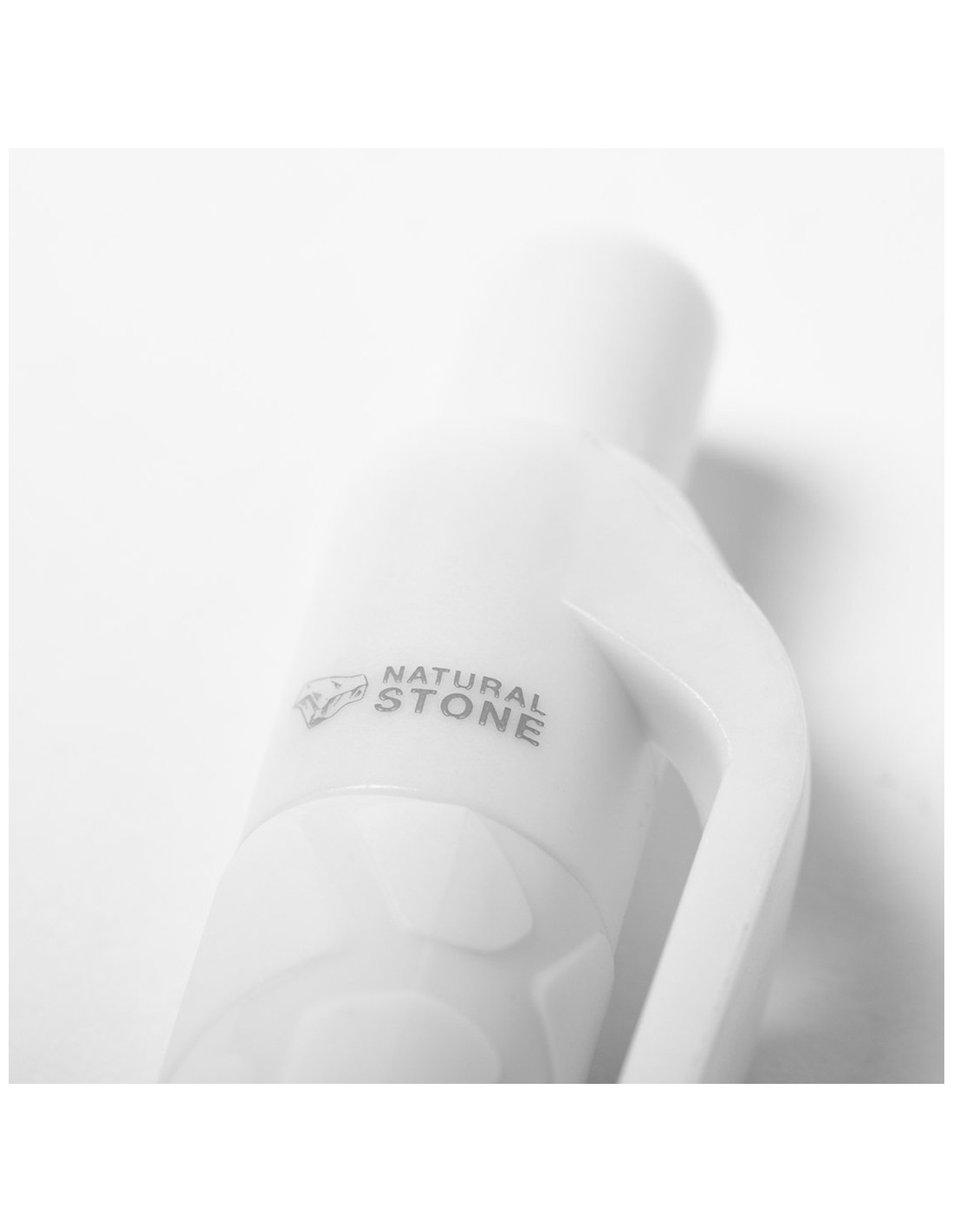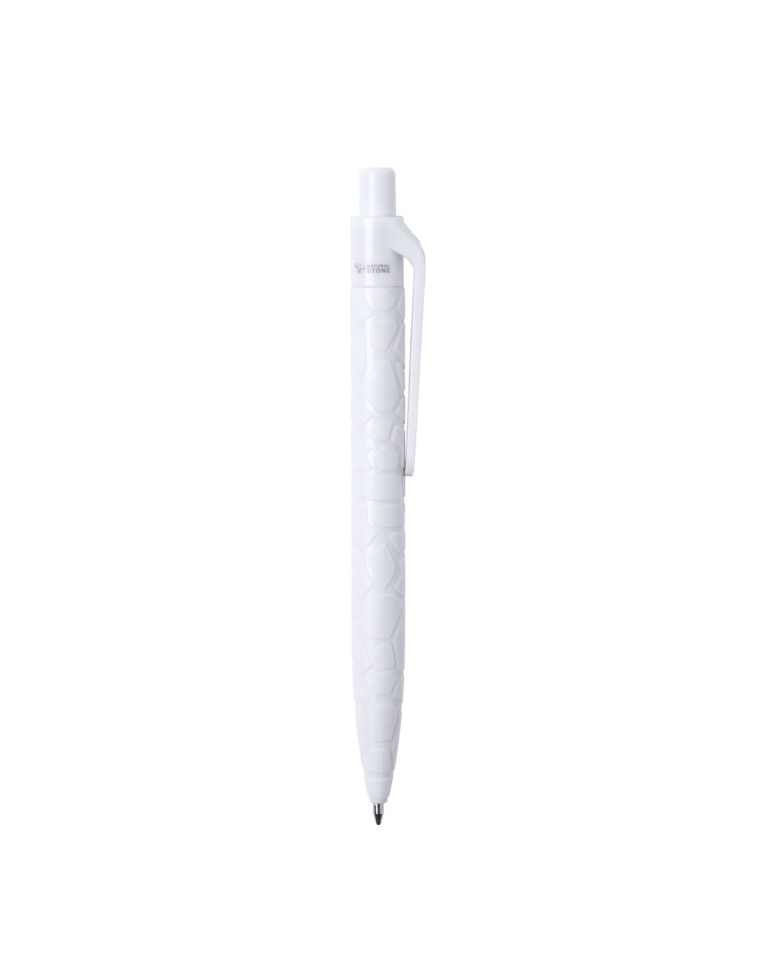 Bolígrafo de línea nature y mecanismo pulsador. Cuerpo troquelado fabricado con extractos de piedra natural, ayudando a la reducción del uso de plásticos, además de proporcionar un acabado suave y resistente. En color blanco y con distintivo natural stone en la parte superior, de cartucho jumbo y en tinta azul.