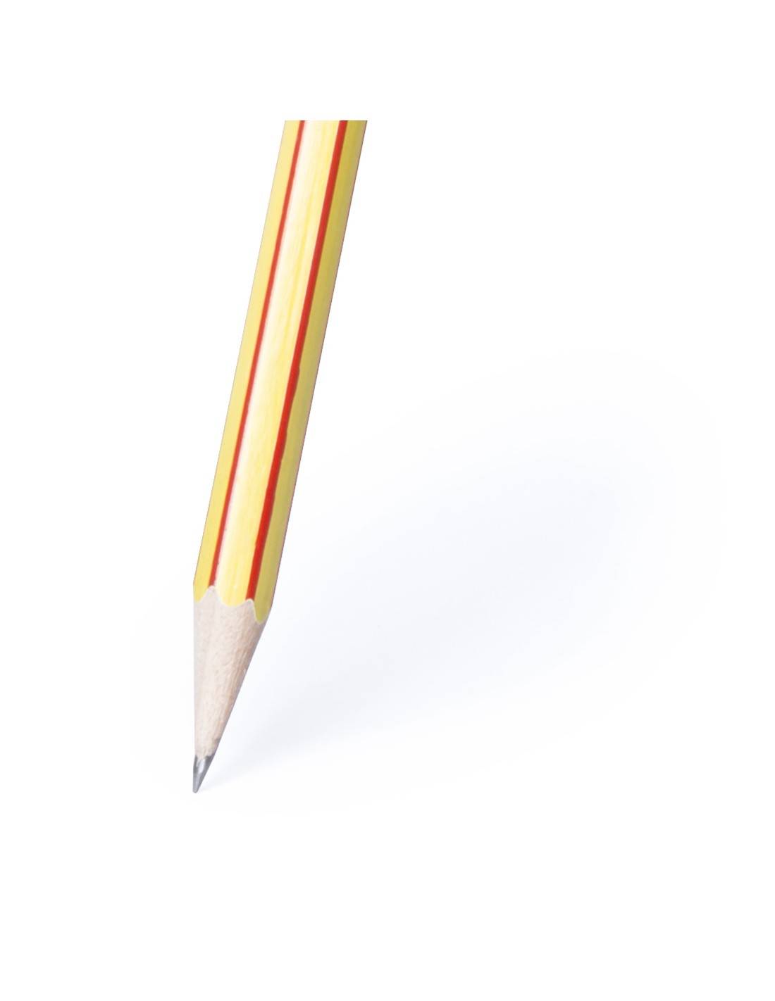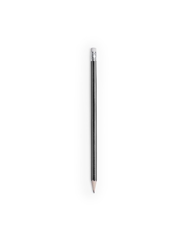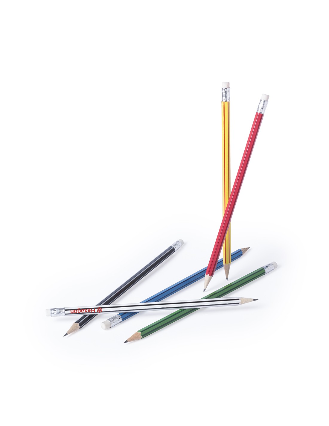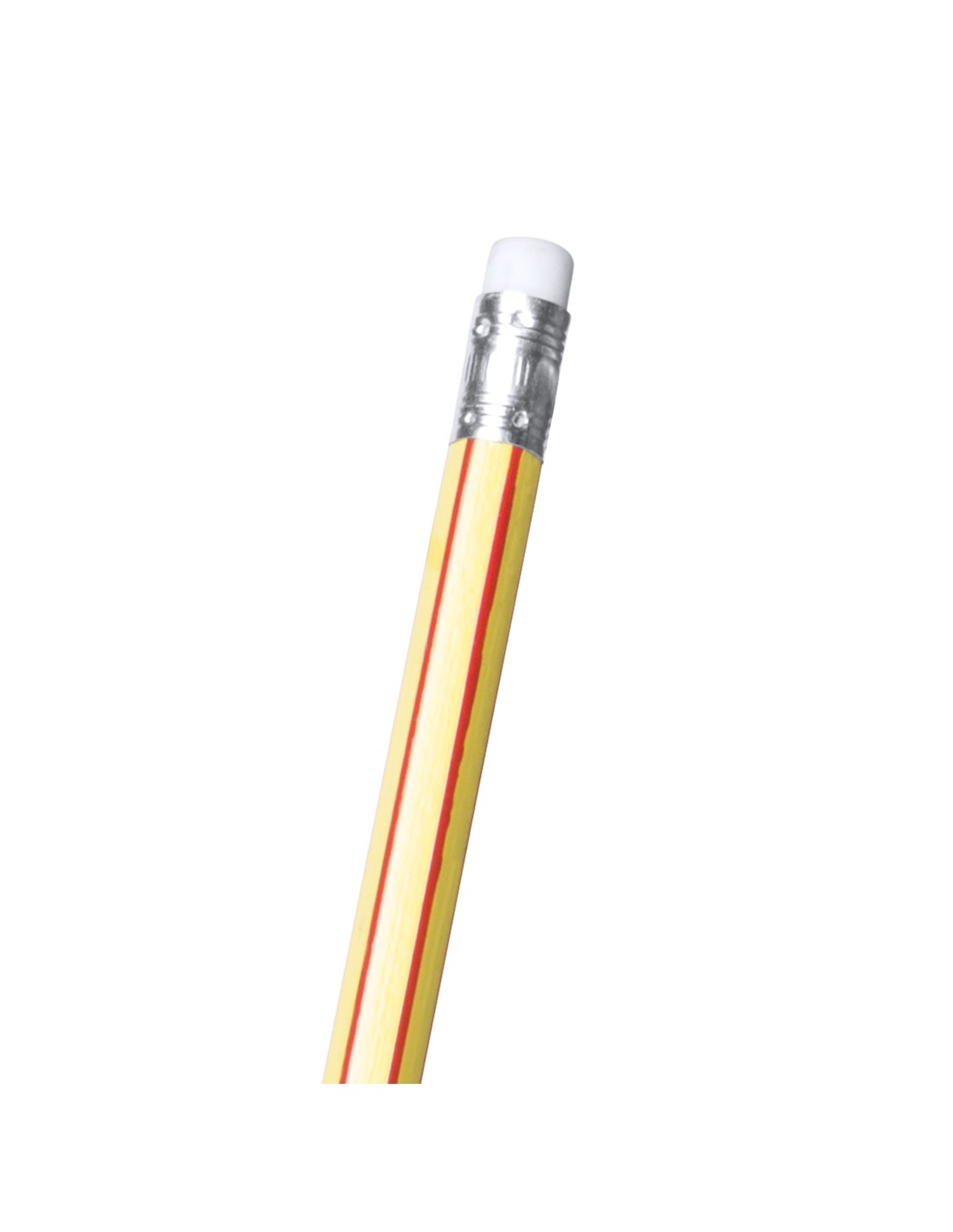 Lápiz de madera de acabado brillo. Cuerpo hexagonal y diseño bicolor, con goma de borrar en color blanco. Disponible en variada gama de colores, con mina negra y punta afilada.