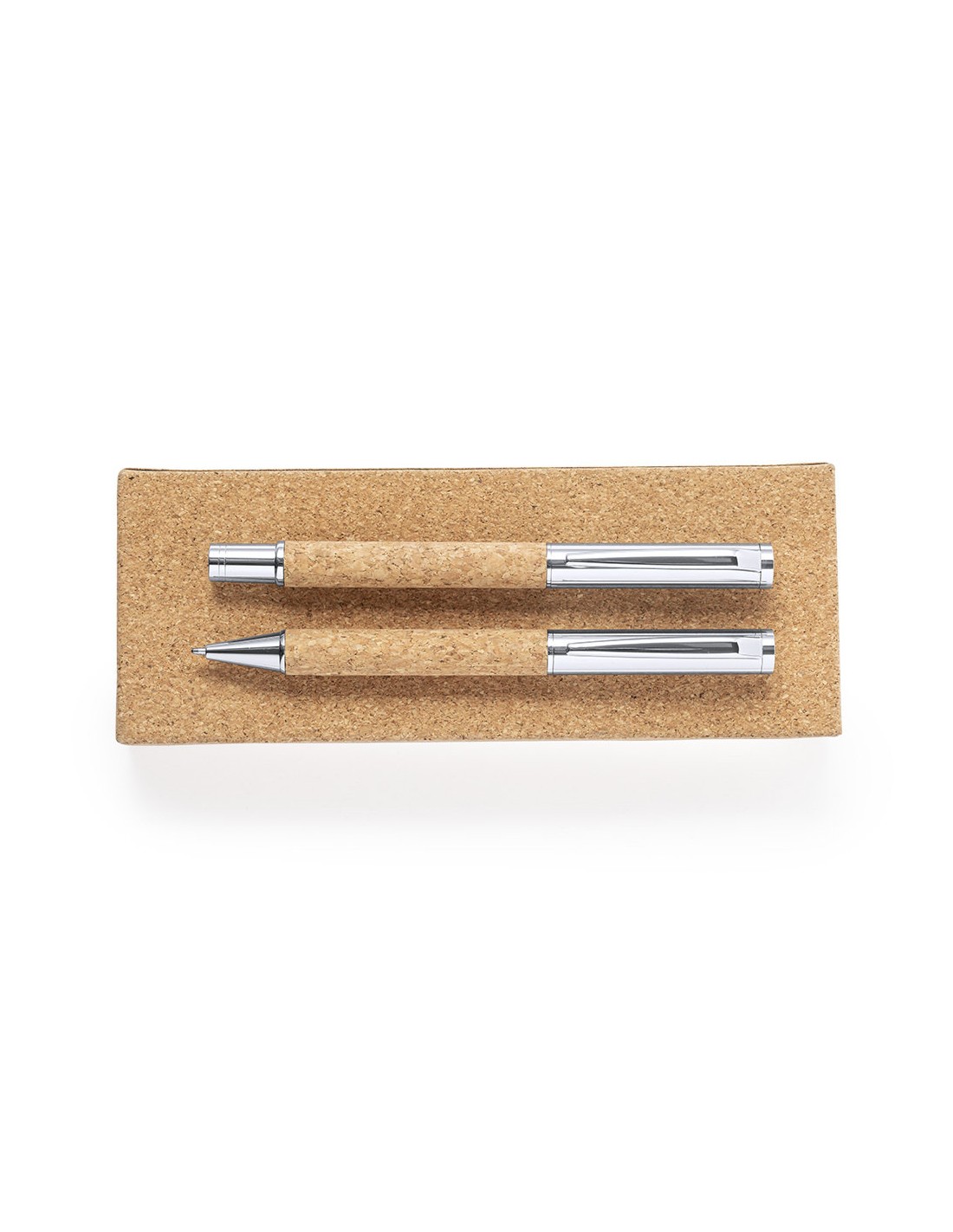 Set de bolígrafo y roller de línea nature. Fabricado en combinación de corcho natural con metal, para así fomentar la utilización de materias primas naturales y reducir las emisiones contaminantes. Bolígrafo de mecanismo giratorio en tinta azul. Roller con capucha y tinta gel en azul, con carga jumbo metalizada. Presentado en estuche individual de corcho con interior en antelina.