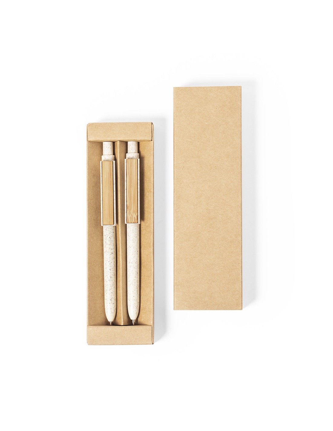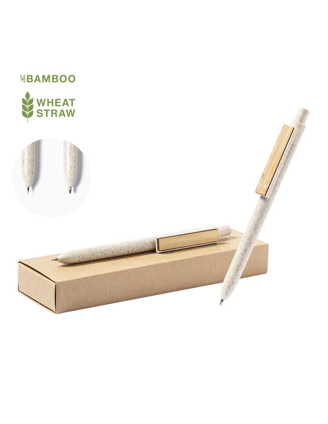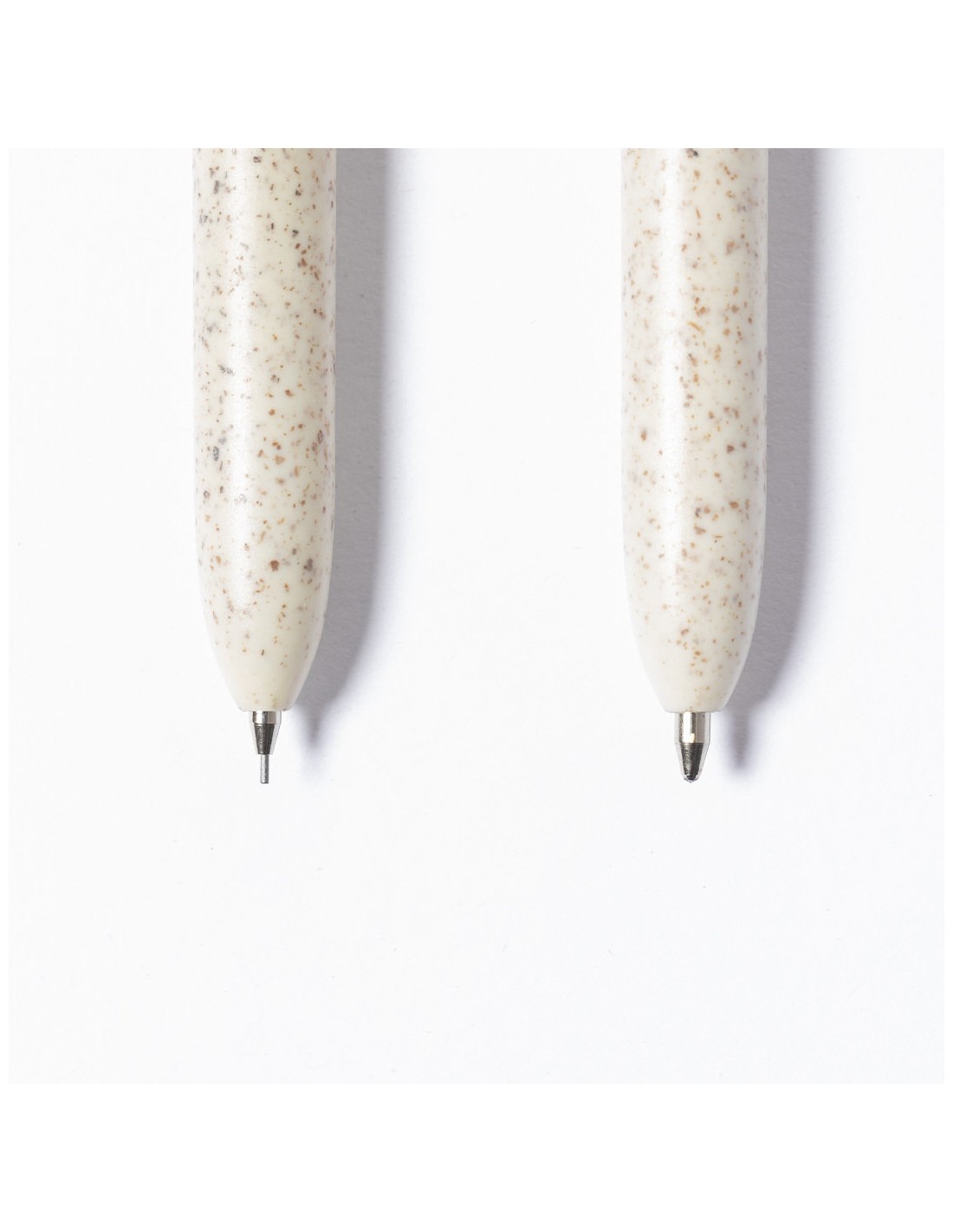 Set de bolígrafo y portaminas de línea nature. Fabricado en combinación de caña de trigo con clip en bambú, para así fomentar la utilización de materias primas naturales y reducir las emisiones contaminantes. Clip con amplia zona de marcaje. Bolígrafo en tinta azul y portaminas con 2 minas incluidas de 0,5mm. Presentado en estuche individual de cartón reciclado.Distintivo Wheat Straw en la parte superior del bolígrafo y portaminas.