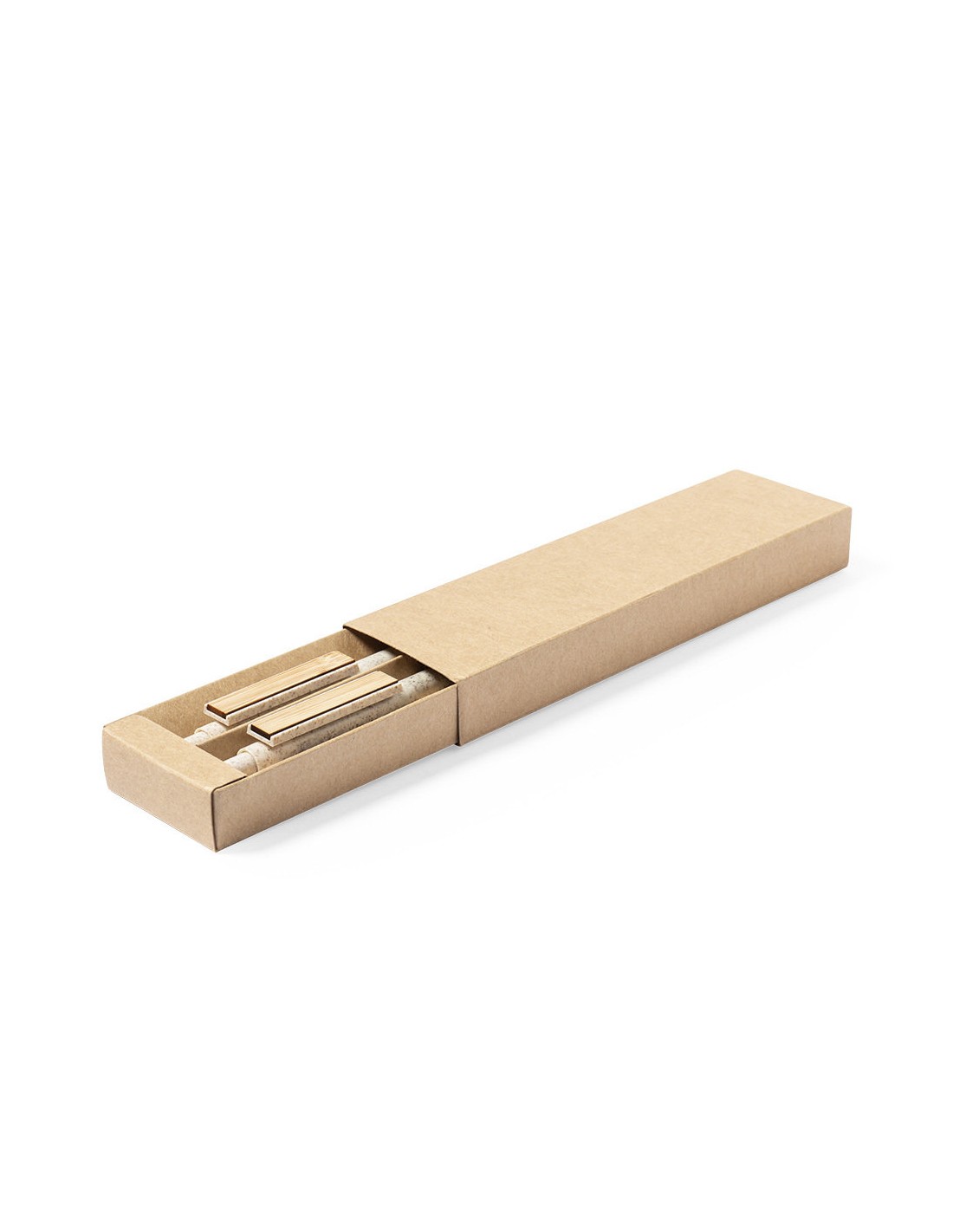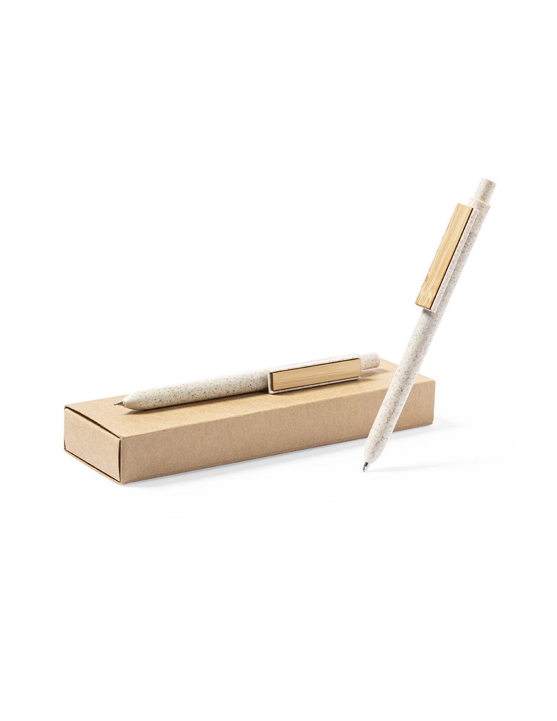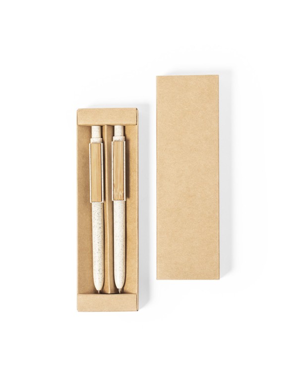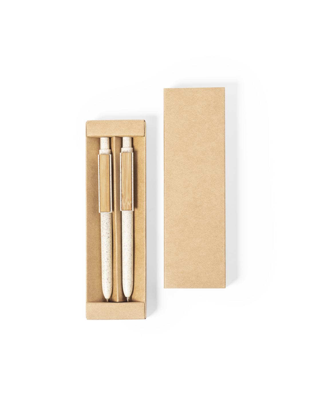 Set de bolígrafo y portaminas de línea nature. Fabricado en combinación de caña de trigo con clip en bambú, para así fomentar la utilización de materias primas naturales y reducir las emisiones contaminantes. Clip con amplia zona de marcaje. Bolígrafo en tinta azul y portaminas con 2 minas incluidas de 0,5mm. Presentado en estuche individual de cartón reciclado.Distintivo Wheat Straw en la parte superior del bolígrafo y portaminas.
