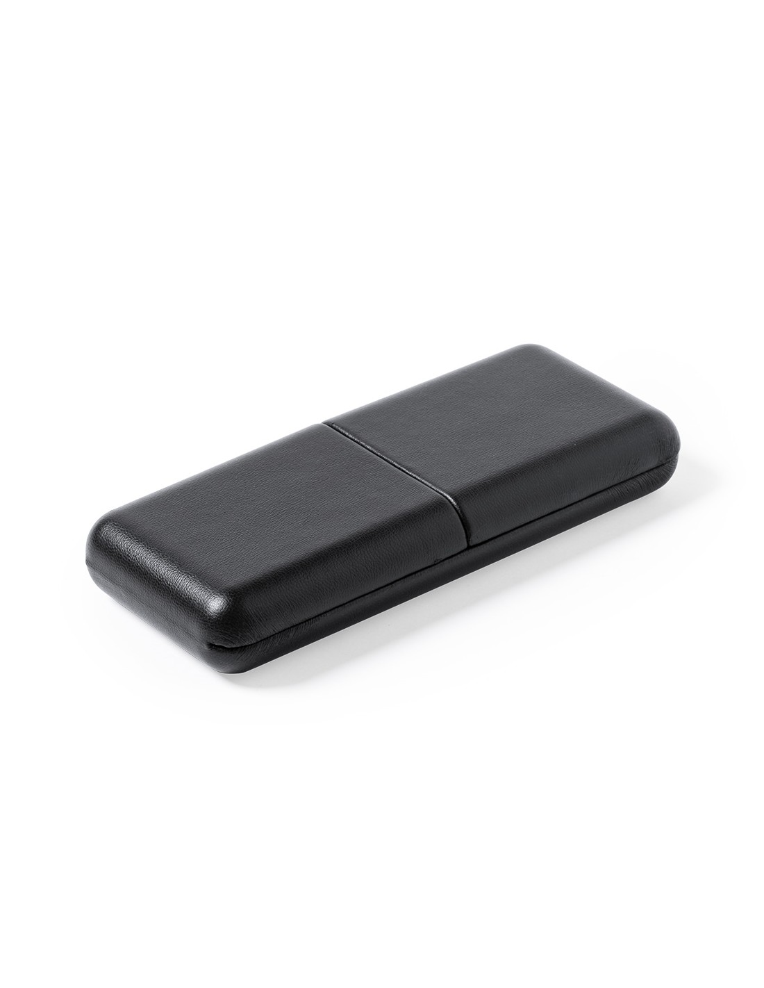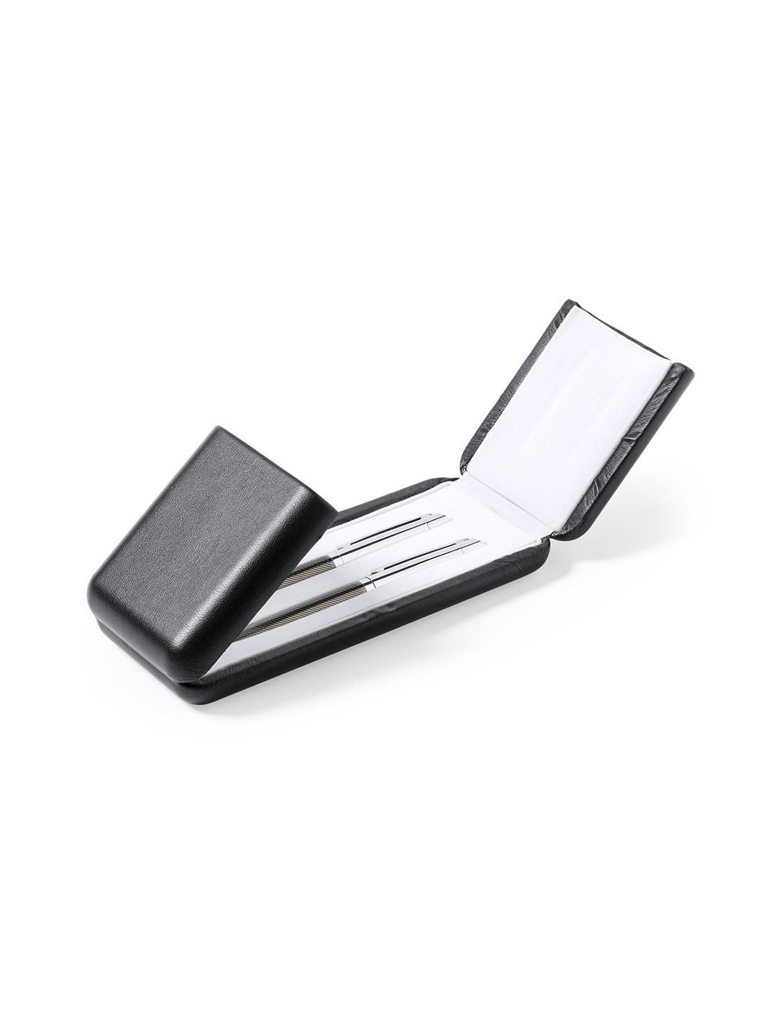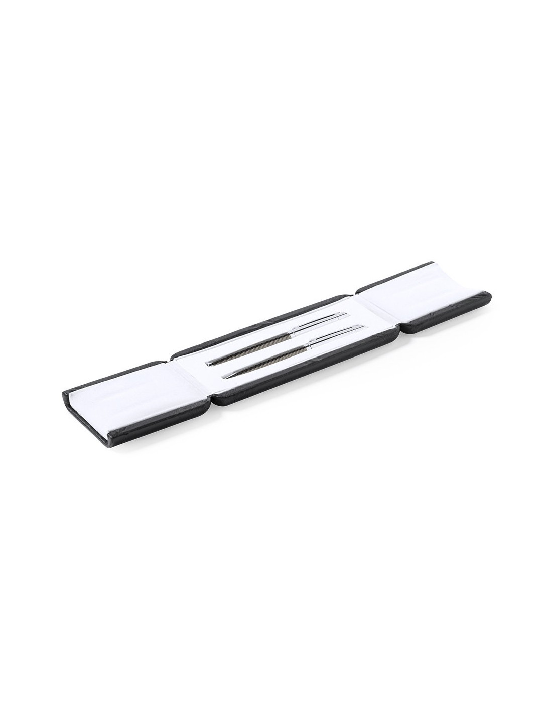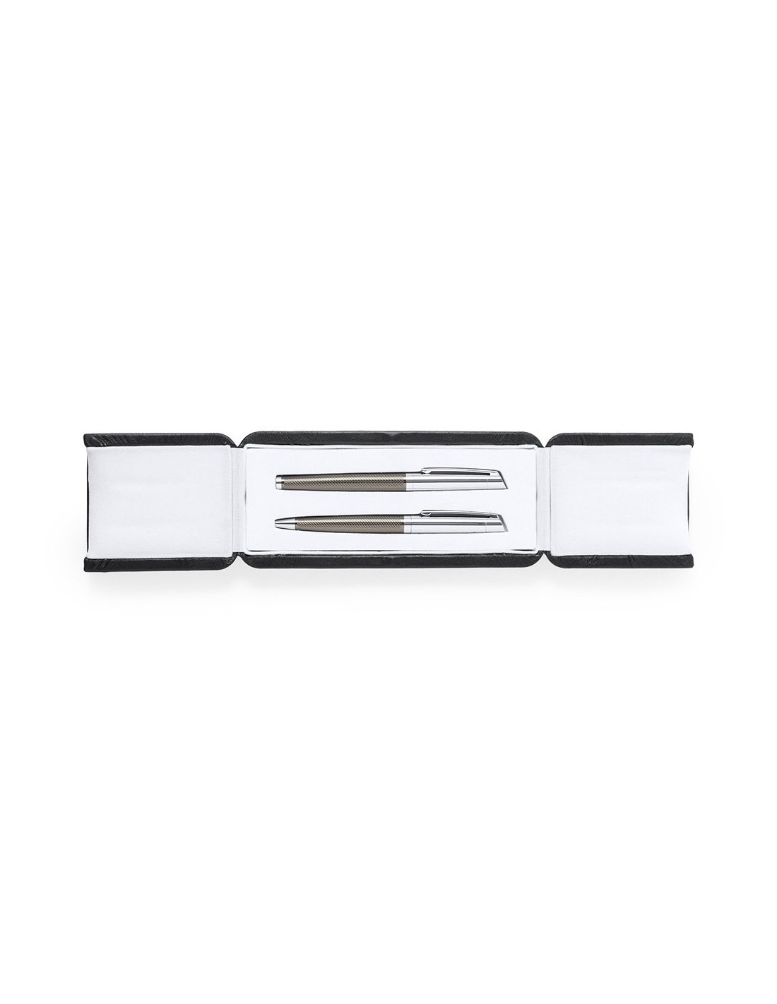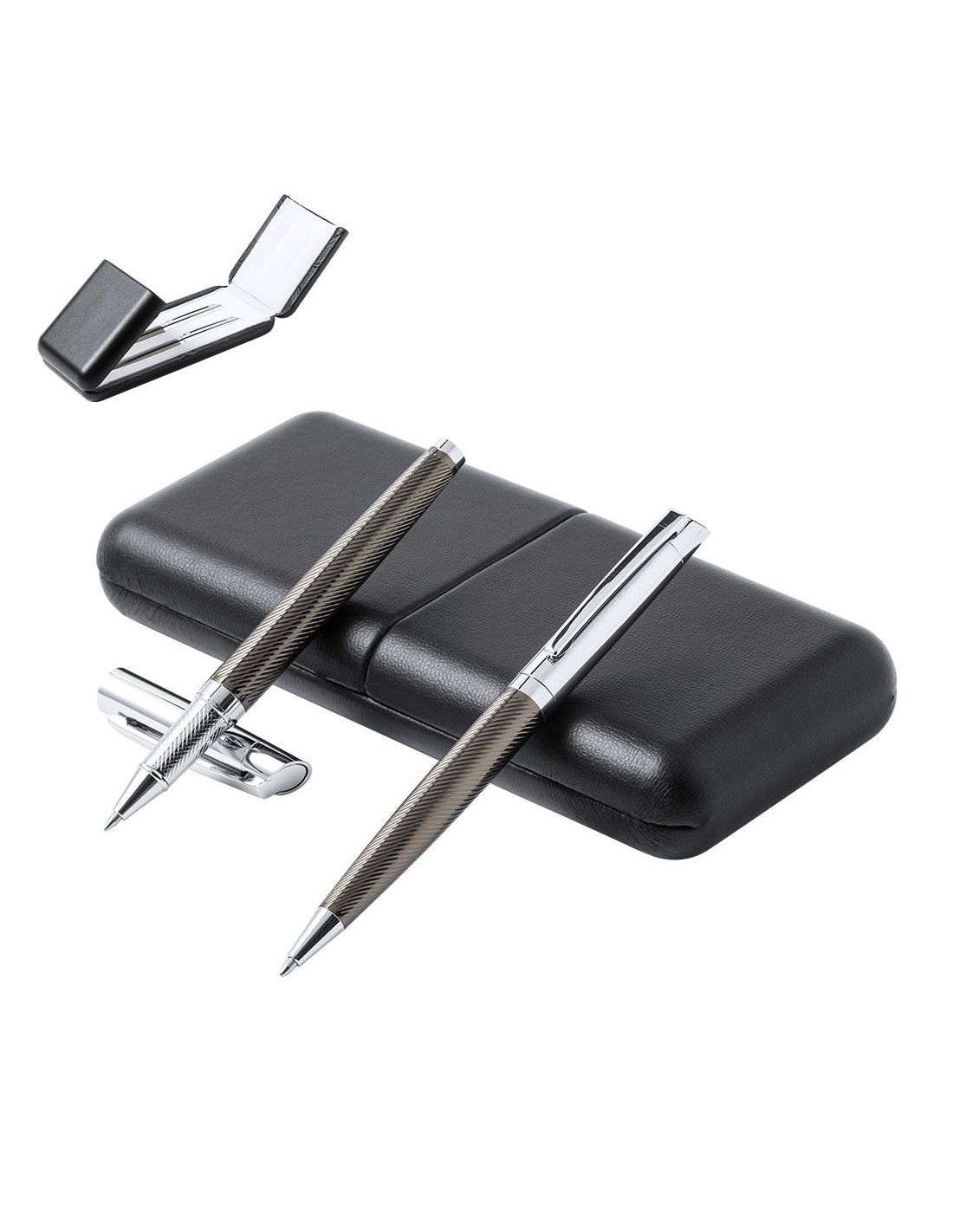 Set premium de bolígrafo y roller. Fabricado en elegante combinación de metal en tonos negros y cromados. Bolígrafo de mecanismo giratorio en tinta azul y con cartucho jumbo. Roller con capucha y tinta gel en azul, carga jumbo. Presentado en estuche individual de polipiel con interior en contraste de antelina en blanco.