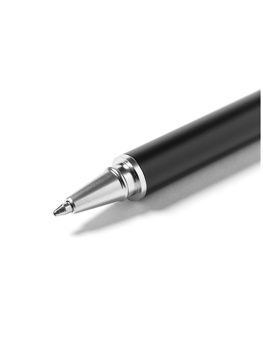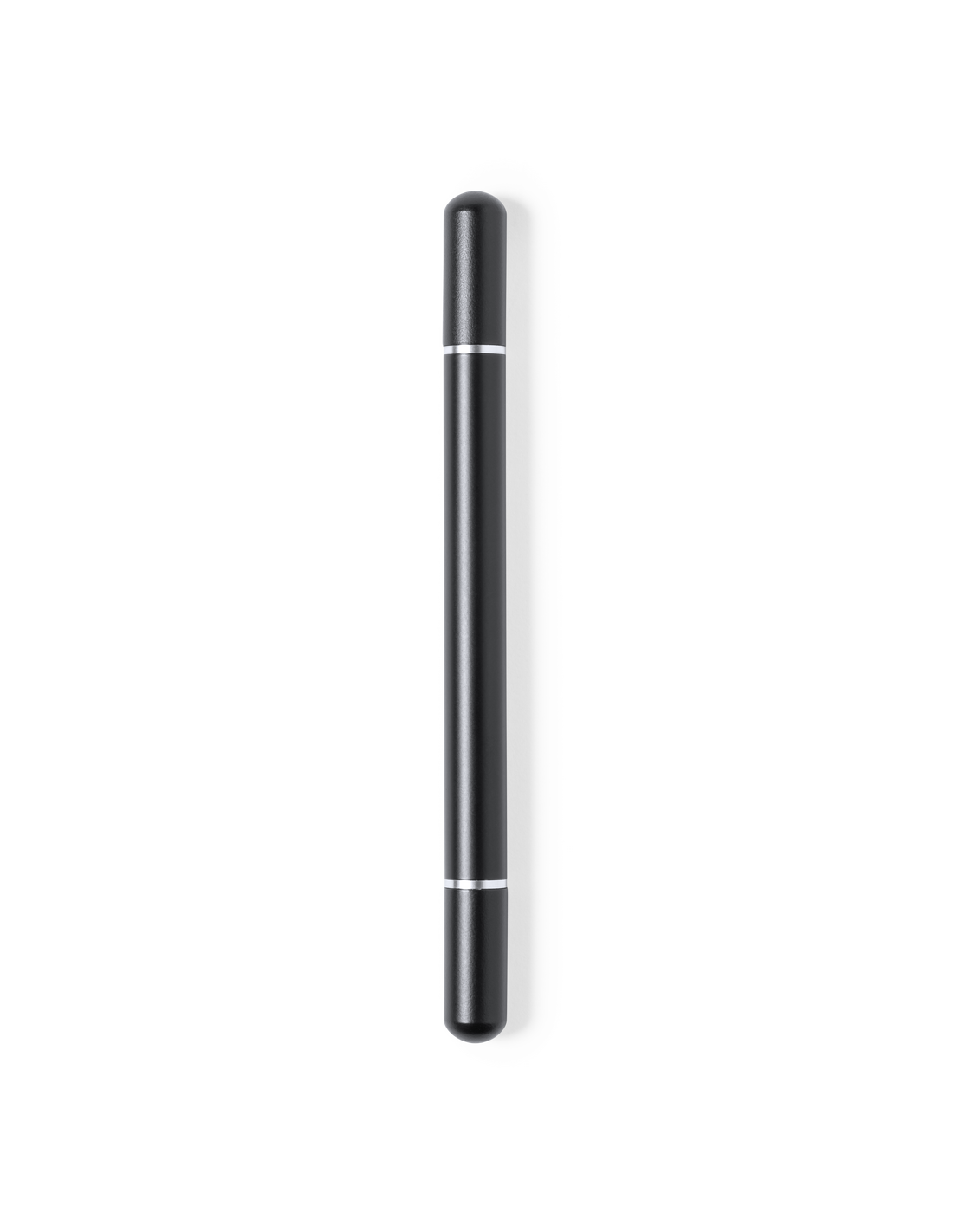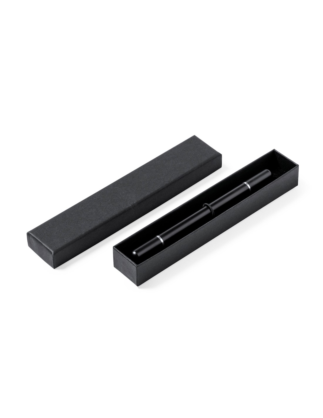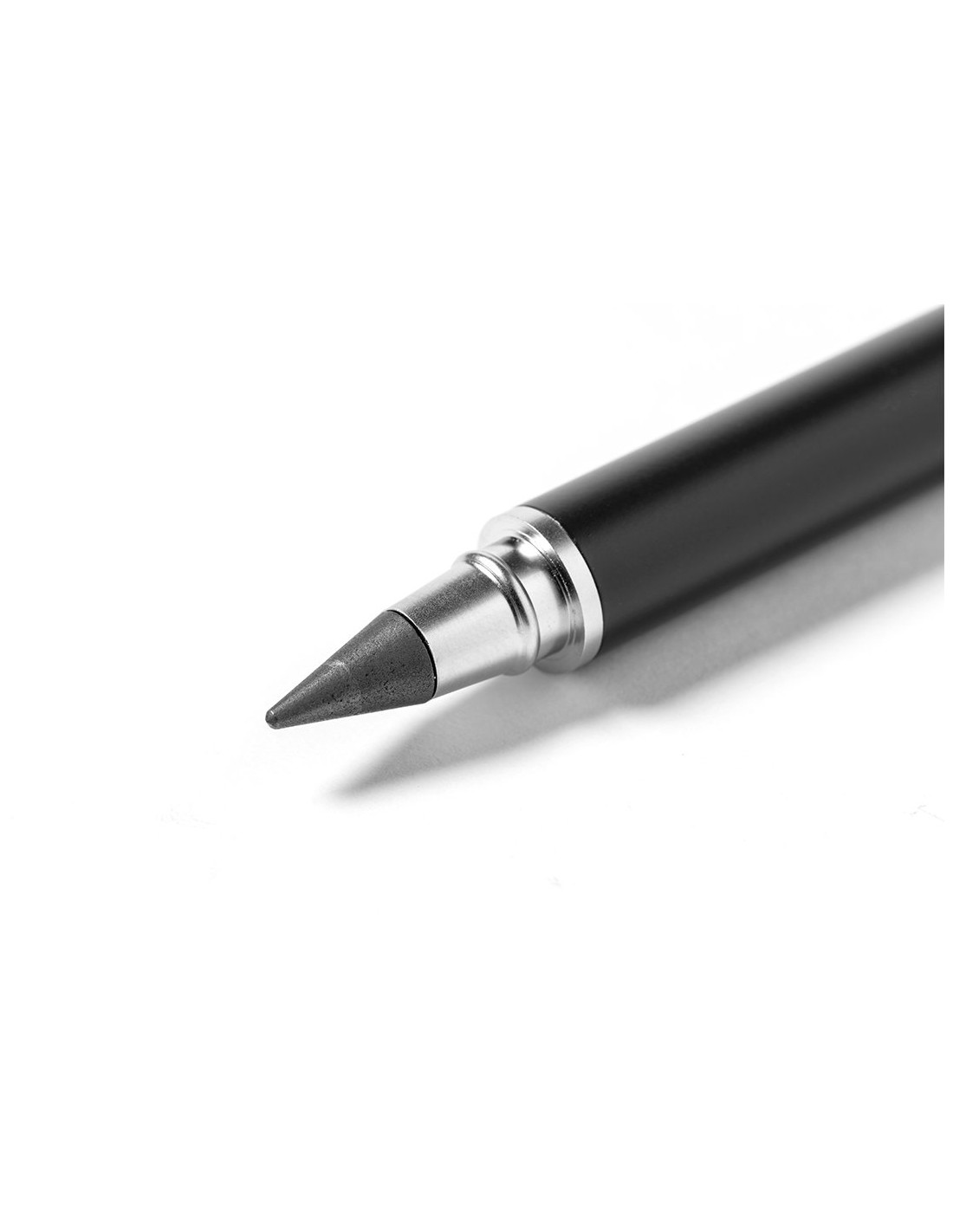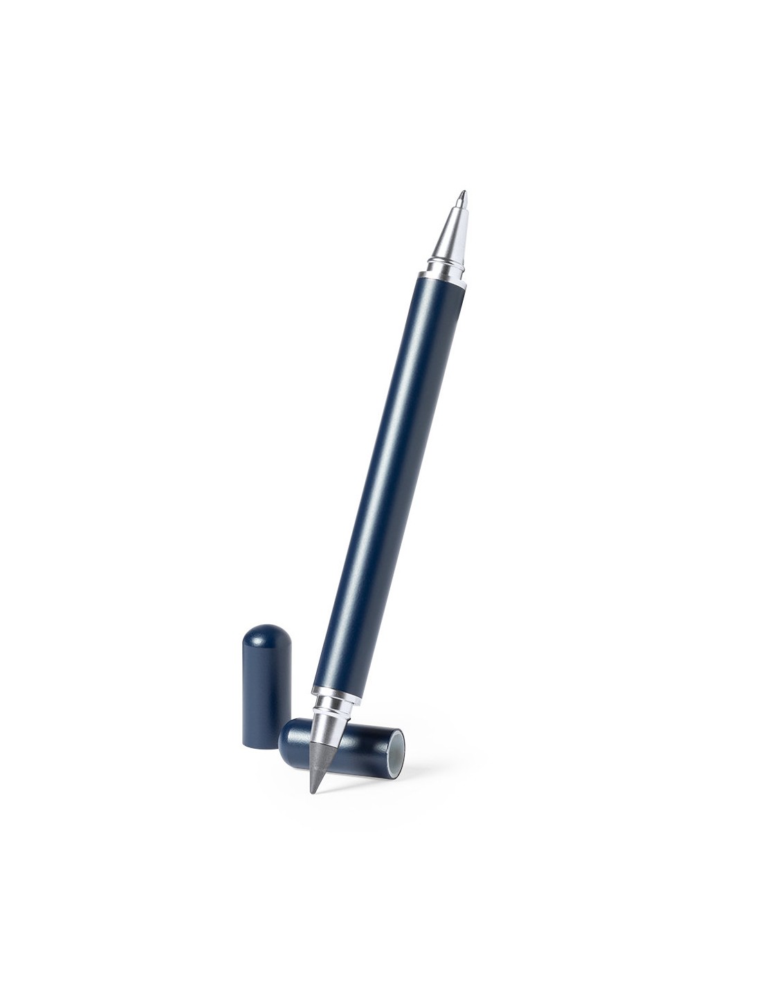 Bolígrafo lápiz eterno 2 en 1, fabricado en resistente metal de acabado brillo. Con cierre de capucha, incluye bolígrafo en un extremo (carga jumbo y tinta azul), y lápiz eterno en el otro extremo, para así usar siempre el mismo lápiz y no generar residuos. Presentado en estuche individual negro.