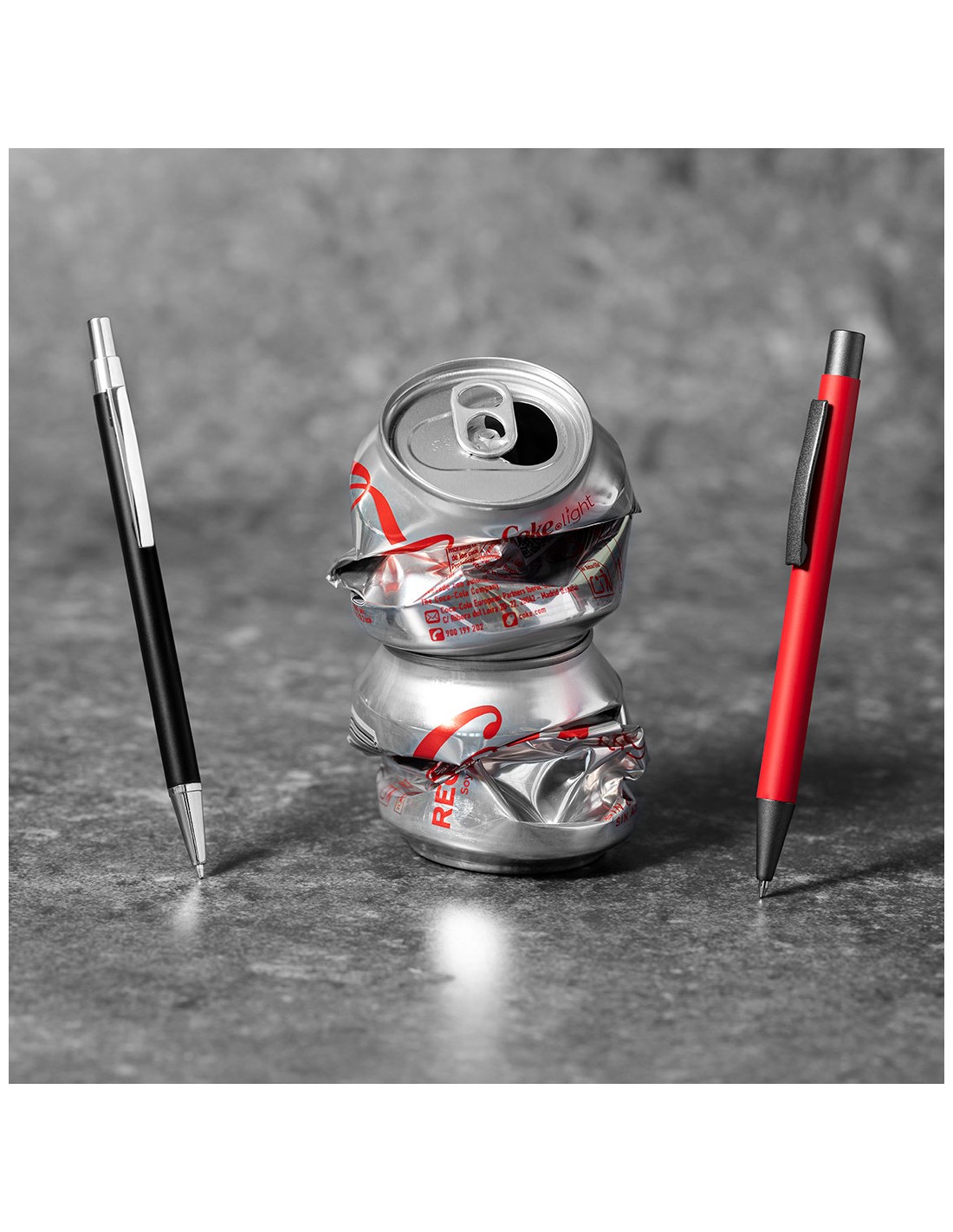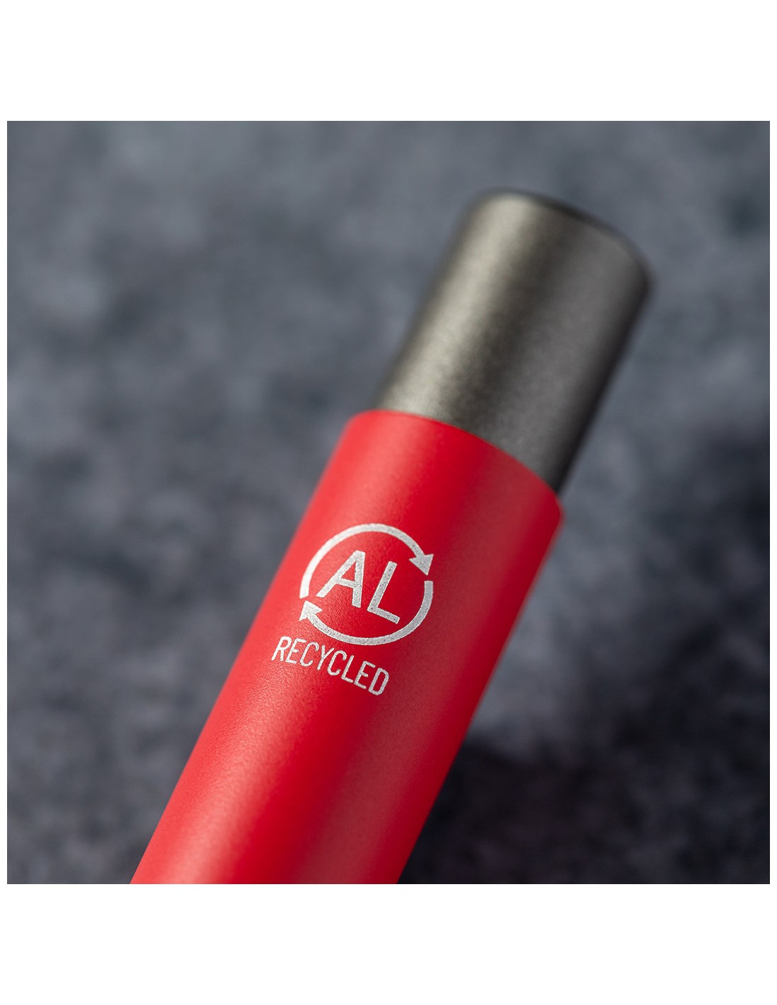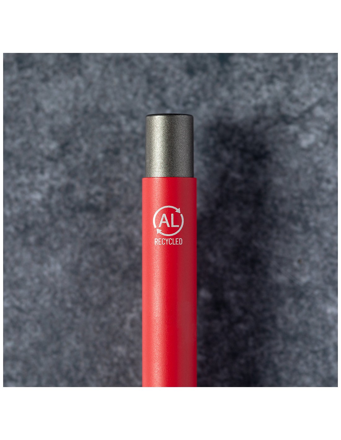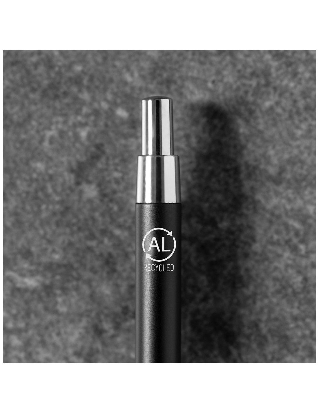 Bolígrafo eco-friendly fabricado en aluminio reciclado, cuyo origen se encuentra en la reutilización casi infinita de uno de los materiales con mayor potencial de reciclabilidad sin perder sus propiedades. Esta característica lo convierte en un material eco-friendly de origen reciclado, fácilmente reciclable y de cuyos procesos de tratamiento y desechos para la obtención del material se pueden obtener nuevos recursos reutilizables, consumiendo menos energía en su fabricación, entre otros factores de sostenibilidad. De mecanismo pulsador, con cuerpo disponible en variada gama de colores metalizados y accesorios en cromado. Con clip metálico, tinta azul y distintivo aluminio reciclado en la parte superior del bolígrafo. Certificación GRS (Global Recycled Standard / Estándar de Reciclaje Global), que garantiza el origen reciclado del material usado para fabricar el producto.
