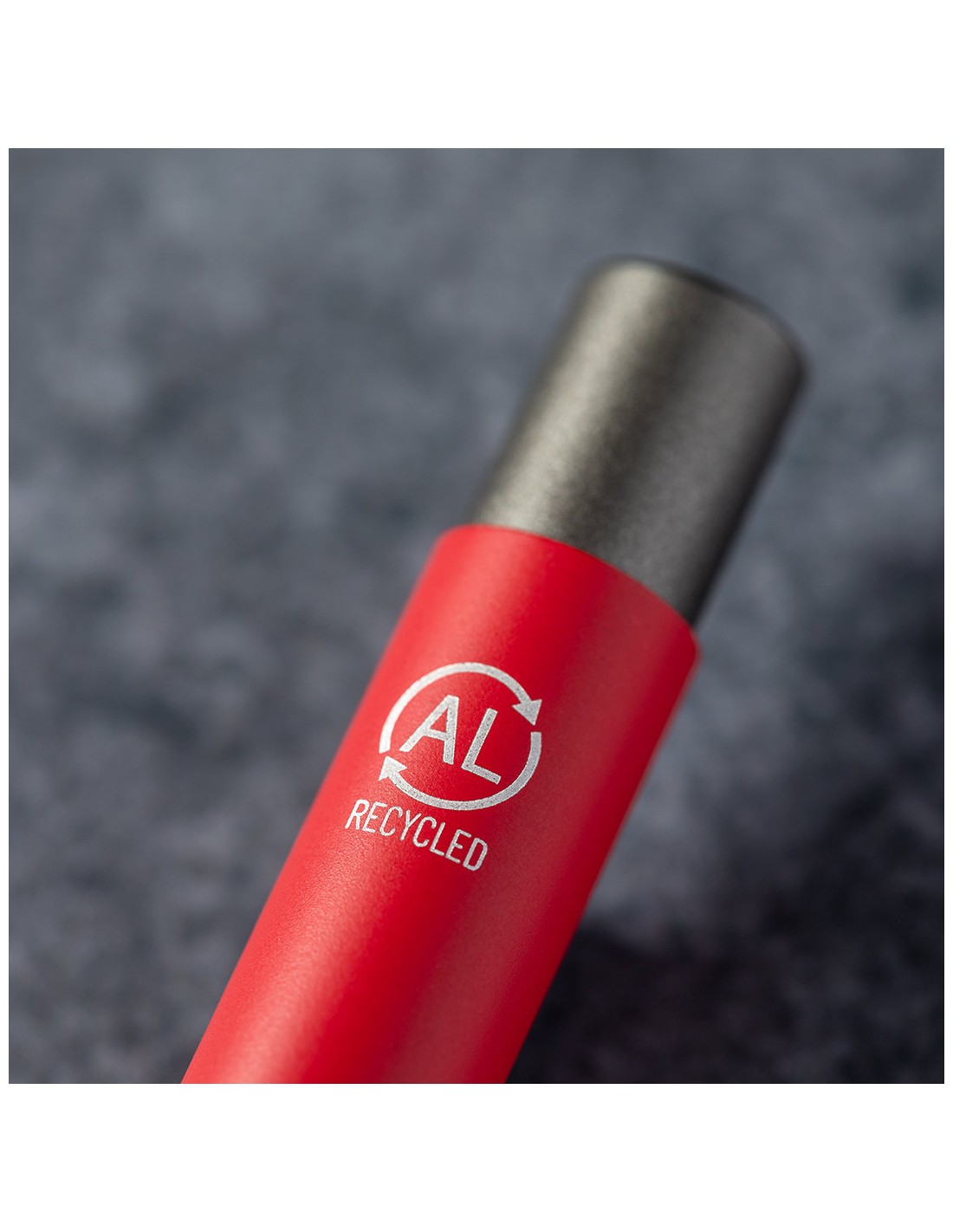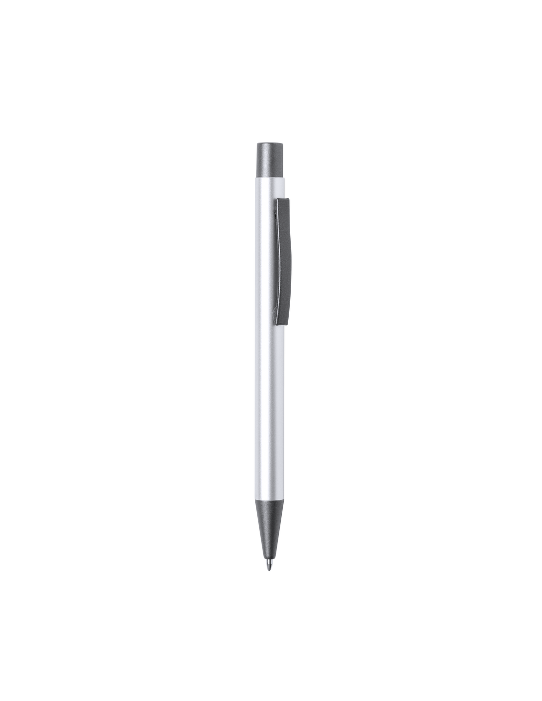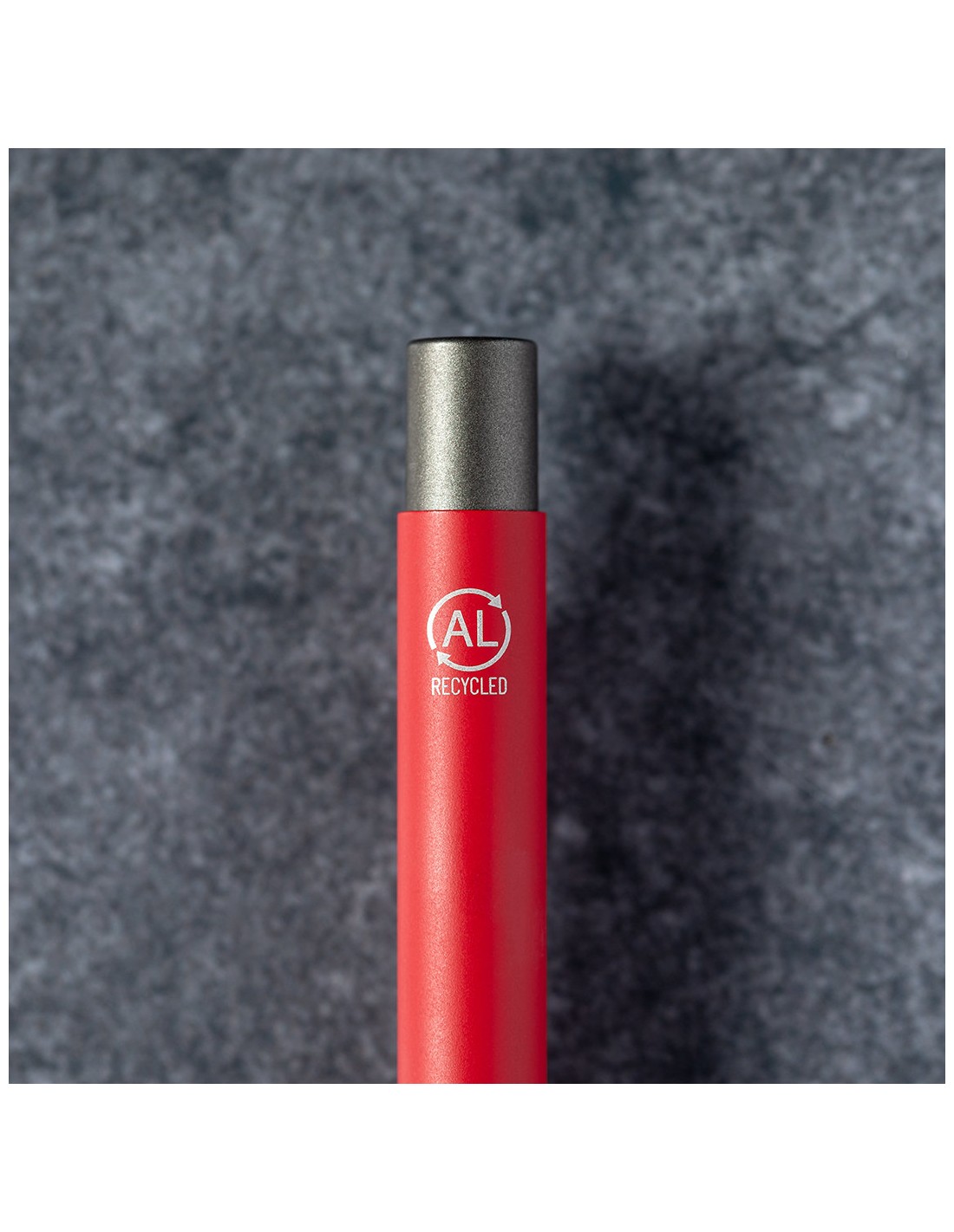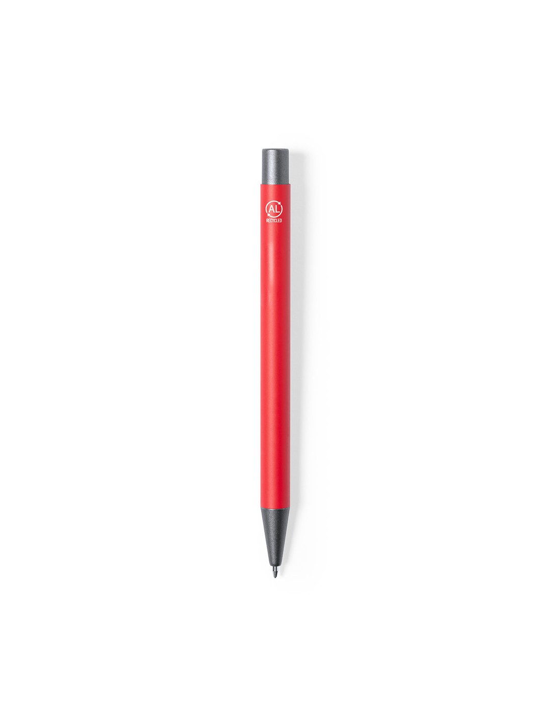 Bolígrafo eco-friendly fabricado en aluminio reciclado, cuyo origen se encuentra en la reutilización casi infinita de uno de los materiales con mayor potencial de reciclabilidad sin perder sus propiedades. Esta característica lo convierte en un material eco-friendly de origen reciclado, fácilmente reciclable y de cuyos procesos de tratamiento y desechos para la obtención del material se pueden obtener nuevos recursos reutilizables, consumiendo menos energía en su fabricación, entre otros factores de sostenibilidad. De mecanismo pulsador, con cuerpo disponible en variada gama de colores metalizados y accesorios en acabado gun. Clip metálico, tinta azul y distintivo aluminio reciclado en la parte superior del bolígrafo. Certificación GRS (Global Recycled Standard / Estándar de Reciclaje Global), que garantiza el origen reciclado del material usado para fabricar el producto.