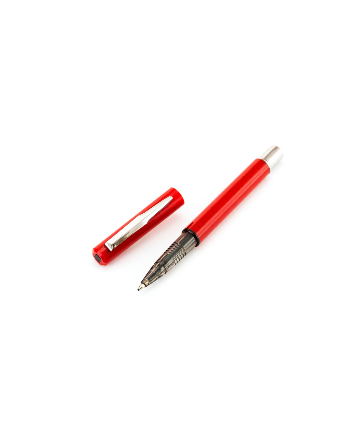 Roller de capucha con cuerpo de suave acabado sólido en colores cálidos. Con accesorios en color plateado y punta de acabado transparente, clip metálico y tinta azul.