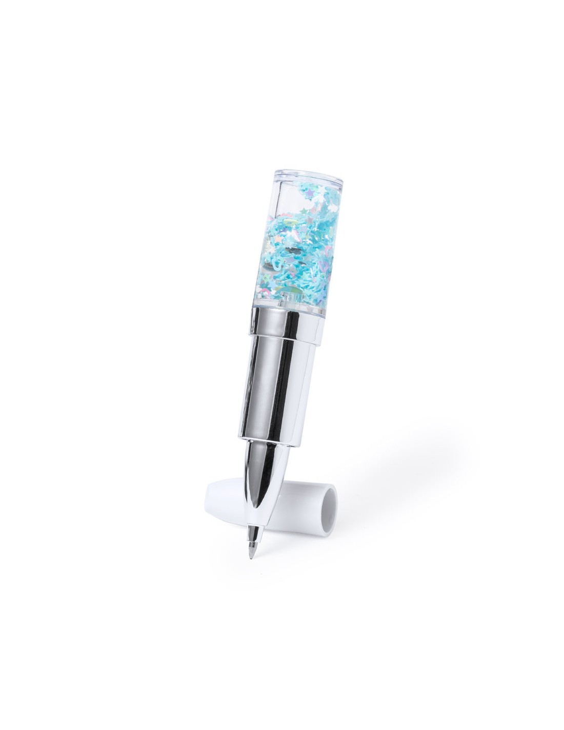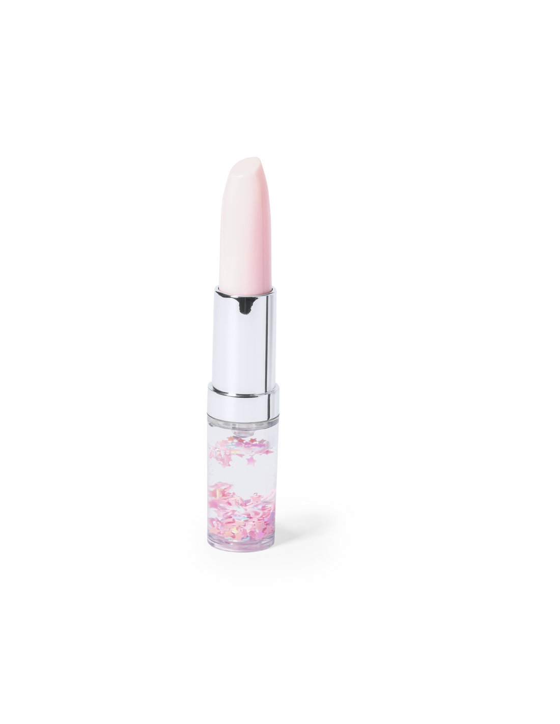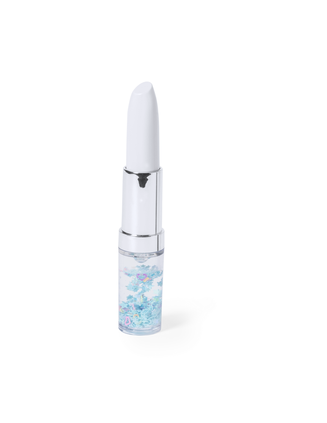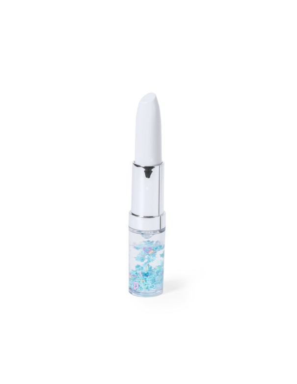 Original bolígrafo en forma de pintalabios, con líquido interior en colorido diseño. Con capucha y en tinta azul.