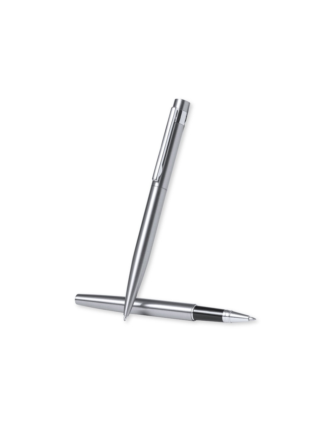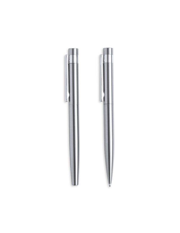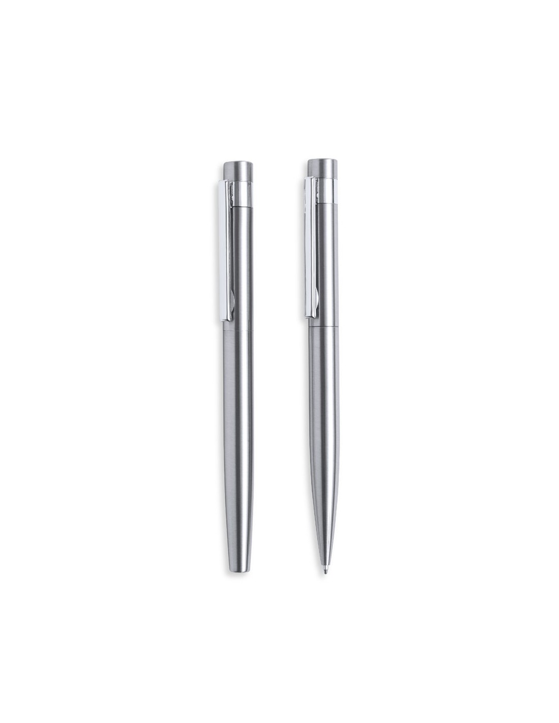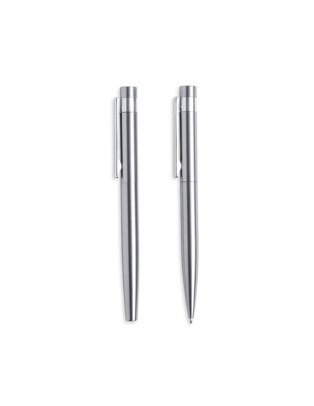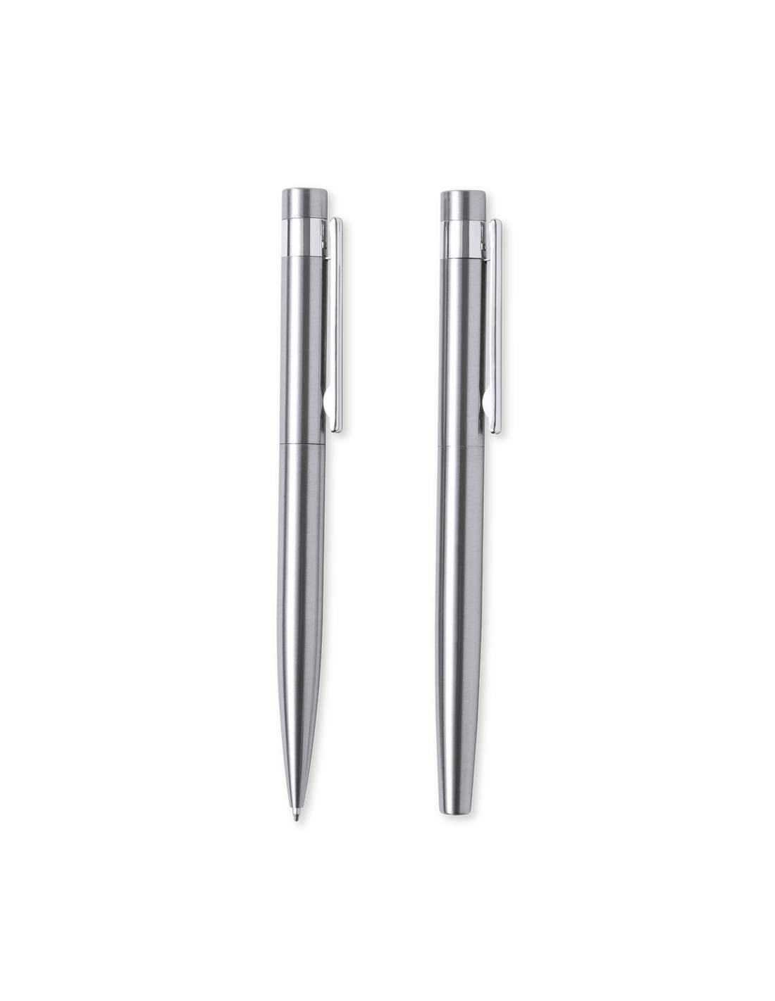 Set eco-friendly de bolígrafo y roller, fabricados en acero inox reciclado. Incluye: Bolígrafo de mecanismo giratorio, con cuerpo en acabado plateado y accesorios en cromado. Clip metálico y distintivo acero inox reciclado en la parte superior del bolígrafo. Cartucho jumbo y tinta azul.Roller con cuerpo en color plateado y accesorios en cromado. Clip metálico y distintivo acero inox reciclado en la parte superior de la capucha. Cartucho jumbo y tinta azul.Set presentado en estuche individual de diseño kraft con funda a juego.El acero es uno de los materiales más demandados y que puede encontrarse casi en todas partes, desde productos de uso diario a grandes construcciones. Con innumerables propiedades, entre las que cabe destacar la durabilidad y su alto grado de reutilización, convirtiéndolo en una alternativa muy valorada en soluciones de sostenibilidad. Debidamente tratado, permite obtener nuevos recursos de infinita utilización.