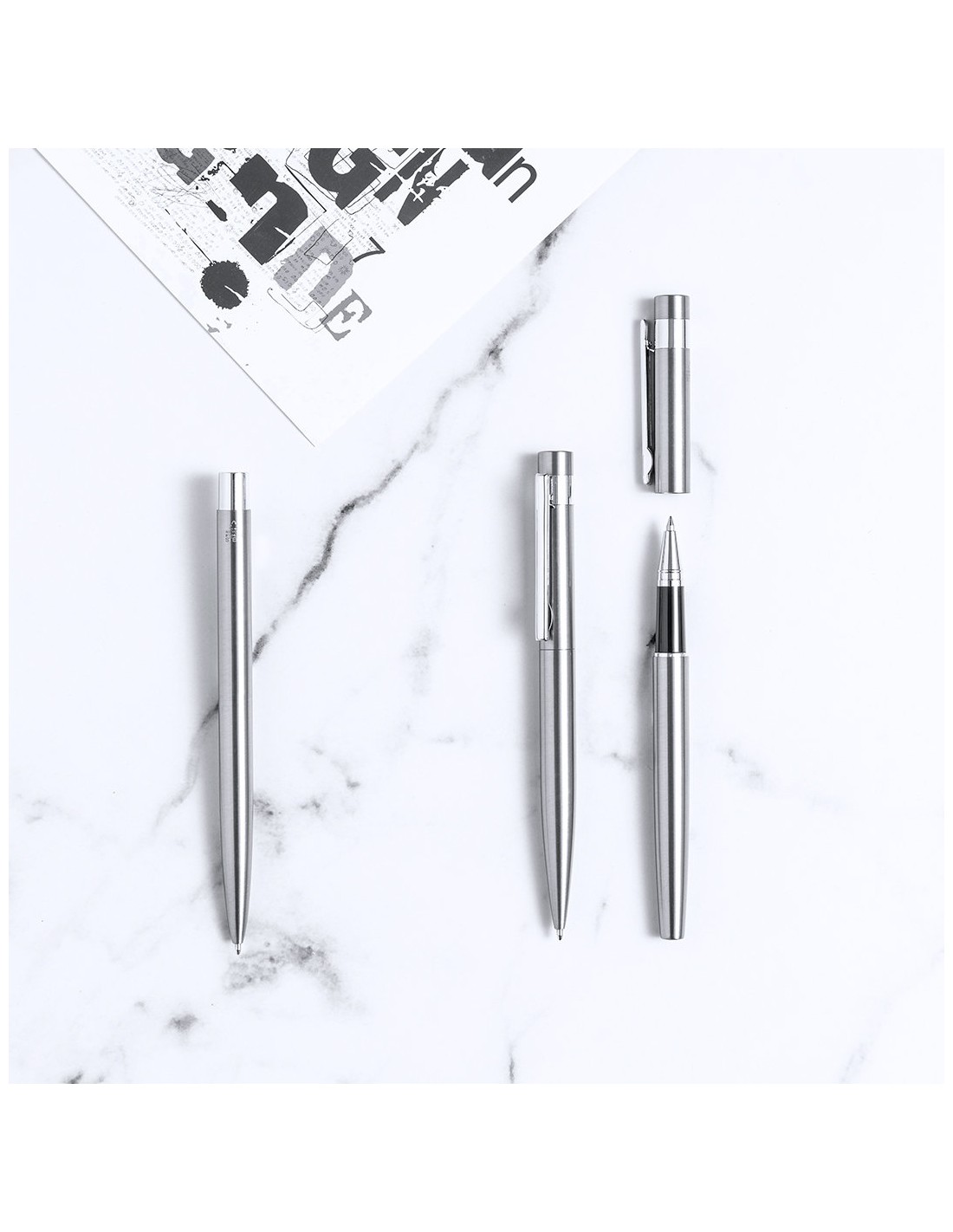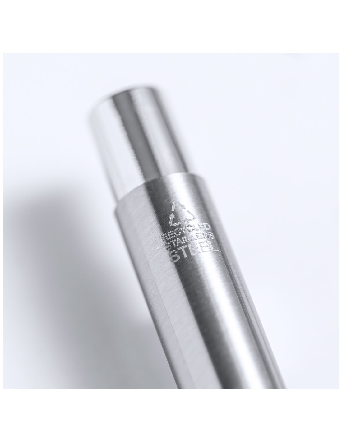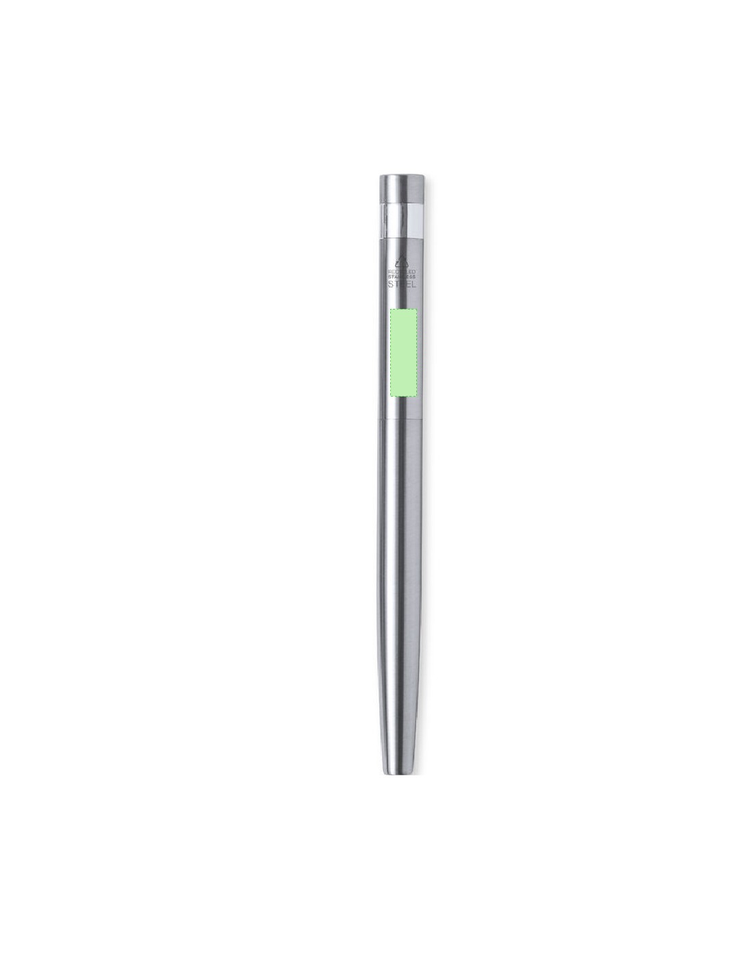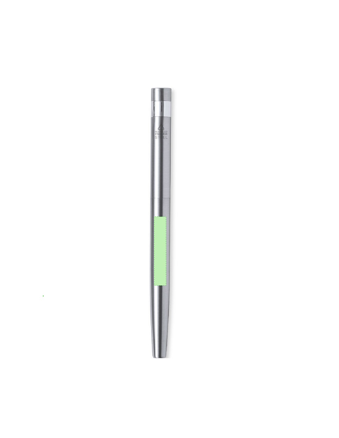 Set eco-friendly de bolígrafo y roller, fabricados en acero inox reciclado. Incluye: Bolígrafo de mecanismo giratorio, con cuerpo en acabado plateado y accesorios en cromado. Clip metálico y distintivo acero inox reciclado en la parte superior del bolígrafo. Cartucho jumbo y tinta azul.Roller con cuerpo en color plateado y accesorios en cromado. Clip metálico y distintivo acero inox reciclado en la parte superior de la capucha. Cartucho jumbo y tinta azul.Set presentado en estuche individual de diseño kraft con funda a juego.El acero es uno de los materiales más demandados y que puede encontrarse casi en todas partes, desde productos de uso diario a grandes construcciones. Con innumerables propiedades, entre las que cabe destacar la durabilidad y su alto grado de reutilización, convirtiéndolo en una alternativa muy valorada en soluciones de sostenibilidad. Debidamente tratado, permite obtener nuevos recursos de infinita utilización.
