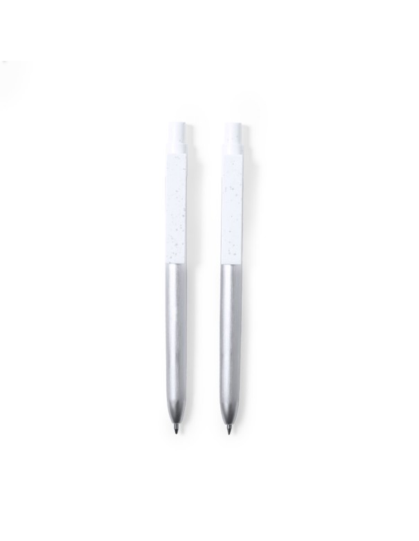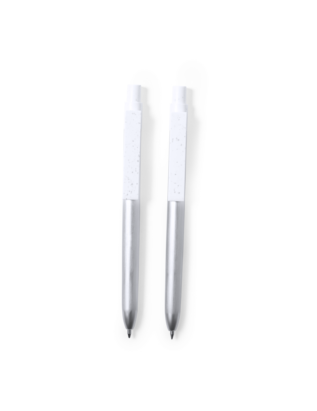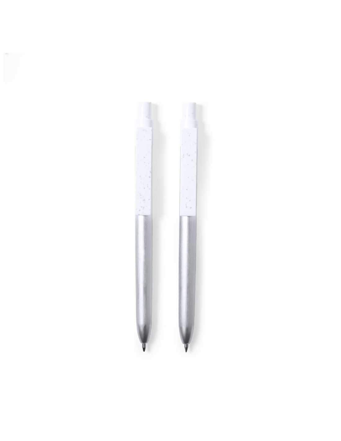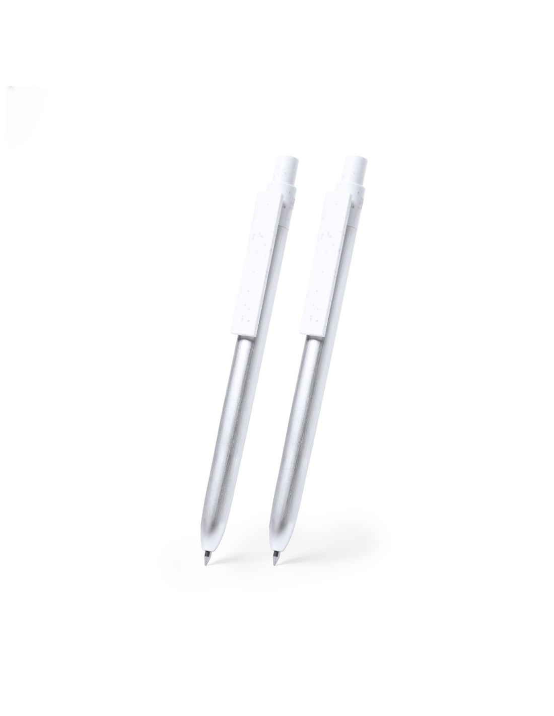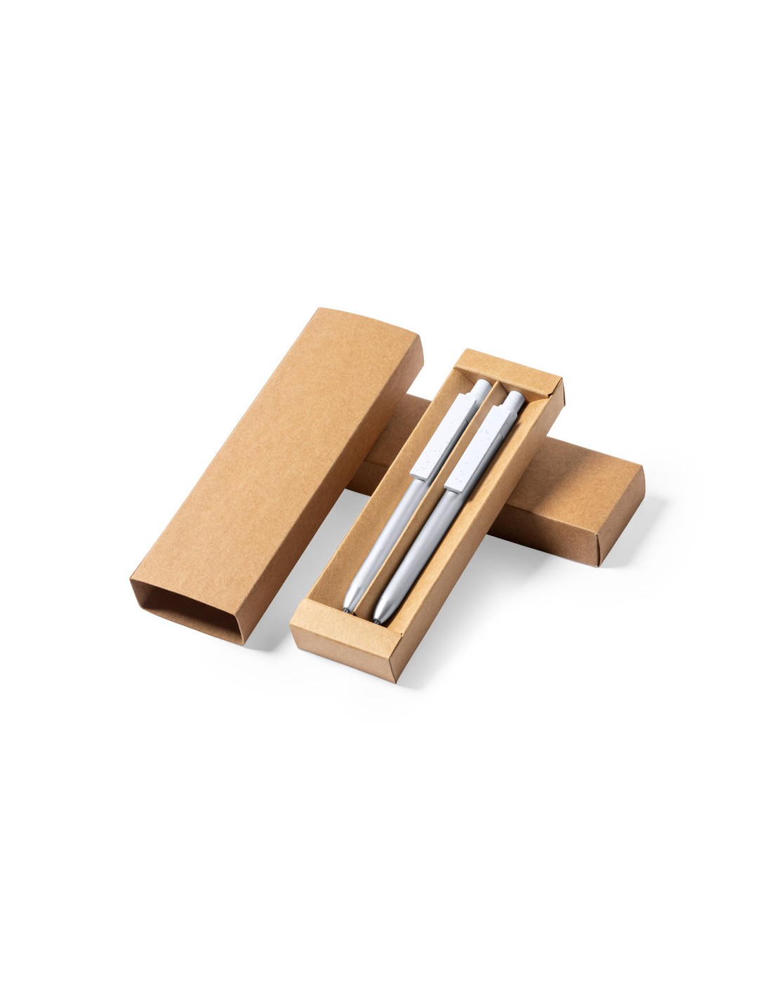 Set eco-friendly de bolígrafo y roller, fabricados en aluminio reciclado y con detalles en ABS reciclado (RABS). Incluye: Bolígrafo en aluminio reciclado de mecanismo pulsador, con cuerpo en color plateado y accesorios en blanco. Con distintivo aluminio reciclado en la parte superior del bolígrafo, cartucho jumbo y tinta azul. Roller en aluminio reciclado de mecanismo pulsador, con cuerpo en color plateado y accesorios en blanco. Con distintivo aluminio reciclado en la parte superior del roller, cartucho jumbo y tinta azul.Set presentado en estuche individual de diseño kraft con funda a juego.El origen del aluminio reciclado se encuentra en la reutilización casi infinita de uno de los materiales con mayor potencial de reciclabilidad sin perder sus propiedades. Esta característica lo convierte en un material eco-friendly de origen reciclado, fácilmente reciclable y de cuyos procesos de tratamiento y desechos para la obtención del material se pueden obtener nuevos recursos reutilizables, consumiendo menos energía en su fabricación, entre otros factores de sostenibilidad.Certificación GRS (Global Recycled Standard / Estándar de Reciclaje Global), que garantiza el origen reciclado del material usado para fabricar el producto.
