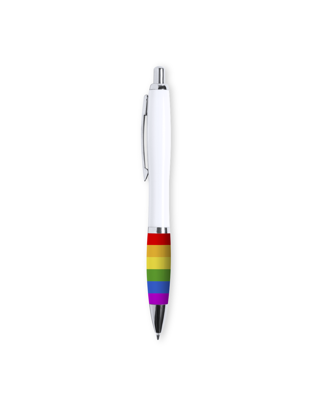 Bolígrafo Rainbow, con empuñadura multicolor y cuerpo en acabado blanco. De mecanismo pulsador, con clip metálico y accesorios cromados. Todo un orgullo de bolígrafo, en tinta azul.