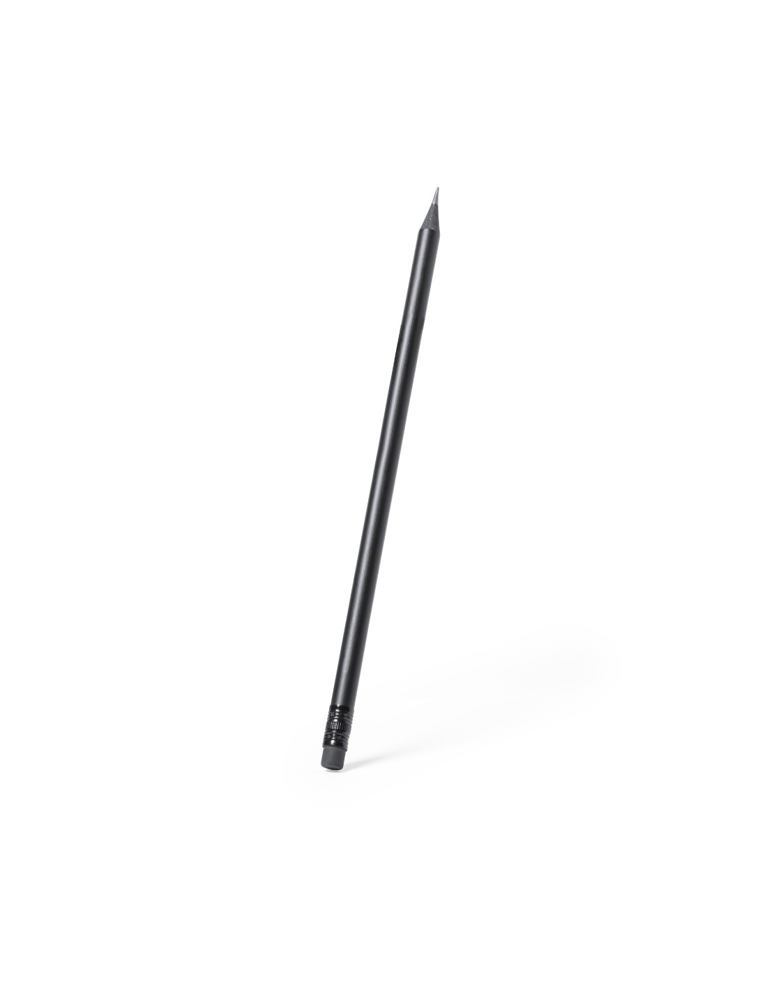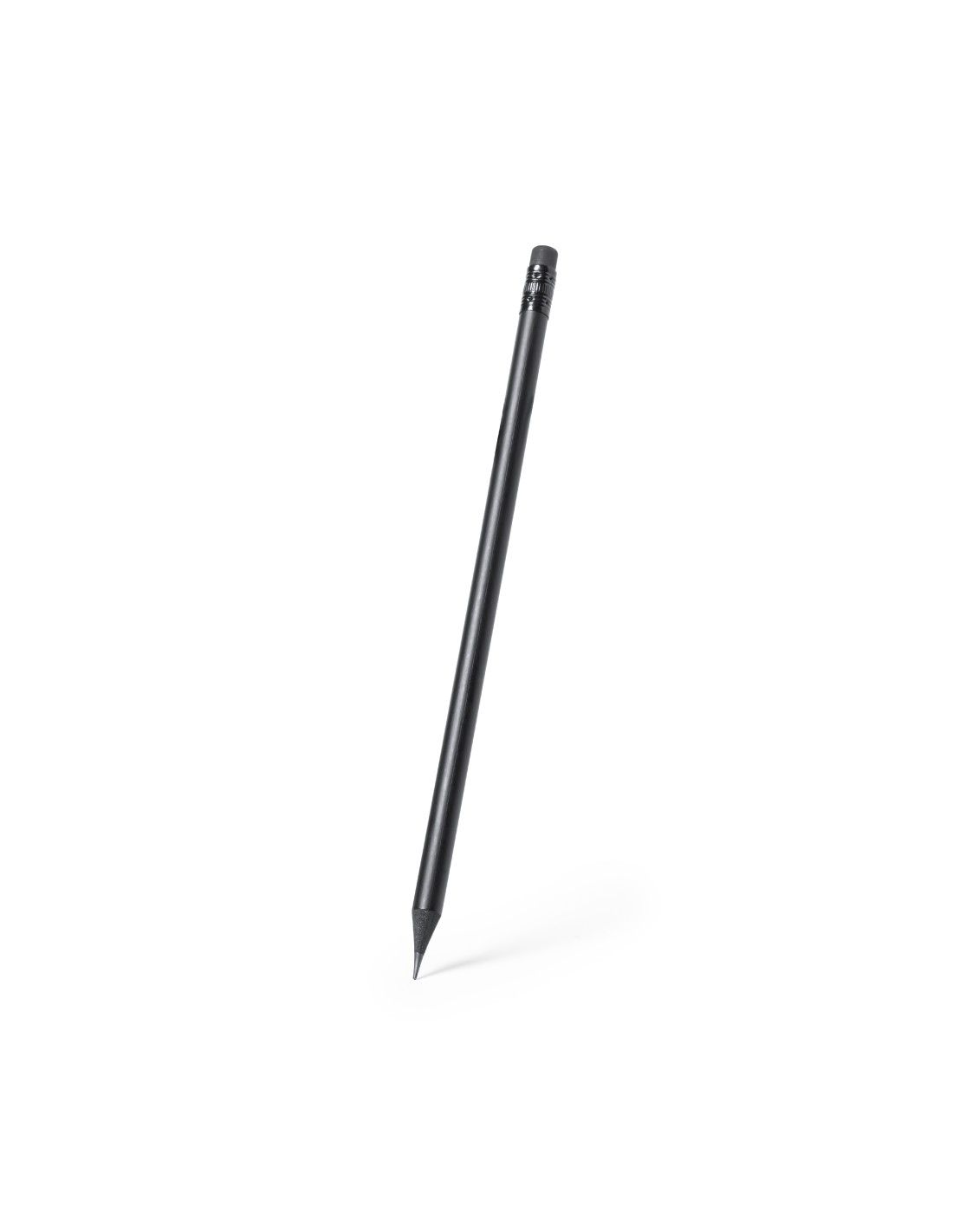 Lápiz de madera natural en acabado negro mate. Con goma de borrar, mina negra y punta afilada.