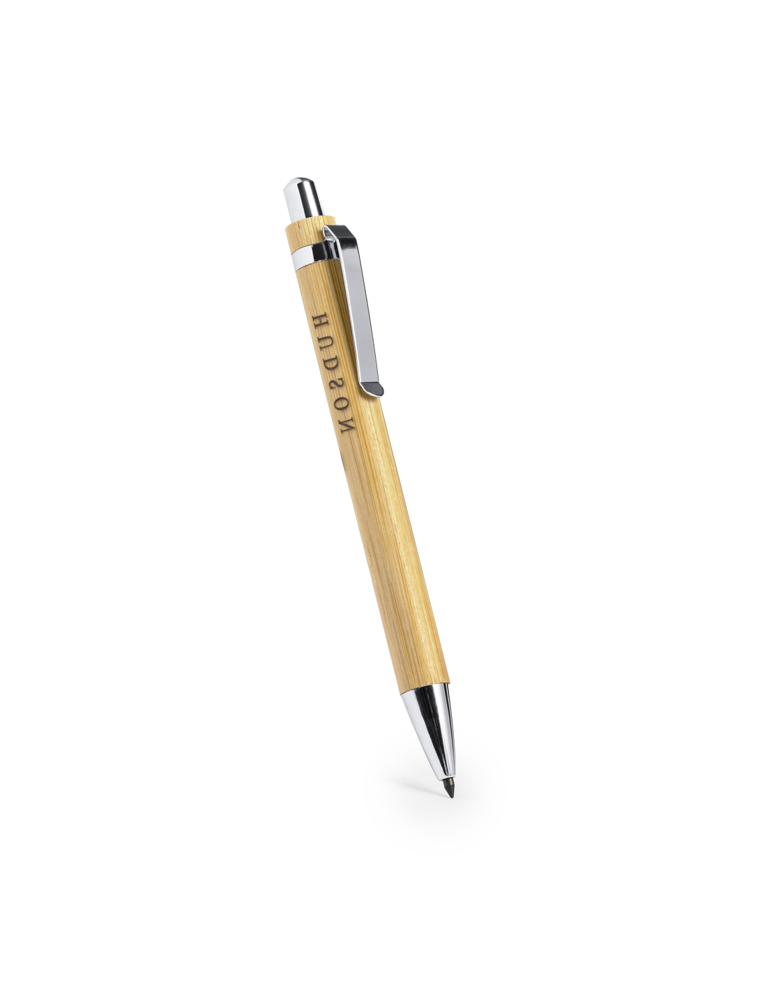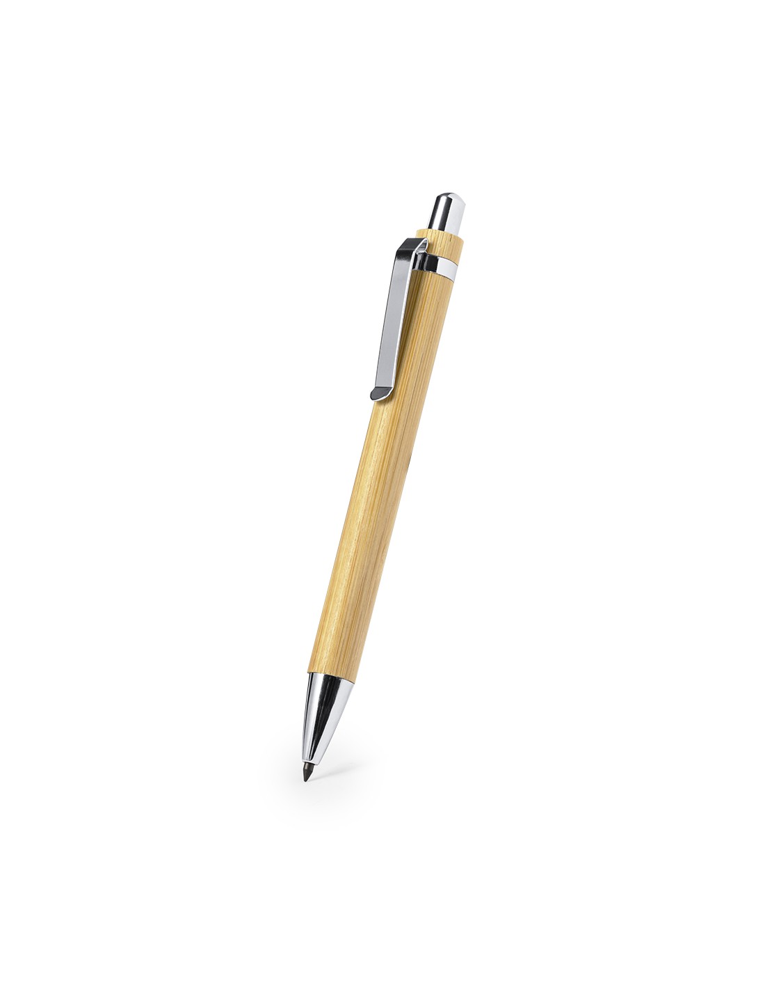 Lápiz eterno fabricado en bambú y accesorios cromados. Reutilizable y con escritura infinita, para así usar siempre el mismo lápiz y no generar residuos. Materiales como el bambú fomentan la utilización de materias primas naturales reduciendo las emisiones contaminantes. Además, el bambú proviene de una planta de gran resistencia y versatilidad, con crecimiento y regeneración rápida, siendo una excelente alternativa al uso de madera tradicional.