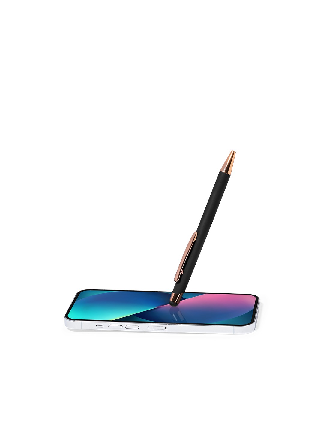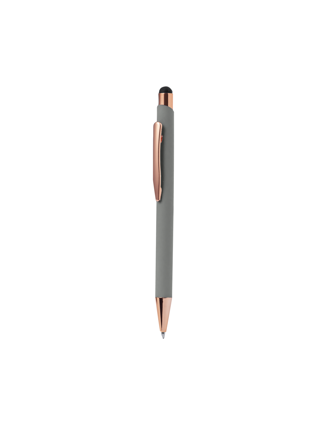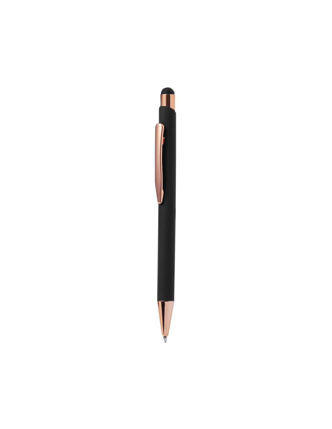Bolígrafo puntero de tacto goma especialmente diseñado para el marcaje en láser con logotipo en color rosado. De mecanismo pulsador, con clip metálico y accesorios en acabado cobre. Cuerpo disponible en 4 distinguidos colores, de cartucho jumbo y en tinta azul.Presentado en elegante caja de diseño negra.