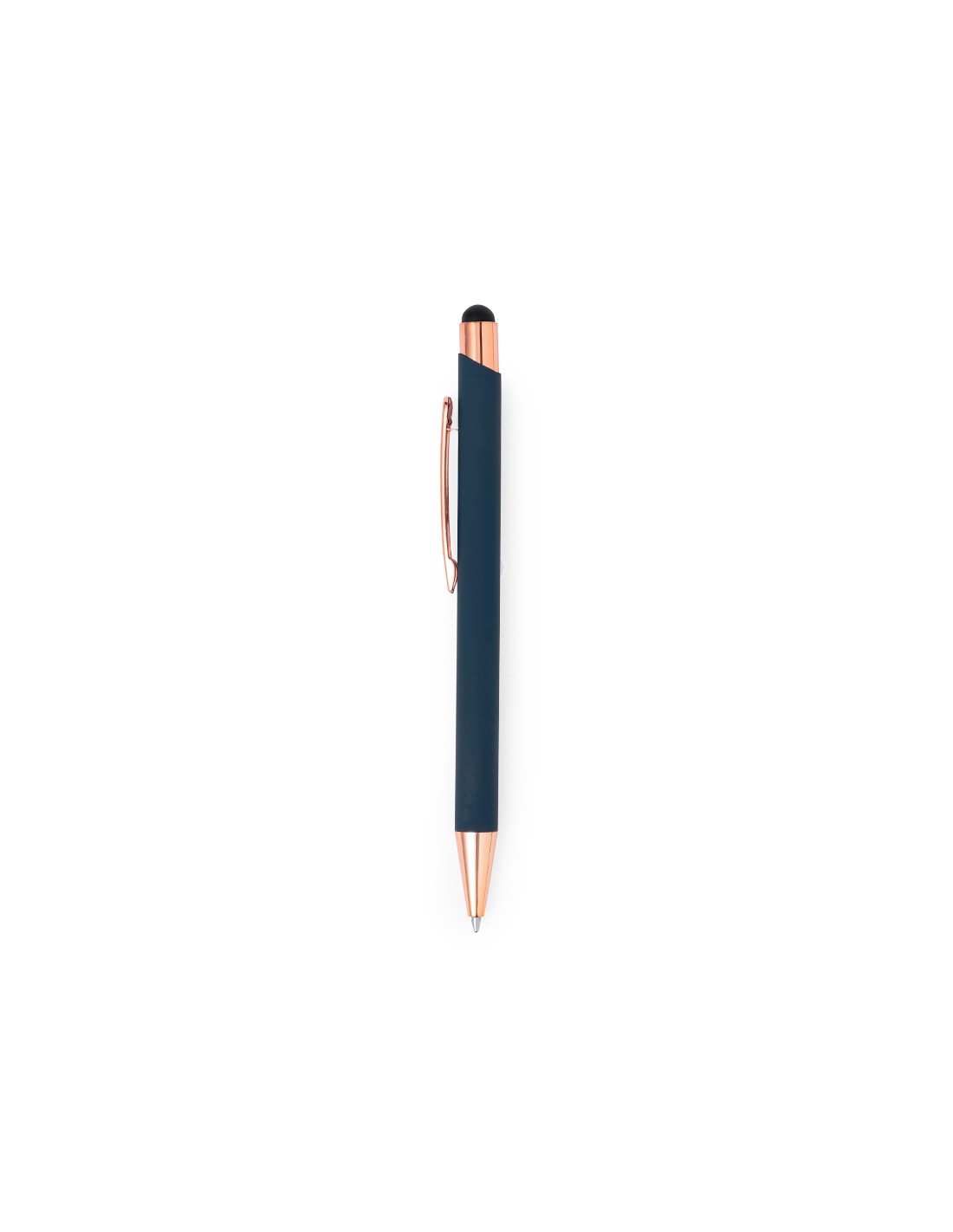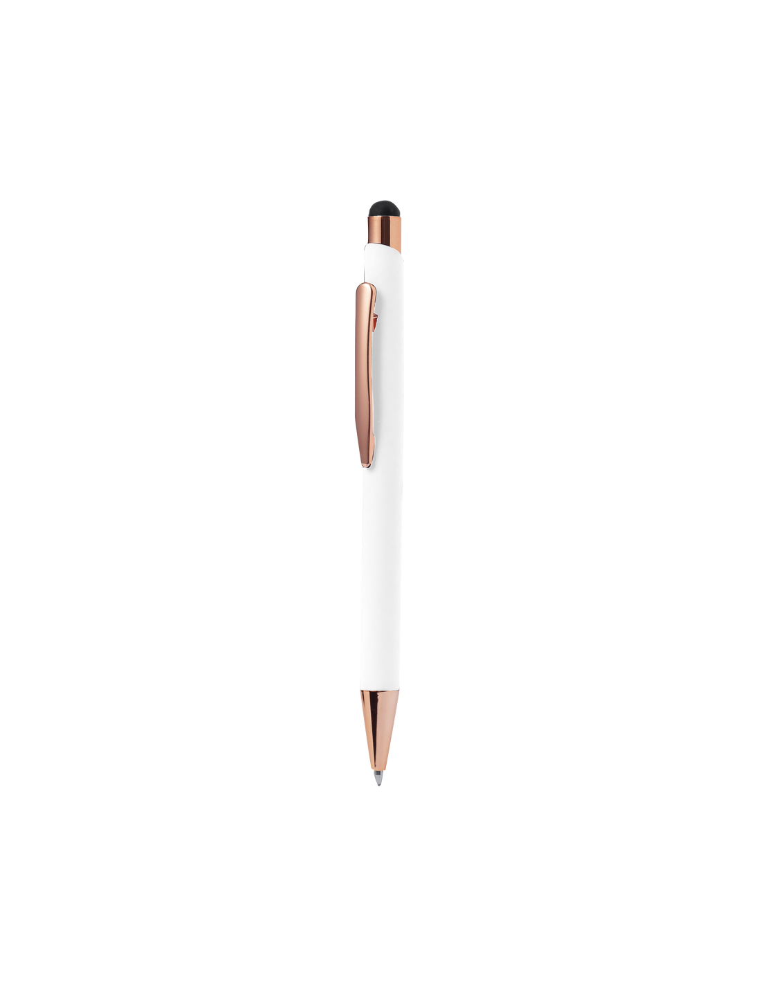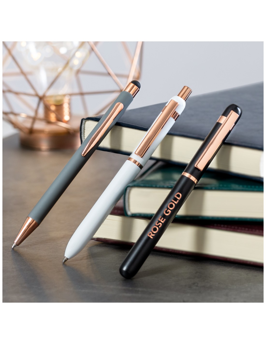 Bolígrafo puntero de tacto goma especialmente diseñado para el marcaje en láser con logotipo en color rosado. De mecanismo pulsador, con clip metálico y accesorios en acabado cobre. Cuerpo disponible en 4 distinguidos colores, de cartucho jumbo y en tinta azul.Presentado en elegante caja de diseño negra.
