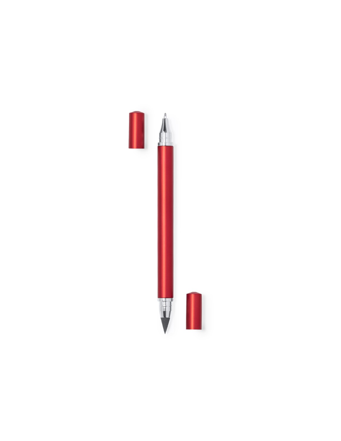 Bolígrafo lápiz eterno 2 en 1. Con cierre de capucha, incluye bolígrafo en un extremo (carga jumbo y tinta azul), y lápiz eterno en el otro extremo, para así usar siempre el mismo lápiz y no generar residuos. Cuerpo en resistente ABS de acabado metalizado. Disponible en amplia gama de colores.