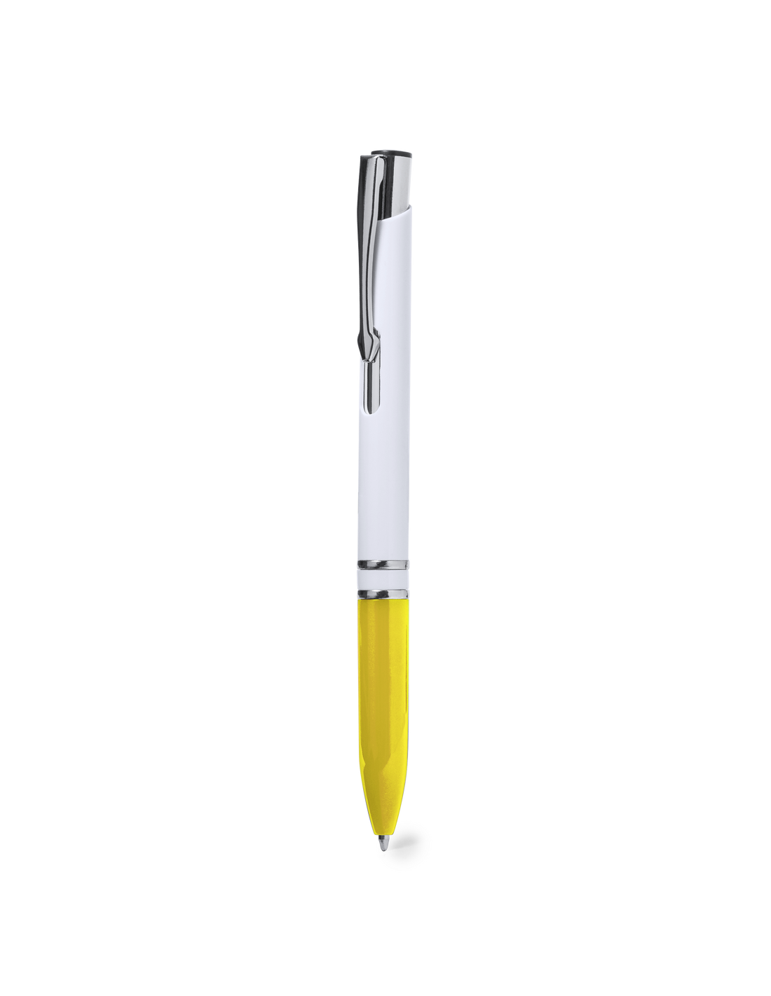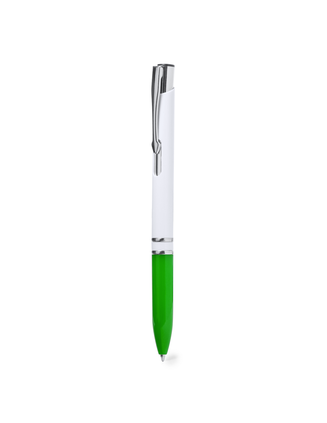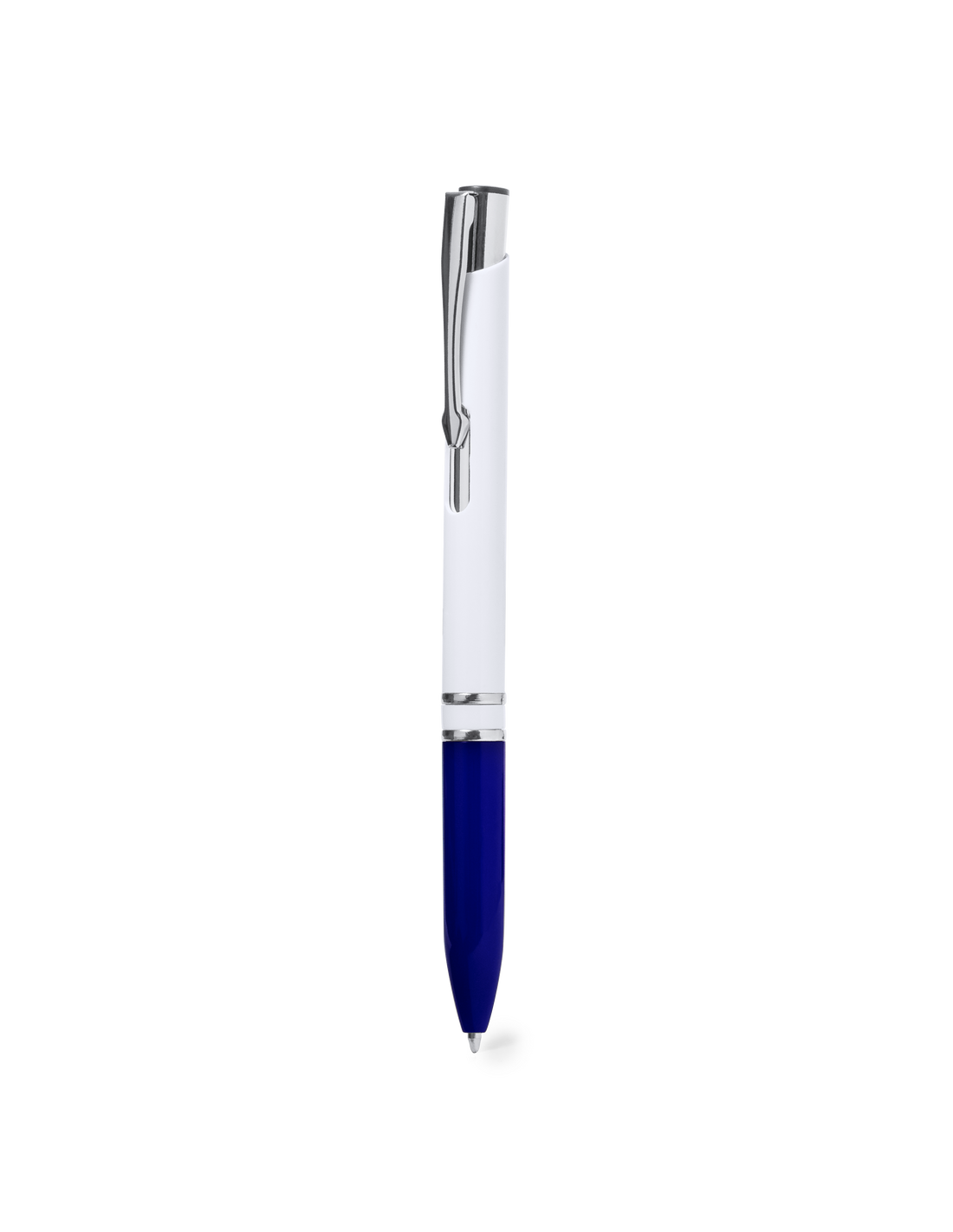 Elegante bolígrafo con mecanismo pulsador. Con cuerpo acabado en color blanco brillo y empuñadura en variada gama colores. Fabricado en resistente ABS acabado brillo. Con carga jumbo y tinta azul.