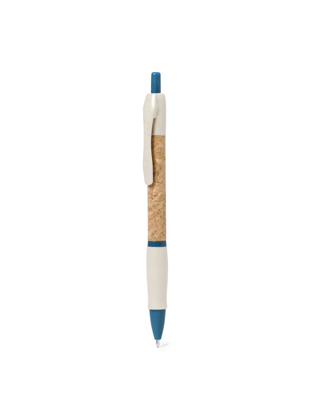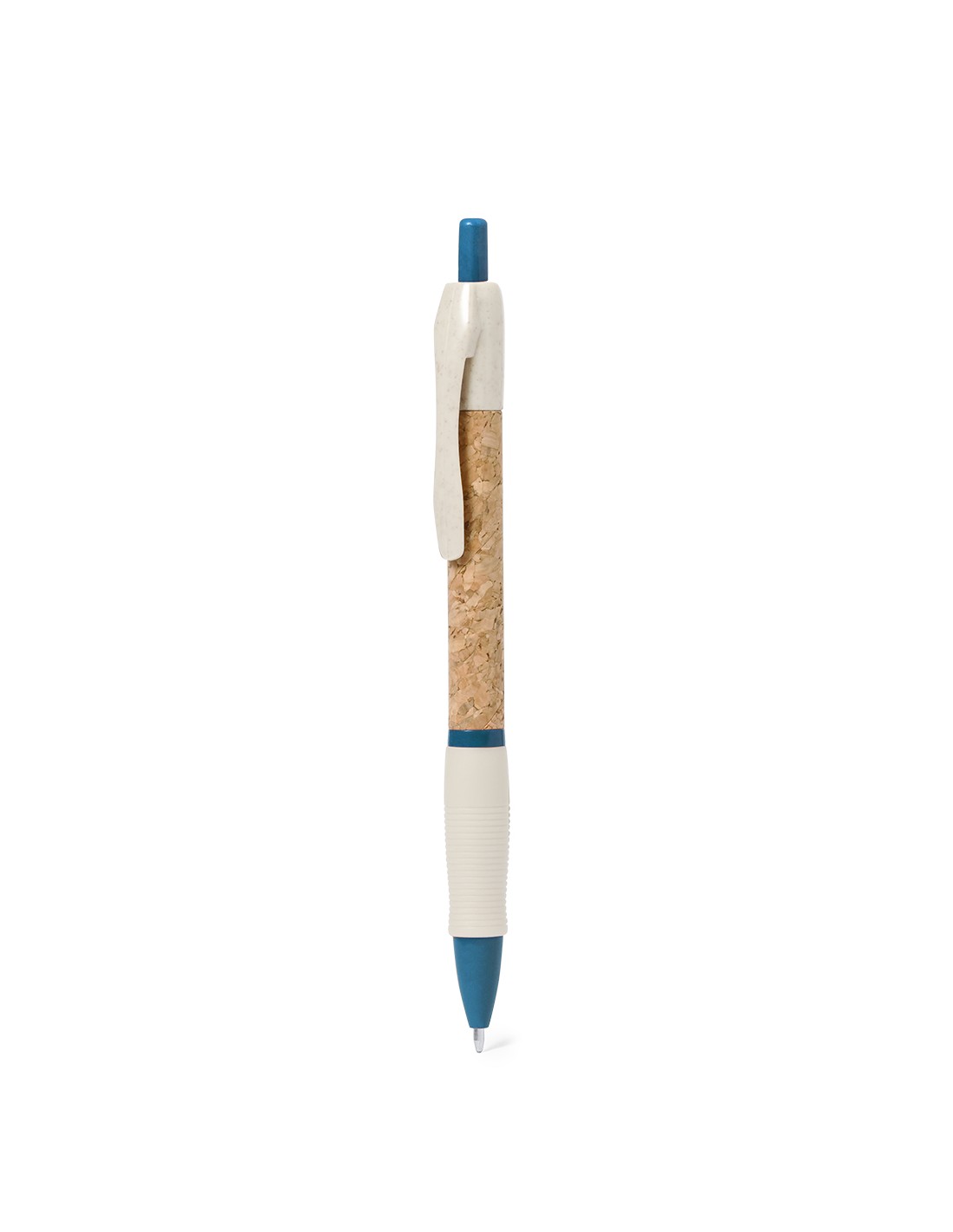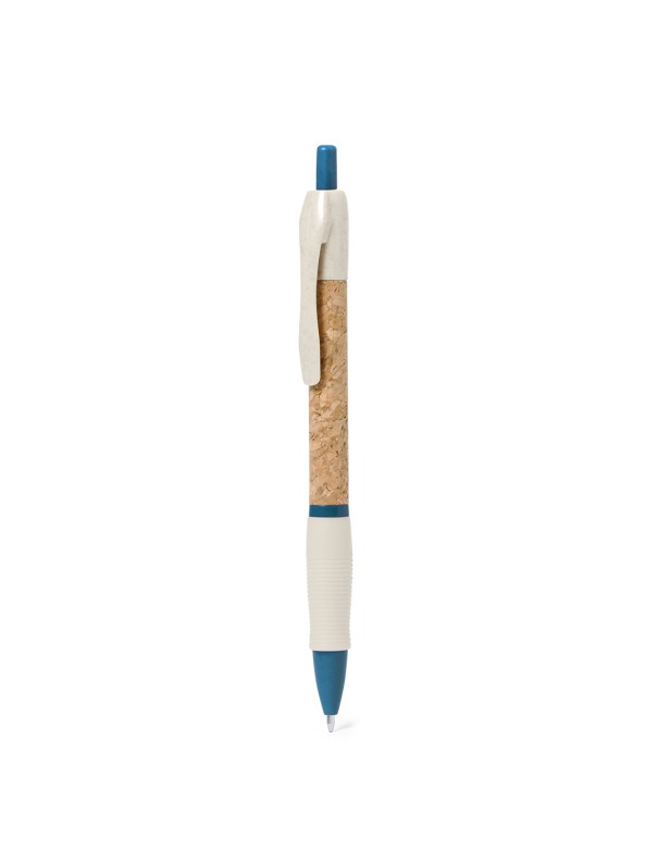 Bolígrafo de mecanismo pulsador con cuerpo en corcho natural. Clip, punta y pulsador en caña de trigo. Disponible en variada gama de colores. Distintivo Wheat Straw en la parte superior del bolígrafo. En tinta azul.Elaborado con elementos vegetales, para así fomentar la utilización de materias primas naturales y reducir las emisiones contaminantes.