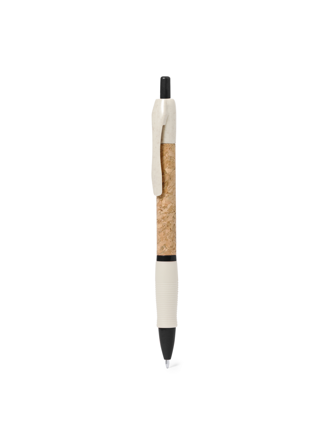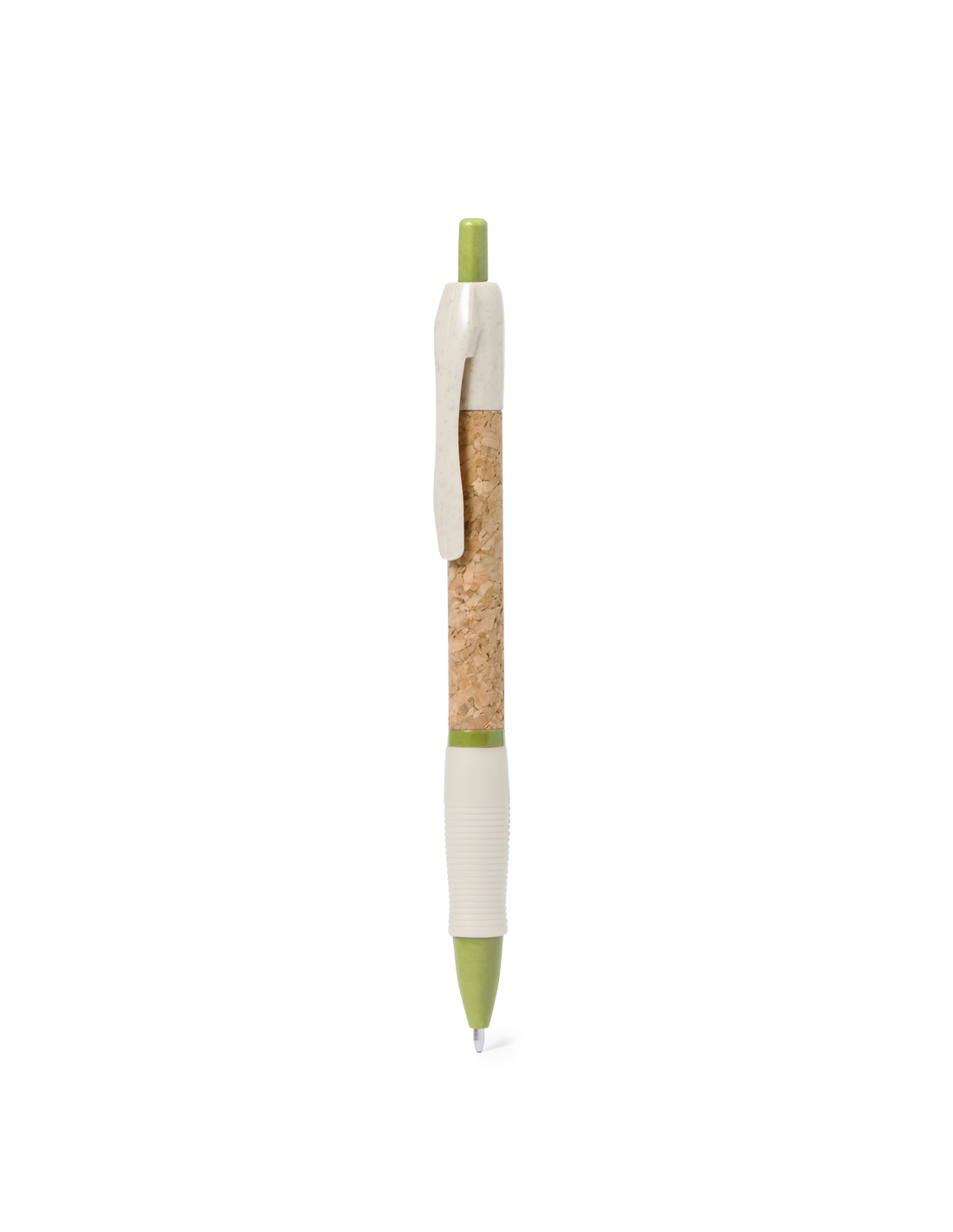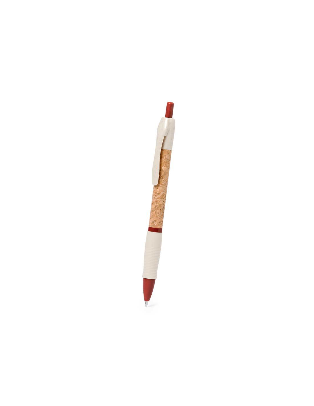 Bolígrafo de mecanismo pulsador con cuerpo en corcho natural. Clip, punta y pulsador en caña de trigo. Disponible en variada gama de colores. Distintivo Wheat Straw en la parte superior del bolígrafo. En tinta azul.Elaborado con elementos vegetales, para así fomentar la utilización de materias primas naturales y reducir las emisiones contaminantes.