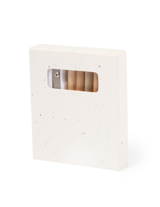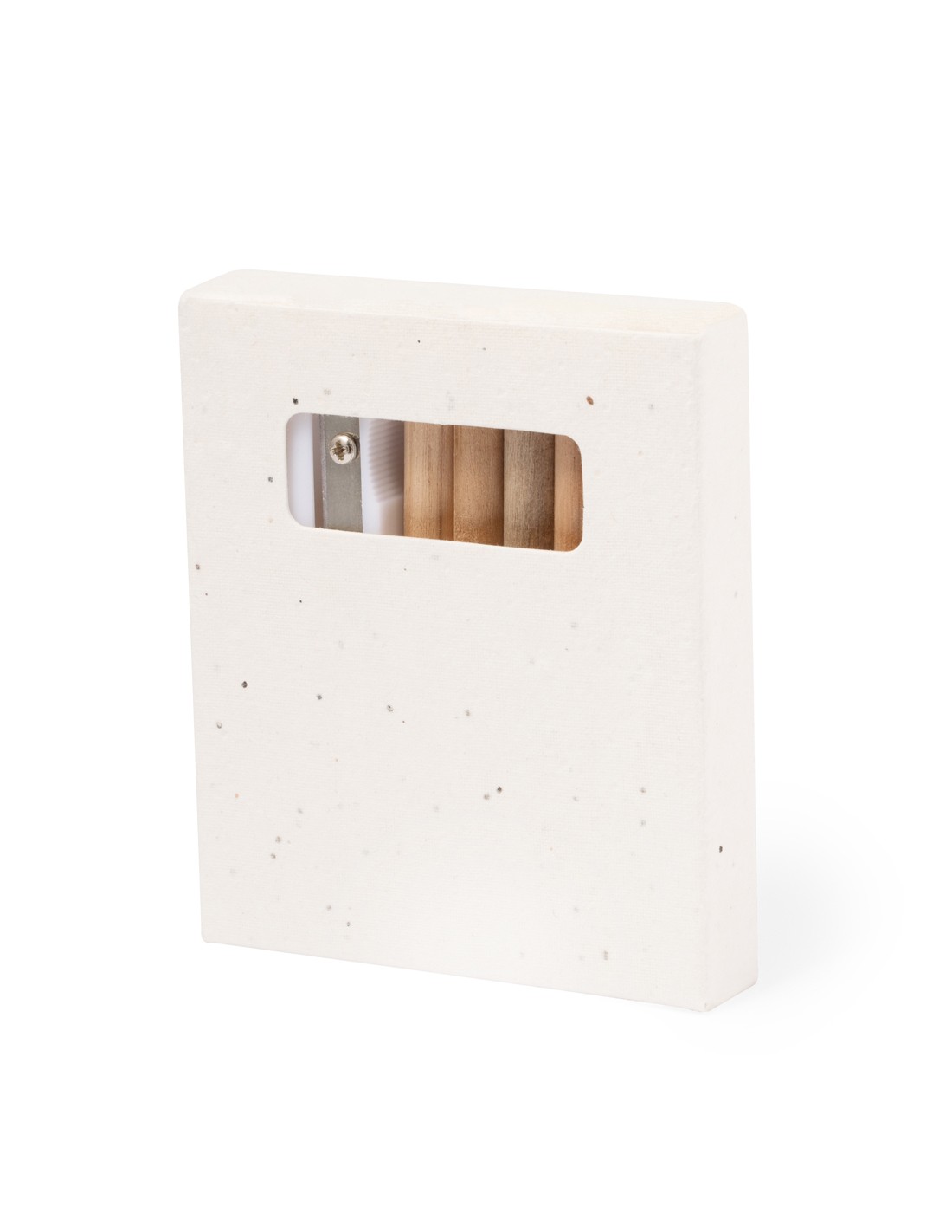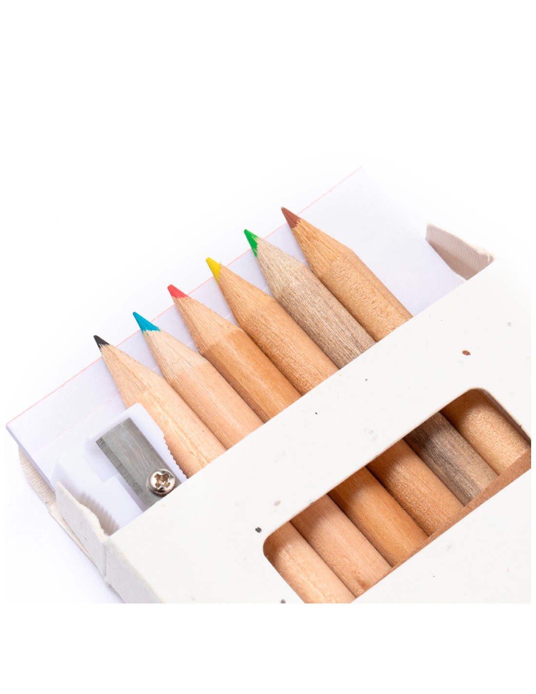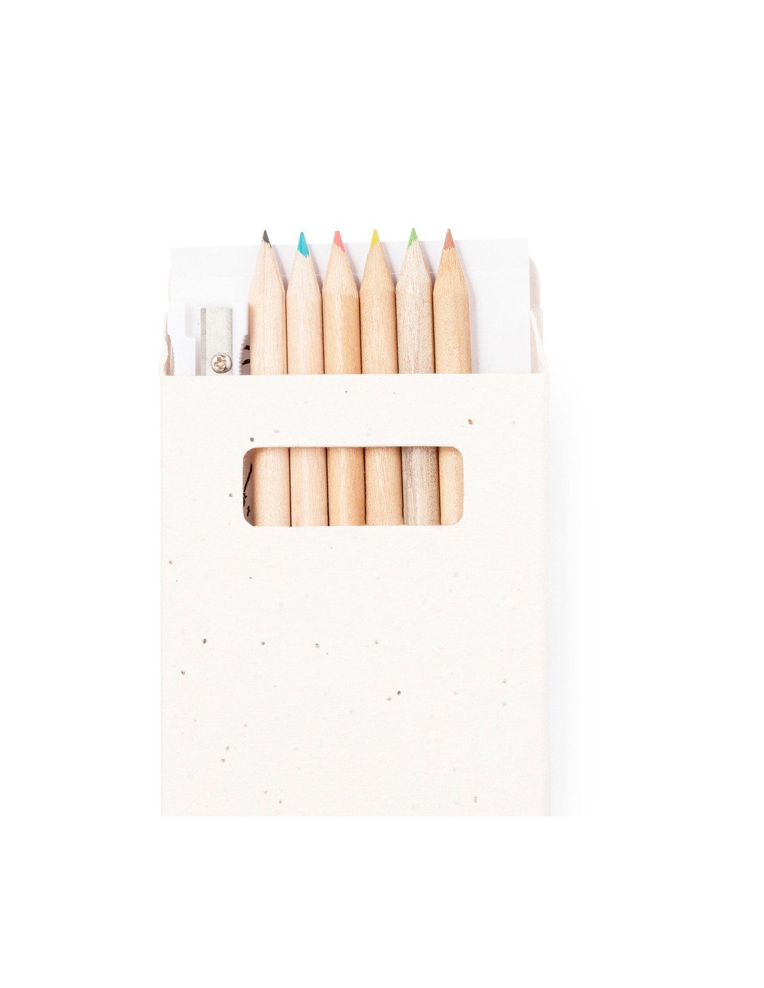 Set de 6 lápices con plantillas para colorear y sacapuntas, presentado en caja de cartón natural con semillas. Lápices de madera con cuerpo redondo de acabado natural y minas en variada gama de colores. Incluye semillas de petunia en la caja, convirtiéndolo así en cartón plantable al final de su vida útil. Flores en colores surtidos, con instrucciones de plantado en la cubierta trasera.
