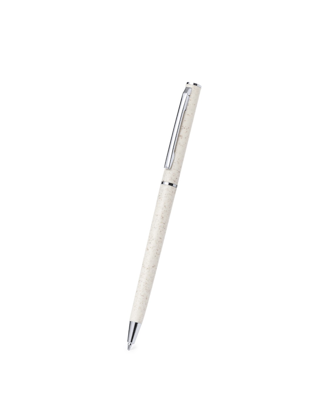Bolígrafo con cuerpo en caña de trigo. Clip metálico y accesorios cromados. De mecanismo giratorio y de tinta azul. Con logotipo caña de trigo y disponible en color nature.La caña de trigo fomenta la utilización de materias primas naturales, reduciendo así las emisiones contaminantes.