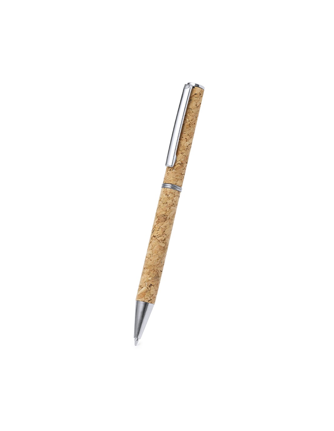 Bolígrafo con cuerpo en corcho natural. Clip metálico y accesorios cromados. De mecanismo giratorio y de tinta azul.Elaborado con elementos vegetales para así fomentar la utilización de materias primas naturales y reducir las emisiones contaminantes.