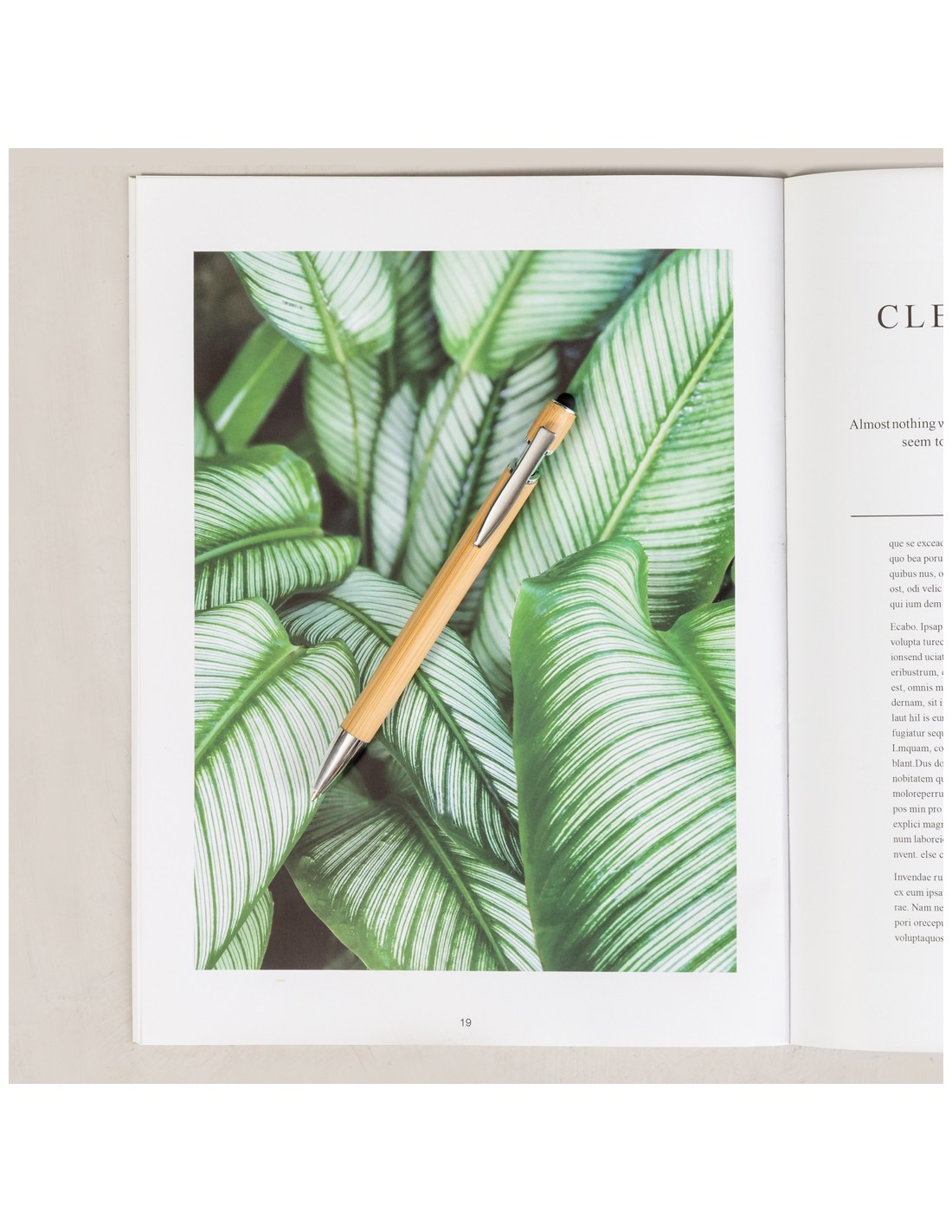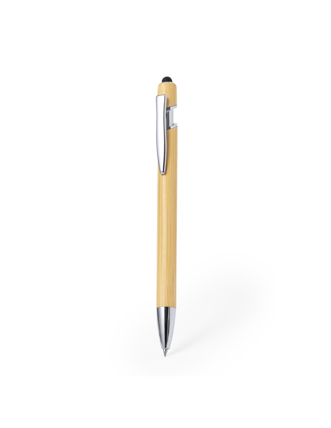 Bolígrafo puntero de mecanismo pulsador, con cuerpo en bambú, accesorios cromados y puntero en negro. Clip metálico y en tinta azul.Materiales como el bambú fomentan la utilización de materias primas naturales, reduciendo las emisiones contaminantes. Proviene de una planta de gran resistencia y versatilidad, con crecimiento y regeneración rápidos, siendo una excelente alternativa al uso de madera tradicional.