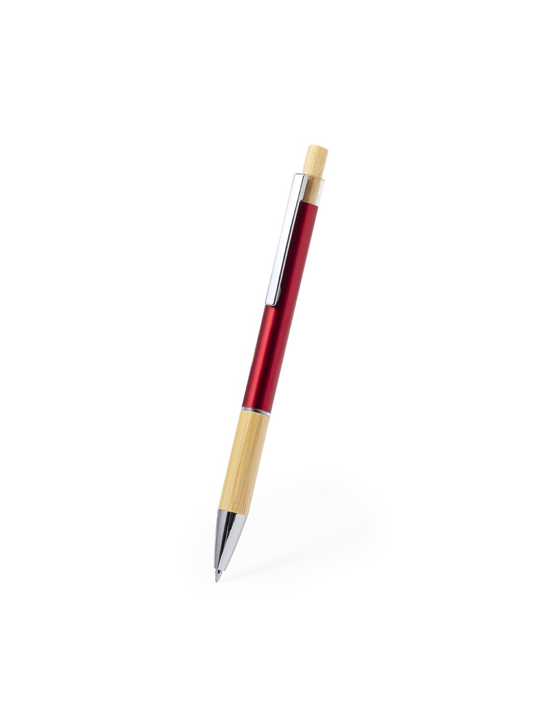 Elegante bolígrafo de bambú y aluminio con mecanismo pulsador. Cuerpo en resistente aluminio de acabado brillante y empuñadura en bambú, con la caña en una amplia gama de distintivos colores. Clip metálico, con pulsador de bambú retráctil y en tinta azul. Presentado en bolsa individual reciclada.Materiales como el bambú fomentan la utilización de materias primas naturales, reduciendo las emisiones contaminantes. Proviene de una planta de gran resistencia y versatilidad, con crecimiento y regeneración rápidos, siendo una excelente alternativa al uso de madera tradicional.