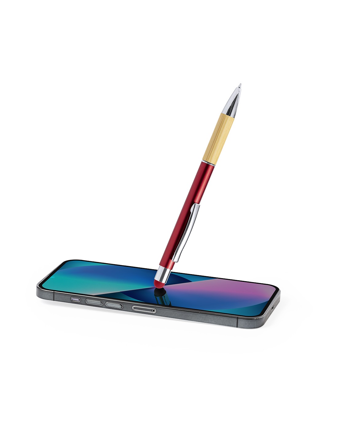 Elegante bolígrafo puntero de bambú y aluminio con mecanismo giratorio. Cuerpo en resistente aluminio de acabado brillante y empuñadura en bambú, con la caña en una amplia gama de distintivos colores y puntero en la parte superor a juego. Clip metálico y en tinta azul. Presentado en bolsa individual reciclada.Materiales como el bambú fomentan la utilización de materias primas naturales, reduciendo las emisiones contaminantes. Proviene de una planta de gran resistencia y versatilidad, con crecimiento y regeneración rápidos, siendo una excelente alternativa al uso de madera tradicional.