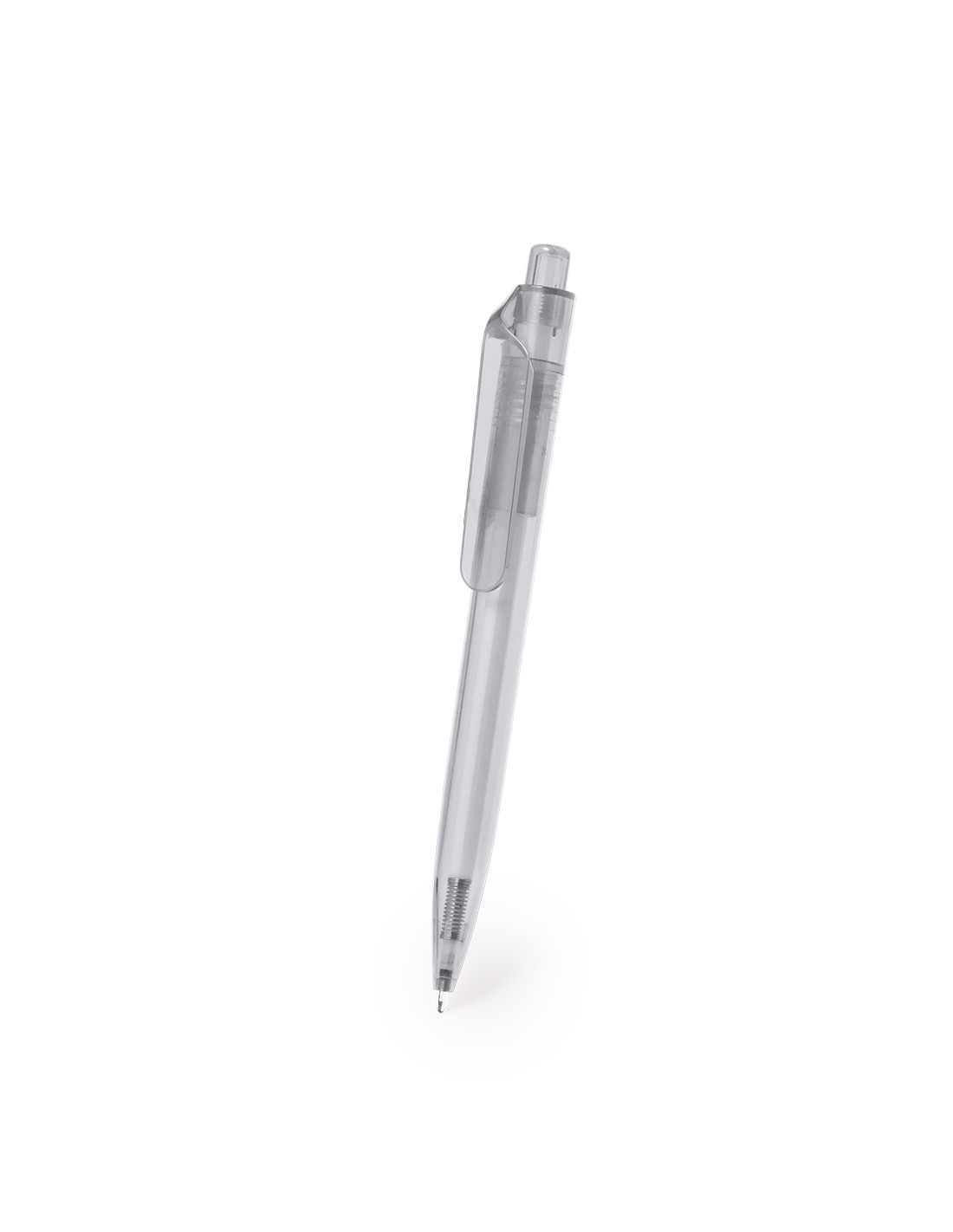 Bolígrafo de mecanismo pulsador fabricado en RPET. Cuerpo de suave acabado en variados colores transparentes y clip amplio. Logotipo RPET en la parte superior del bolígrafo, en tinta azul.El material RPET se elabora a partir de plástico reciclado, para así fomentar la reutilización de residuos plásticos y ayudar a la sostenibilidad del planeta.