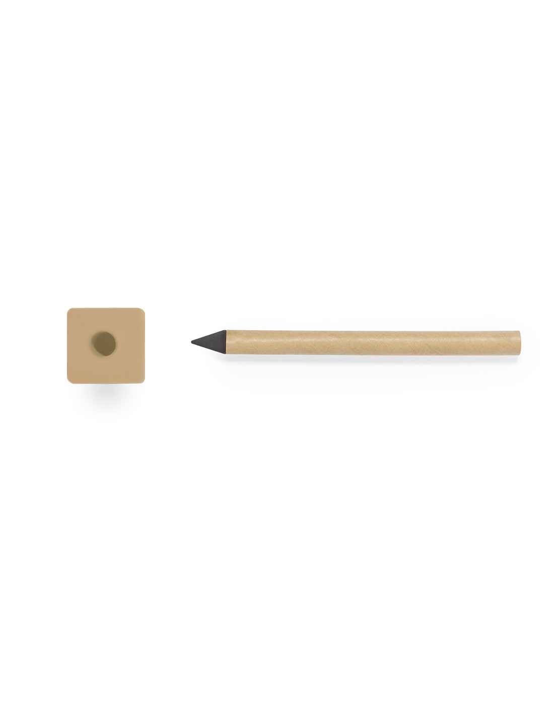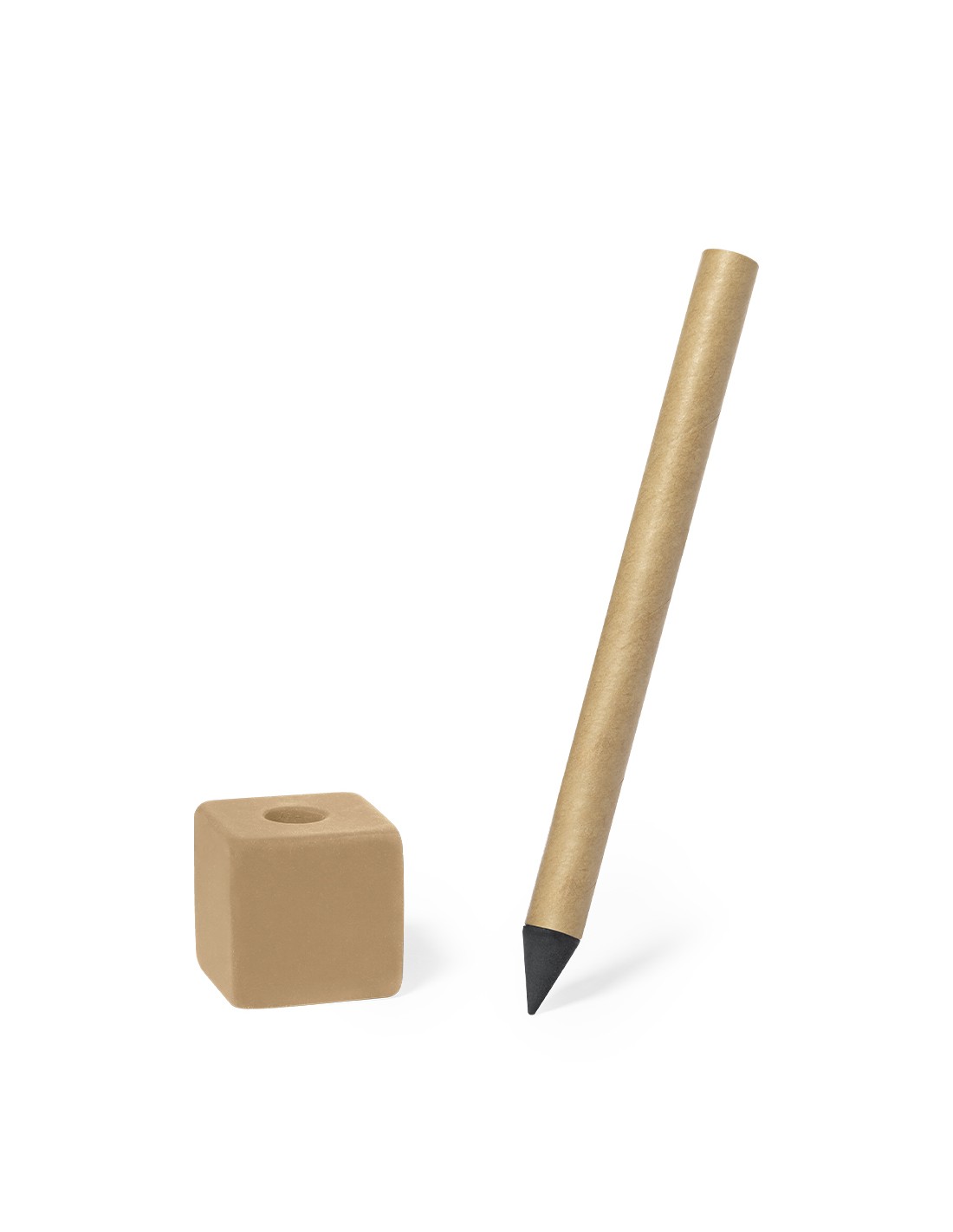 Lápiz eterno fabricado en cartón reciclado con soporte incluido. Práctico instrumento de escritura infinita gracias a su punta que no se desgasta. Con práctica goma de borrar en forma de cubo. Set diseñado en color natural y negro. Presentado individualmente en una caja kraft.