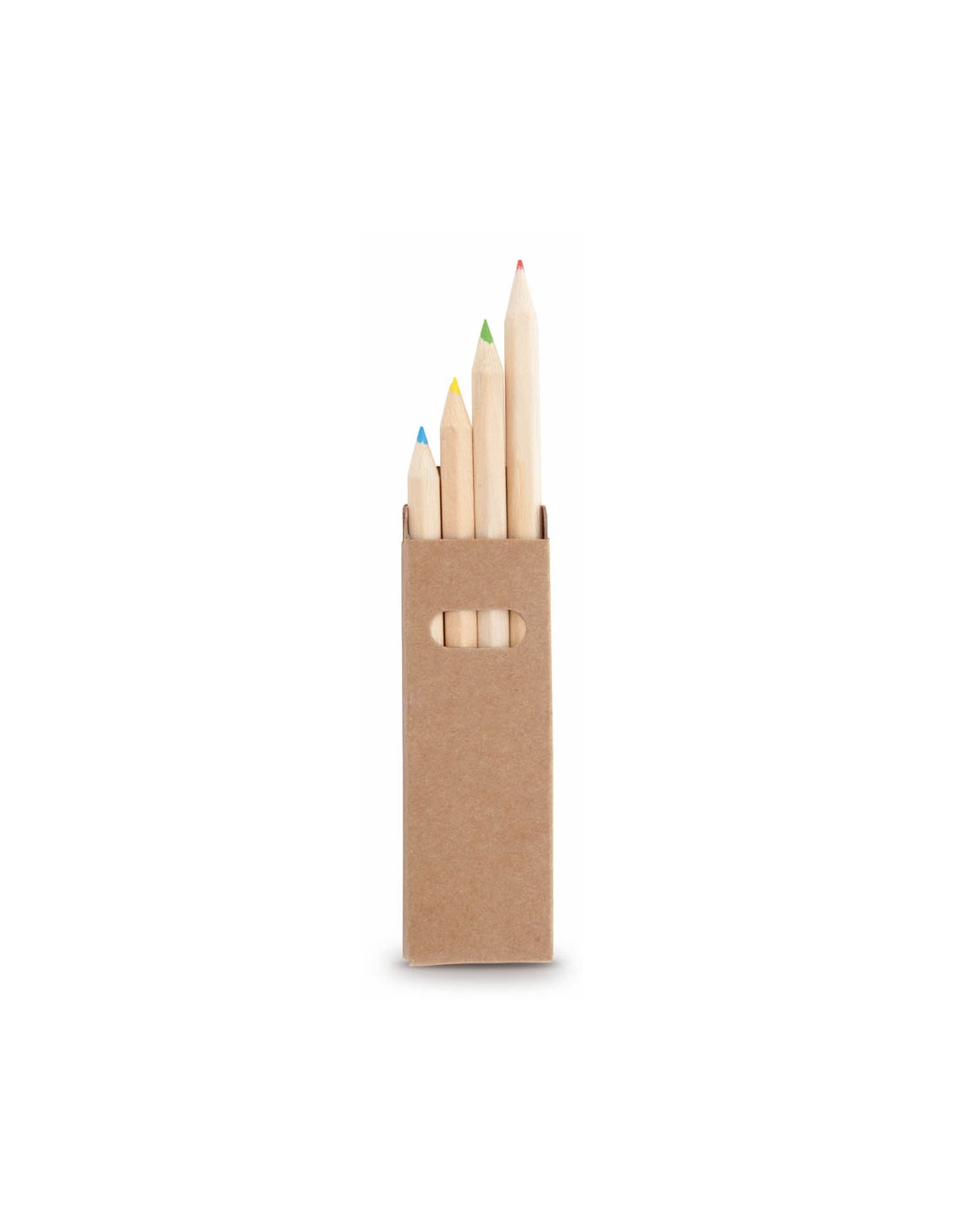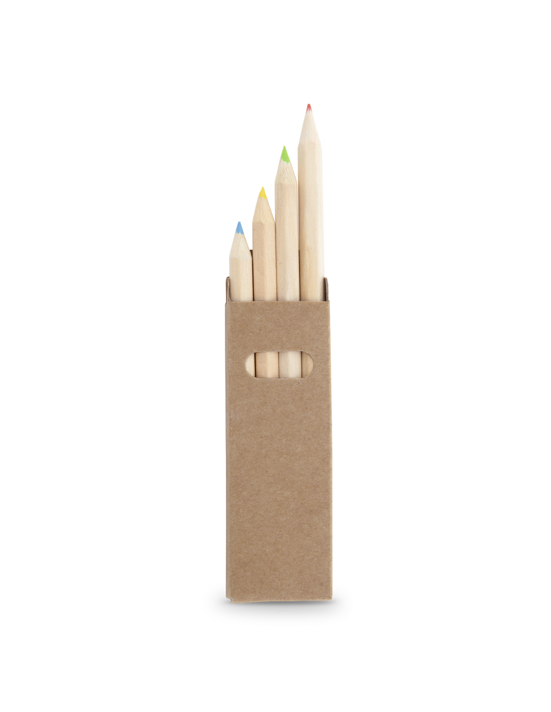 Caja de línea nature con 4 lápices de madera de cuerpo hexagonal. Con minas en color azul, amarillo, verde y rojo. Presentados en caja individual de cartón kraft con ventana.